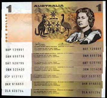 523 1968 Phillips-Randall (R 303) (4), 1972 Phillips-Wheeler (R 304) (3), 1989 Fraser-Higgins (R 312), 1991 Fraser-Cole (R 313a) (8). Most well circulated. (16 notes total). VG-aVF $360 - $380 Start Price $180 524 1972 Phillips-Wheeler (R 304). Commonwealth. Light bend, flick. Consecutive trio. aUNC