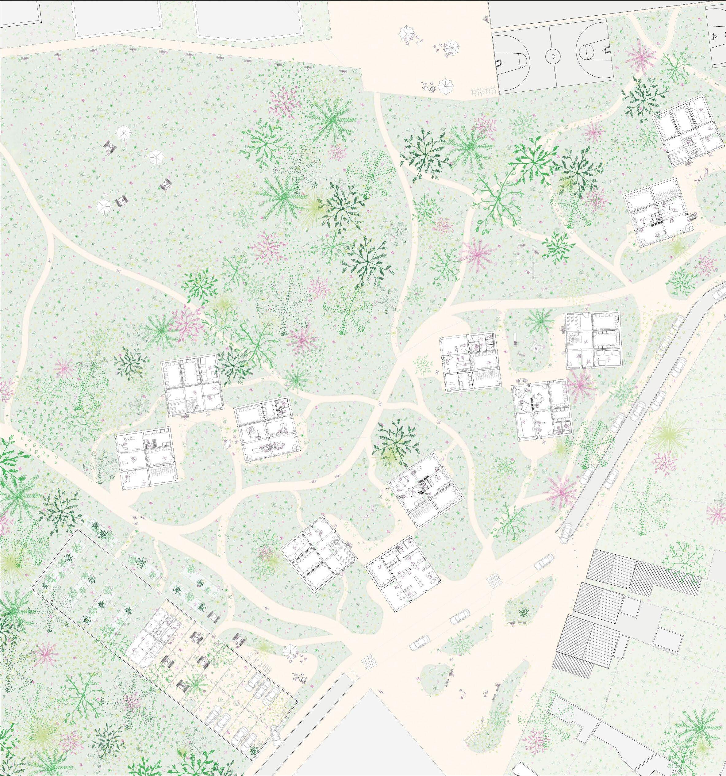 Une partie de la tâche consistait à concevoir une structure de parking souterrain, afin que le développement principal reste convivial pour les piétons. Il est possible de le transformer en différentes fonctions à l'avenir, comme des ateliers, des centres communautaires.
