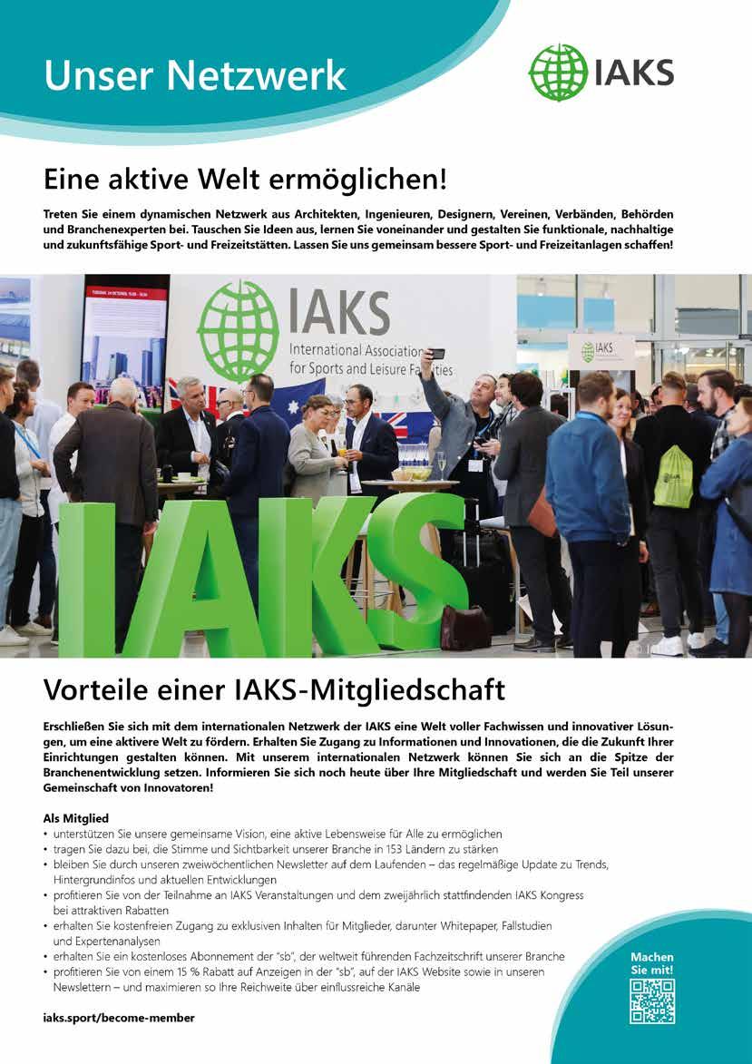 Ihr Beitrag in sb, auf der IAKS-Website und im IAKS-Newsletter Präsentieren Sie Ihr Unternehmen, Ihre Produkte und Referenzprojekte in bis zu drei halbseitigen Beiträgen pro Jahr in sb. Präsentieren Sie Ihre Innovationen mit aussagekräftigem Bildmaterial und überzeugenden Inhalten. Ihre Beiträge werden auch auf der IAKS-Website und im IAKS-Newsletter präsentiert, ohne dass zusätzliche Kosten entstehen.