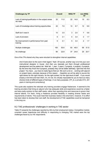 One of the TPs shared why they were reluctant to strengthen internal capabilities: And it boils down to the cost in that regard. Yeah. Of course, another way is to hire your own instructional designer in house. And then you basically put them through professional development and be patient lah. Wait lah. 1 year, 2 years, 2 projects, 4 projects, 6 projects. By the time they finish the 6 projects, probably they will be better definitely, right than the first project. You have... you have to really figure that out. We work a lot on... working with adjunct on project basis, precisely because of this reason… Hopefully we will be able to source the right trainer for the right industry, for the right context, for the right level of staff... If you would employ a full time and train them, it's, it's not, it's virtually impossible for you to have so many diverse kinds of different types of trainings. In so many purposes. [TP_Q, a private ATO, 25+ years in training and consultancy] This quote also explains the rationale why training providers engage freelancers. It seemed to the training providers that hiring an adjunct who has adequate skills and experience would be a faster and less-costly solution to their staff needs, rather than spending time and resources to groom their internal talents. For them, hiring a freelance provides flexibility in meeting diverse needs and requirements of clients. This could meet their business needs in the short term, however, if no effort has been taken to develop their own staff, the development of TAE capabilities could be hampered in the long run.