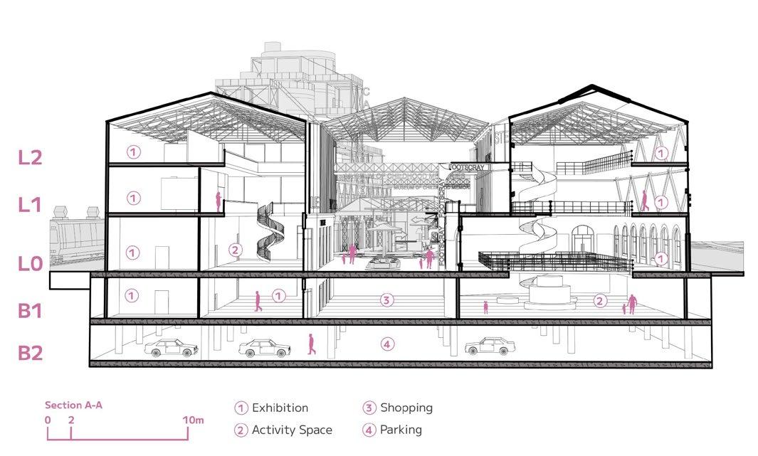 The museum’s massing reflects the fine-grain scale of the surrounding suburban neighborhood, while its form is inspired by a child’s perception of the industrial western suburbs. Drawing on diverse industrial building typologies as thematic landmarks, the design creates a dynamic narrative that bridges history and imagination.