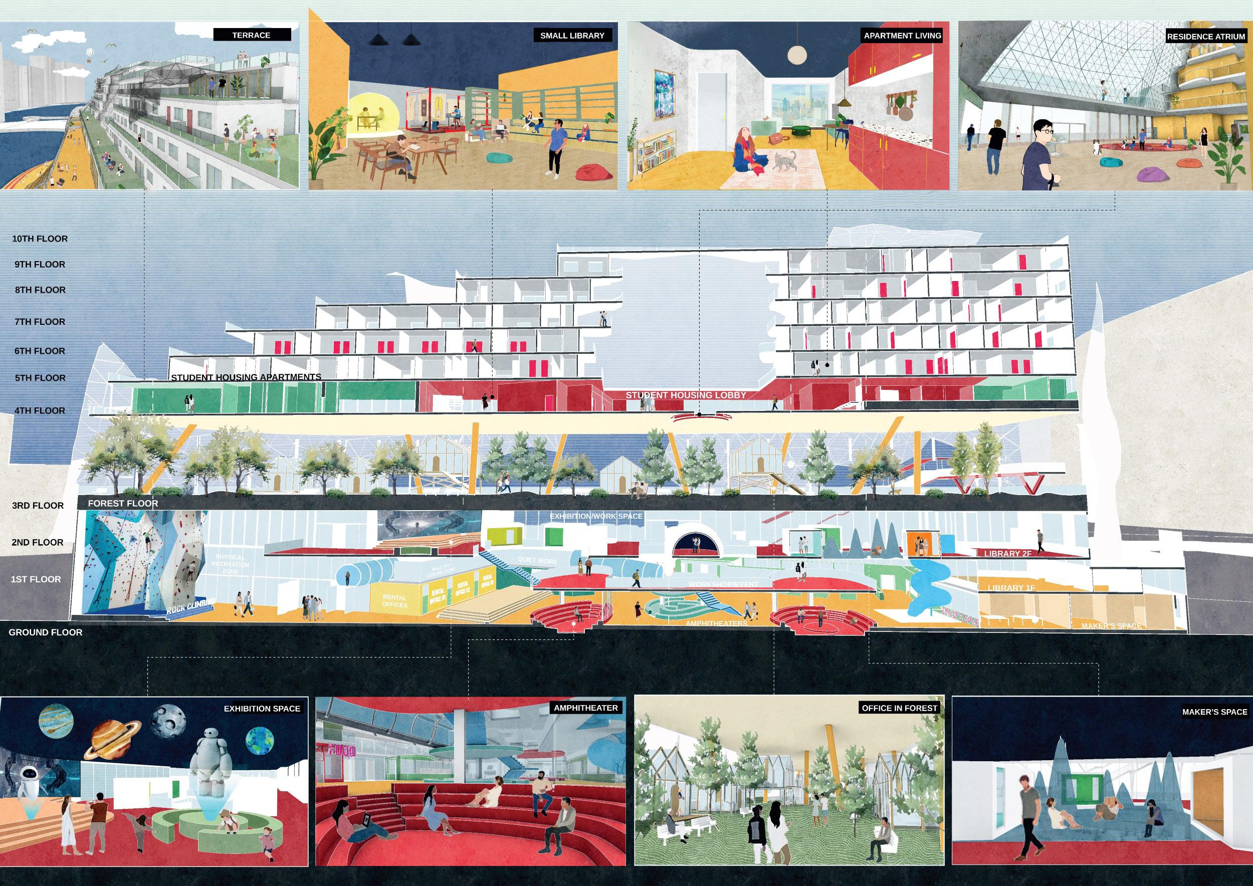 With many schools and offices nearby but few student-friendly workspaces, Nexus Network bridges this gap through playful, flexible environments for making, studying, and collaboration. Circulation feels like a giant playground, merging LIVE, WORK, and PLAY to connect students and professionals, easing stress and sparking creativity.