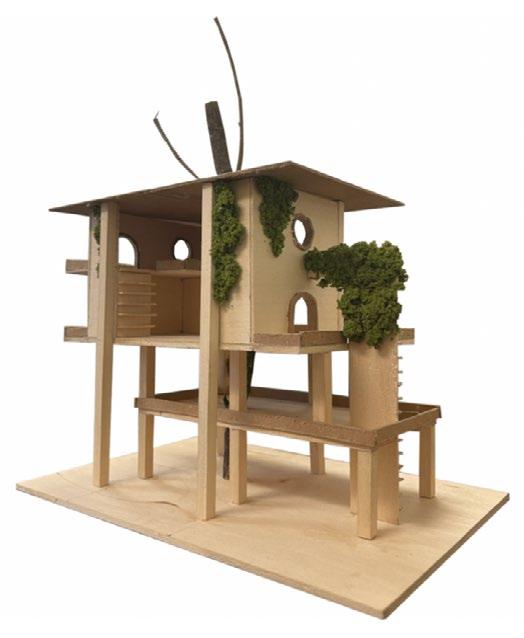 Treehouses in pop culture are seen as smaller, backyard shelters for kids to play in. In a wider scope, treehouses can also be homes above the ground with all the basic living needs. This interpretation combines the flat plane construction of backyard treehouses with the scale and form of dwellings.