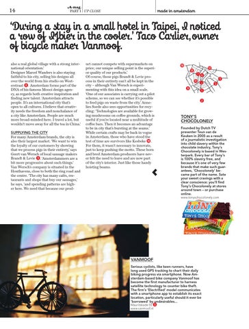 SUPPLYING THE CITY For many Amsterdam brands, the city is also their largest market. ‘We want to win the loyalty of our customers by showing that we process pigs in their entirety,’ says Geert van Wersch of local sausage makers Brandt & Levie . ‘Amsterdammers are a bit more progressive about such things.’ Van Wersch’s company is situated in the Houthavens, close to both the ring road and the centre. ‘The city has many cafés, restaurants and shops that buy our sausages,’ he says, ‘and spending patterns are higher here. We need that because our prod-