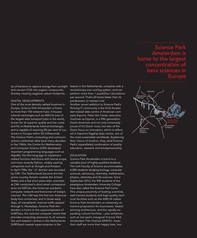 ity of bacteria to capture energy from sunlight fastest in the Netherlands, complete with a revolutionary eco-cooling system, and can and convert CO2 into organic compounds, perform more than 1 quadrillion calculations thereby creating negative carbon footprints. per second. That’s 20 times faster than its predecessor or nearest rival. DIGITAL DEVELOPMENTS Another recent addition to Science Park’s One of the most densely cabled locations in thriving IT community is the third AmsterEurope, Science Park Amsterdam is home dam-based data centre of American comto more than 150 network hubs. It houses pany Equinix. Peter Van Camp, executive internet exchanges such as AMS-IX (one of chairman at Equinix, is a fifth-generation the largest data transport hubs in the world, Dutch-American and not only immensely known for its superior quality and low costs) proud of his Dutch roots, but also of the and NL-ix (Netherlands Internet Exchange), and is capable of reaching 80 per cent of cus- Dutch focus on innovation, which is reflected in Equinix’s flagship data centre, one of tomers in Europe within 50 milliseconds. The Science Park’s computing and communi- the most sustainable worldwide. Explaining cations credentials date back many decades. their choice of location, they cited Science Park’s unparalleled combination of quality In the 1960s, the Centre for Mathematics education, research and entrepreneurship. and Computer Science (CWI) developed important programming languages such as EDUCATION Algol60, the first language to implement nested function definitions with lexical scope, Science Park Amsterdam is home to a valuable pool of highly-qualified students. and more recently Python, widely used by The UvA Faculty of Science accommodates companies such as Google and Amazon. 4,000 students studying biology, computer In April 1986, the ‘.nl’ domain was recorded sciences, astronomy, chemistry, mathematics, by CWI. The Netherlands became the first physics, chemistry and life sciences. Since active country domain outside the United September 2012, the 900 students of the States and a few short years later, scientists prestigious Amsterdam University College at CWI conducted a short email correspondhave also called the Science Park home. ence via NSFnet, the American academic This unique proximity of leading scientists, computer network and forerunner of today’s internet. The CWI was the first non-American well-trained students and high-quality technical facilities such as the AMS-IX makes body thus connected, and in those early Science Park Amsterdam an extremely atdays, all transatlantic internet traffic passed tractive proposition for businesses. Award through it. Nowadays, Science Park Amwinning architecture, and the rapidly exsterdam is home to the supercomputers of panding cultural facilities – plus initiatives SURFSara, the national computer centre that provides computing resources to all universi- such as last year’s inaugural Science Park Amsterdam Film Festival (SPAFF)– mean ties and research centres in the Netherlands. their staff are more than happy here, too. SURFSara’s newest supercomputer is the