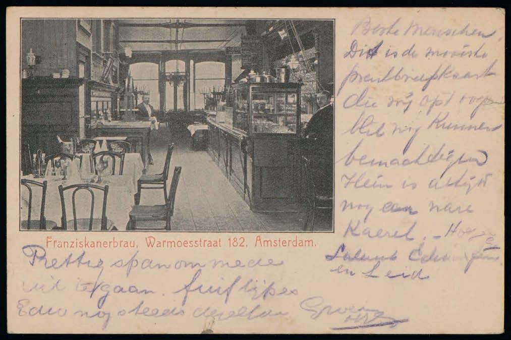 man Leonard Alberts en zijn vrouw Sophia Mathilde Müller in Deventer. Leonard had tien jaar eerder, in 1893-1894, als twintigjarige in Amsterdam gewoond. Vermoedelijk heeft hij toen ook van de Amsterdamse horeca geproefd. De belangrijkste Duitse bierhuizen waren te vinden in de Warmoesstraat vlak bij de Dam: Zum Pschorr op nummer 178, de Münchener Löwenbräu op nummer 193 en de Münchener Franziskanerbräu op nummer 196. De laatste ‘bierkneipe’ was overgestapt op Löwenbräu-bier toen op 13 juli 1897 de Franziskanerbräu op Warmoesstraat 182 opende. De zaak was versierd met ‘helderkleurige wandschilderingen’, zo schreef een krant, waarop ‘geestelijken en leeken de bierkan alle eer bewijzen’. Door bruin geschilderde schotten langs de wanden was de ruimte verdeeld in ‘kleine tot vertrouwelijke biergesprekken uitnoodende compartimenten’. Er werd Franziskanerbräu uit München getapt (donker bier,