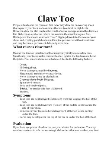 People often blame the common foot deformity claw toe on wearing shoes that squeeze your toes, such as shoes that are too short or high heels. However, claw toe also is often the result of nerve damage caused by diseases like diabetes or alcoholism, which can weaken the muscles in your foot. Having claw toe means your toes "claw," digging down into the soles of your shoes and creating painful calluses. Claw toe gets worse without treatment and may become a permanent deformity over time.