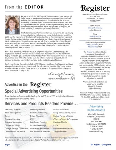 www.iiarfc.org/publications/register P.O. Box 506 Middletown, OH 45042 800.532.9060 Editor-in-Chief Wendy M. Kennedy editor@iarfc.org Editor Susan M. Cappa susan@iarfc.org Editorial Advisory Committee Peter J. D’Arruda, MRFC Michelle Blair, RFC® The Register is published by the International Association of Registered Financial Consultants ©2019, It includes articles and advice on technical subjects, economic events, regulatory actions and practice management. The facts and opinions in the IARFC’s Register articles represent their author’s views and are not endorsed by the publisher. The IARFC makes no claim as to accuracy and does not guarantee or endorse any product or service that may be advertised or featured. Articles, comments and letters are welcomed by email to: Wendy M. Kennedy editor@iarfc.org Periodicals Postage Paid at Mansfield, Ohio. POSTMASTER: Send address changes to: P.O. Box 506, Middletown, Ohio 45042 ISSN 1556-4045