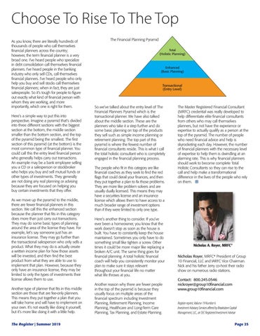 Choose To Rise To The Top As you know, there are literally hundreds of thousands of people who call themselves financial planners across the country; however, the term financial planner is a very broad one. I've heard people who specialize in debt consolidation call themselves financial planners. I've heard people in the banking industry who only sell CDs, call themselves financial planners. I've heard people who only help you buy and sell stocks call themselves financial planners; when in fact, they are just salespeople. So it’s tough for people to figure out exactly what kind of financial person with whom they are working, and more importantly, which one is right for them. Here’s a simple way to put this into perspective. Imagine a pyramid that’s divided into three different sections with the biggest section at the bottom, the middle section smaller than the bottom section, and the top of the pyramid being the smallest. The first section of this pyramid (at the bottom) is the most common type of financial planner. You could call this the entry level financial person who generally helps carry out transactions. An example may be a bank employee selling you a CD or a salesperson or stockbroker who helps you buy and sell mutual funds or other types of investments. They generally are not doing any real planning or advising because they are focused on helping you buy certain investments that they offer. As we move up the pyramid to the middle, there are fewer financial planners in this section. We call this the enhanced section because the planner that fits in this category does more than just carry out transactions. They may do some basic types of planning around the area of the license they have. For example, let’s say someone just has an insurance license. They may go further than the transactional salesperson who only sells a product. What they may do is actually create a written income plan for how those assets will be invested, and then find the best product from what they are able to use to implement that plan. However, because they only have an insurance license, they may be limited to only the types of investments their license allows them to use. Another type of planner that fits in this middle section are those that are fee-only planners. This means they put together a plan that you will take home and will have to implement on your own. It’s not exactly like doing it yourself, but it’s more like doing it with a little help. The Register | Summer 2019