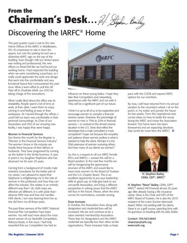 Chairman’s Desk… Discovering the IARFC® Home This past quarter I paid a visit to the new Home Offices of the IARFC in Middletown, OH. It’s impressive to ride in from the airport, turn into the parking lot and see a distinctive IARFC sign on the top of the building. Even though I felt our rented space was inviting and professional, the new offices on Breiel felt like we had found our working home. I had inspected the building when we were considering a purchase, so I really could appreciate the work and design that went into this comfortable and very functional layout that I encountered this past June. What a team effort to pull this off. Hats off to Charlotte Isbell, our COO for taking charge of the renovations. What I really liked about the office was its relatability. People spend a lot of time at work, at their desk. I want them to enjoy coming in and feeling at ease in their workspace. As I toured through the offices, I could tell our team was comfortable in their personal surroundings. As Chair of our Association and CEO of our amazing new facility, I was happy they were happy. Women in Financial Services Our theme this month for the Register is “Women in the Financial Services Industry”. The women I know in the industry are mostly there because of their fathers or husbands. They have progressed by coming up the ladder in the family business. A case in point is my daughter Stephanie who has observed me for over 20 years. Coming from a background of mostly male oriented consultants for the better part of my career, I am pleased to report that Stephanie is enlightening me in the role of women in this profession and how they can affect the industry. She relates in an entirely different way than I do. Both ways are effective yet different. It is with pride that I observe HER now and how she handles HER clients. I am now learning from her as she did from me all those years. The past three winners of the IARFC National Financial Plan Competition have been women. You will read more about the most recent winner of our Nashville Competition, Rebecca Boyle, in this issue. I feel truly rewarded that our Competition has had an The Register | Summer 2019