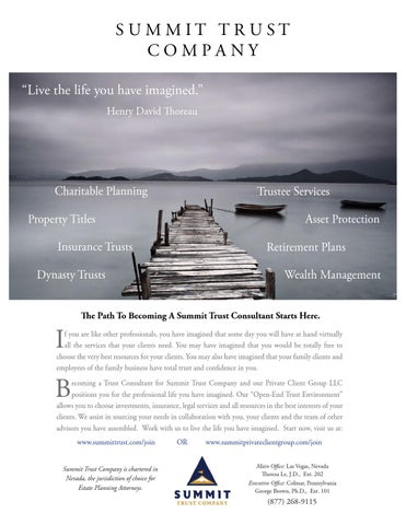 allows you to choose investments, insurance, legal services and all resources in the best interests of your clients. We assist in sourcing your needs in collaboration with you, your clients and the team of other advisors you have assembled. Work with us to live the life you have imagined. Start now, visit us at: www.summittrust.com/join Summit Trust Company is chartered in Nevada, the jurisdiction of choice for Estate Planning Attorneys.