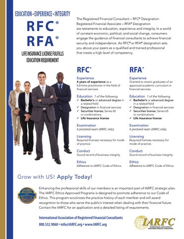 The Registered Financial Consultant – RFC® Designation Registered Financial Associate – RFA® Designation are testaments to education, experience and integrity. In a world of constant economic, political, and social change, consumers engage the guidance of financial consultants to achieve financial security and independence. An RFC® or RFA® designation sets you above your peers as a qualified and trained professional that meets a high level of competency.