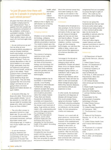 References: 1. US Department of Health and Human Services, January 2000. 2. United States Census Bureau. US Department of Commerce, May 1995. 3. American Academy of Antiaging Medicine, www.worldhealth.net 4. De Grey, A. 2004 Journal of Rejuvenation, Mary Ann Liebert Publications. 5. US Census Bureau: www.census.gov/ipc/www/idbp yr.html 6. World Health Organisation Ageing & Health: www.who.int/hpr/ageing 7. Lehman Brothers Equity Research. 8. Association for the advancement of assistive technology in Europe. 9. United States Census Bureau, May 1995. 10. United States Department of Commerce, 1992. 11. The Economist, 3 June, 2000. 12. National Vital Statistics Reports, Vol. 47, No. 20, June 30, 1999. 13. United States Health-Care and Finance Administration, 1996. 14. Physicians for a national health program, June 25, 2003. 15. Life Extension Magazine, May 6, 2002. Life Extension Foundation.