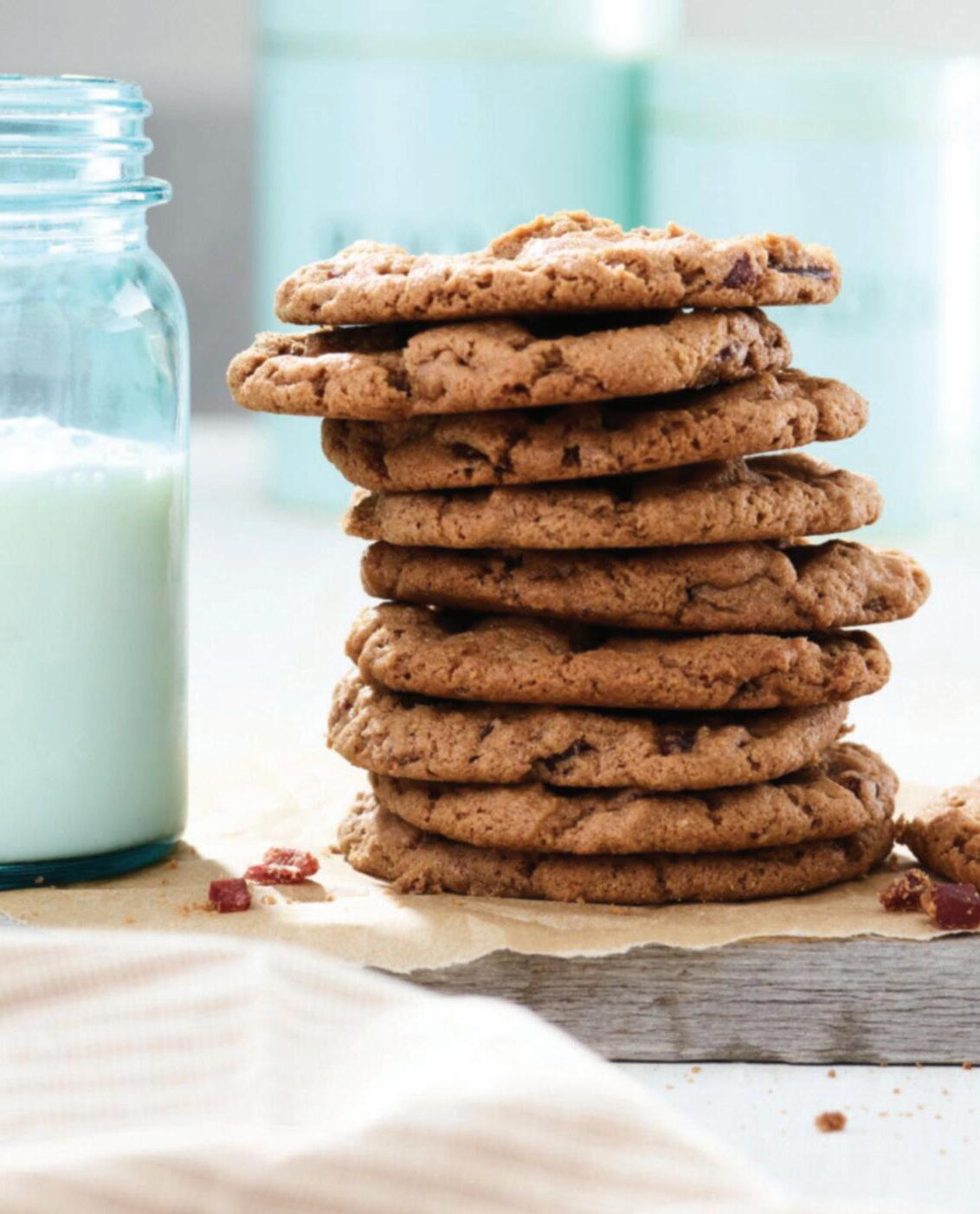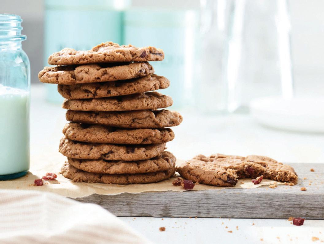 Combine flour, baking soda and salt in medium bowl; whisk together. Add flour mixture to butter mixture; mix until fully incorporated; do not over mix. Add in jerky and chocolate chips. Divide dough into 24 equal balls. Place on 2 ungreased shallowrimmed baking sheets. Bake in 350 degrees F oven 13 to 15 minutes or until tops are evenly cracked. Cool 10 minutes before serving.