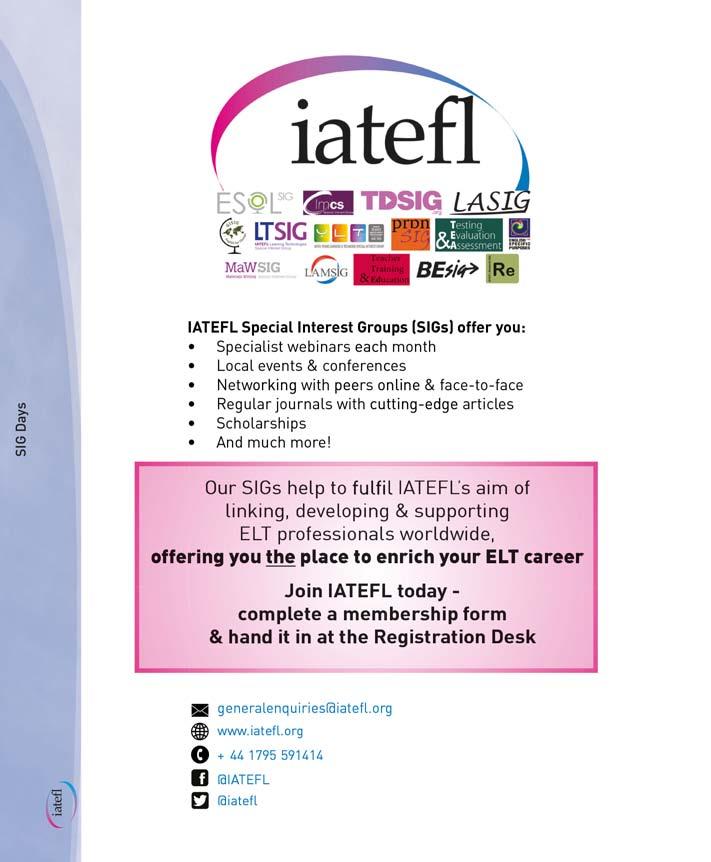 Please visit www.iatefl.org for details on next year’s Pre-Conference Events (details online from June 2016) and for details on all other SIG events, held worldwide throughout the year.