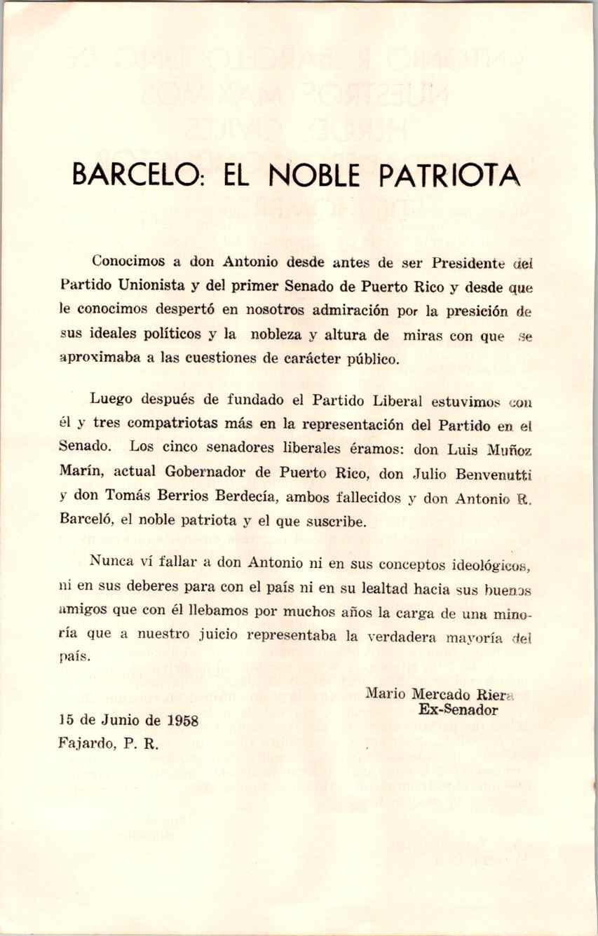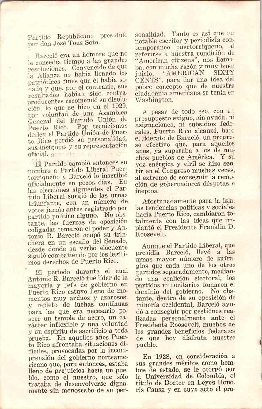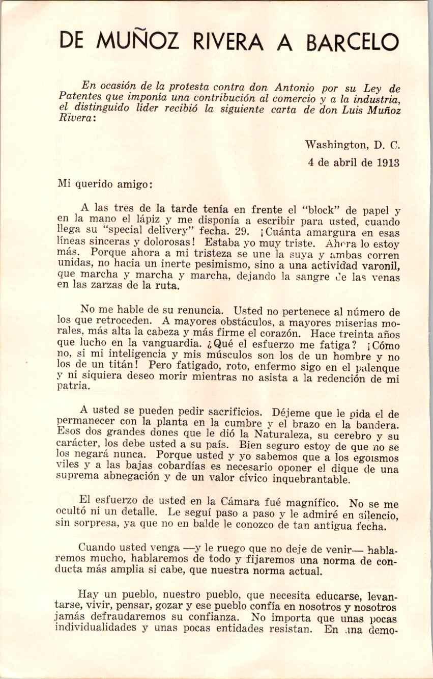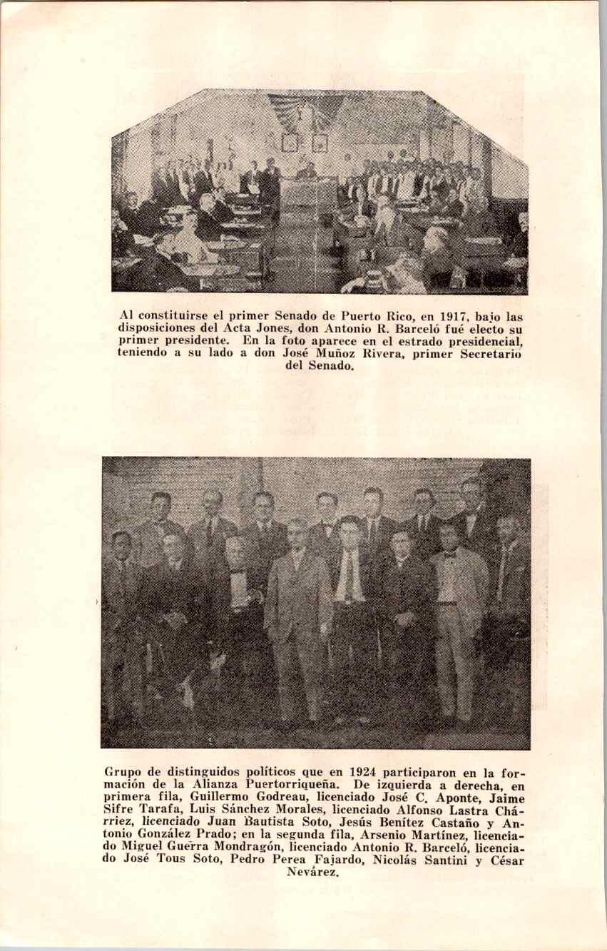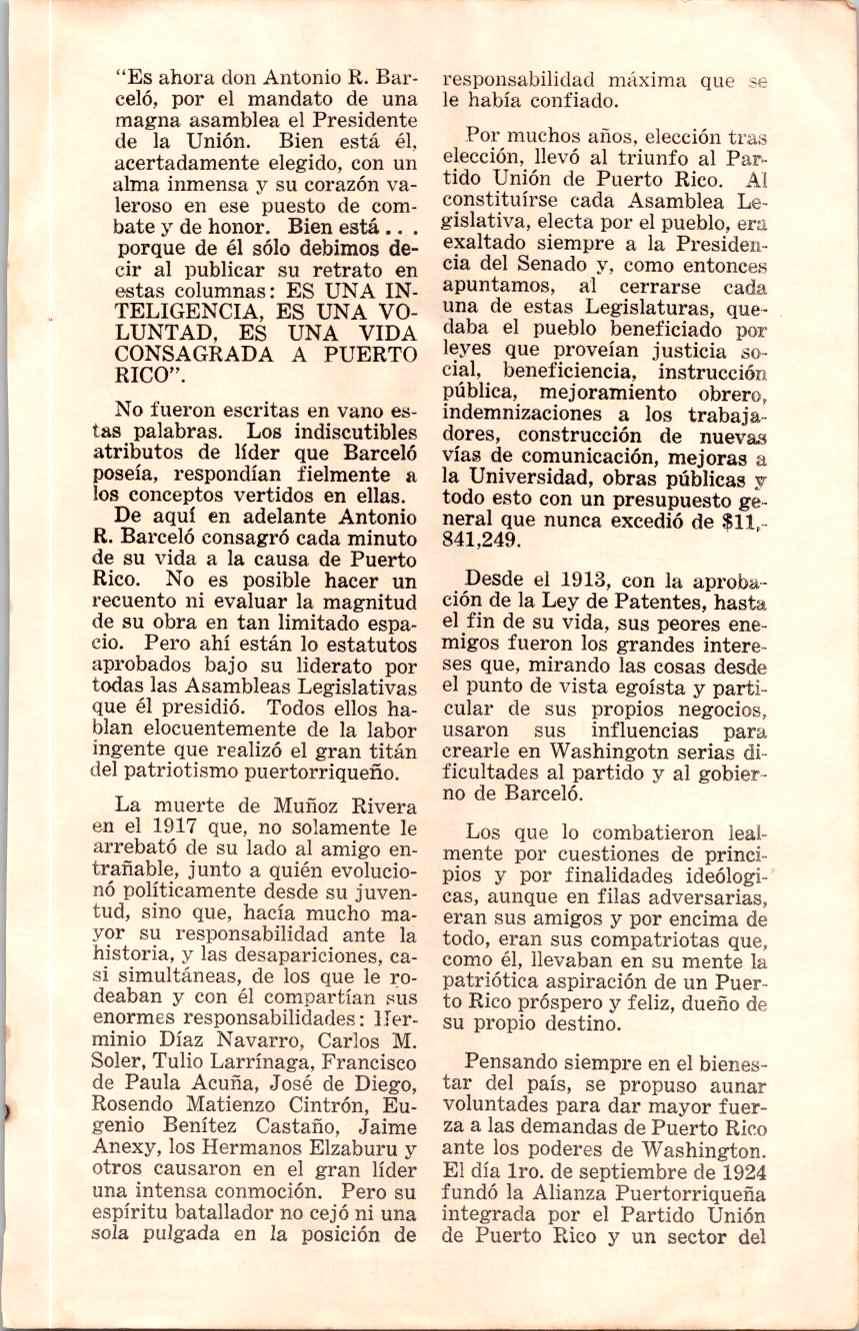 Raro libro que explica las perspectivas y visiones políticas de quien fuera uno de los líderes políticos más importes de principio del Siglo XX en Puerto Rico. Barceló fue el primer Presidente del Senado de Puerto Rico, Presidente del Partido Unión y del posterior Partido Liberal, en cuyo seno se dieron intensas polémicas y disensiones que culminaron con la fundación del Partido Popular Democrático en 1938 por quien fuera su devoto discípulo y luego su más agresivo opositor, Luis Muñoz Marín.