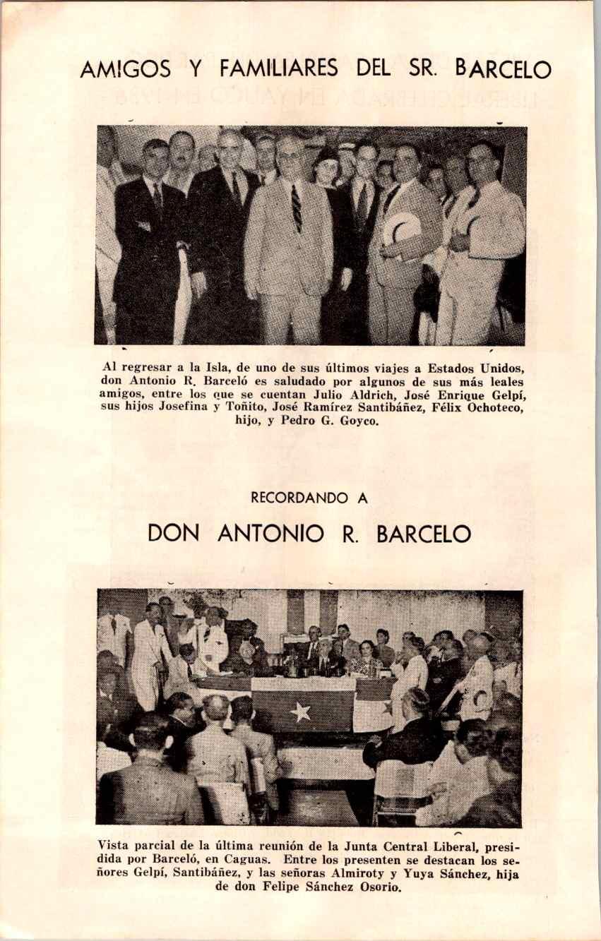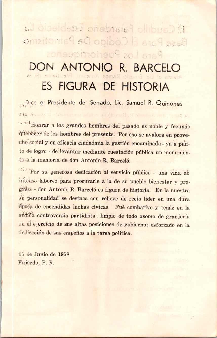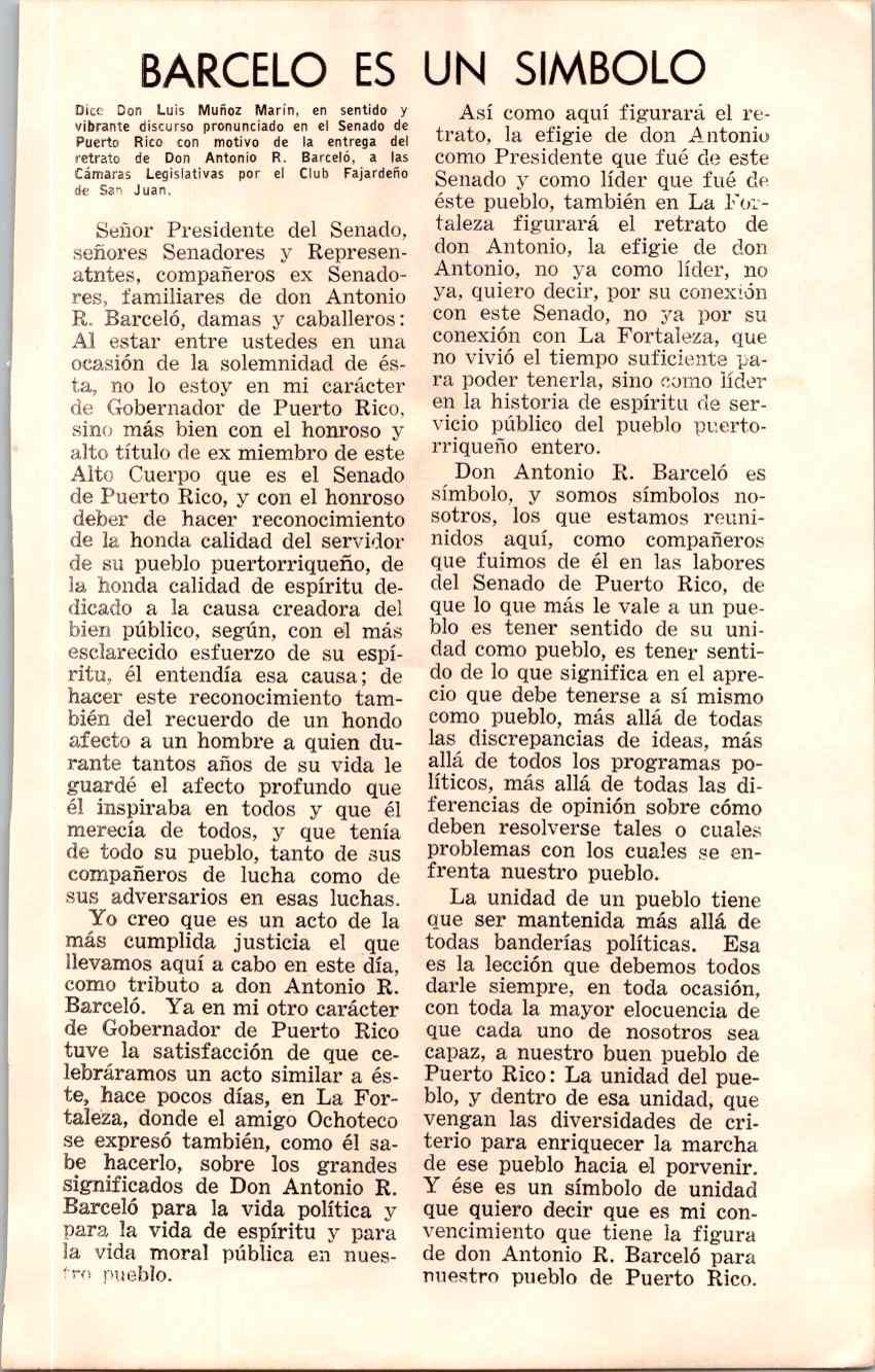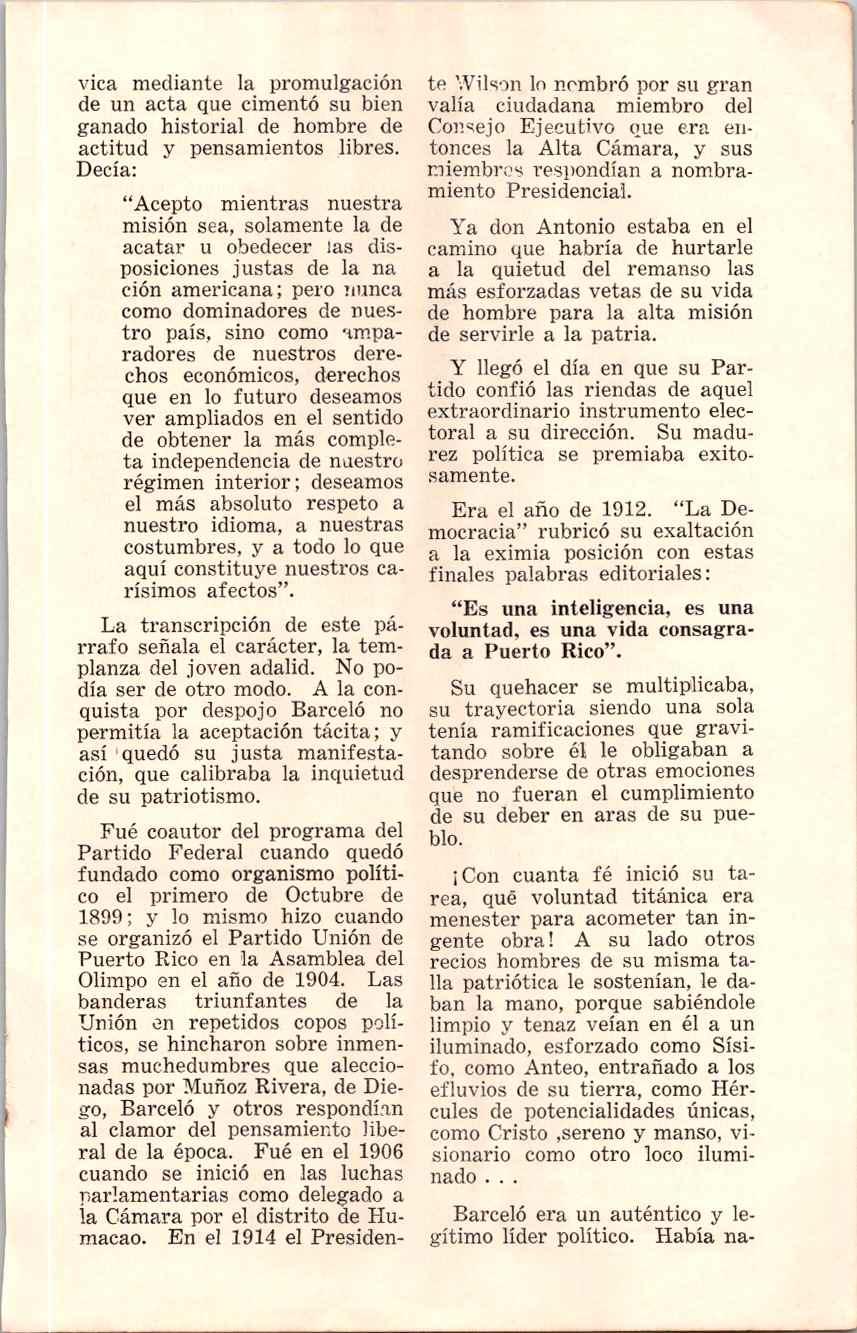 Raro libro que explica las perspectivas y visiones políticas de quien fuera uno de los líderes políticos más importes de principio del Siglo XX en Puerto Rico. Barceló fue el primer Presidente del Senado de Puerto Rico, Presidente del Partido Unión y del posterior Partido Liberal, en cuyo seno se dieron intensas polémicas y disensiones que culminaron con la fundación del Partido Popular Democrático en 1938 por quien fuera su devoto discípulo y luego su más agresivo opositor, Luis Muñoz Marín.