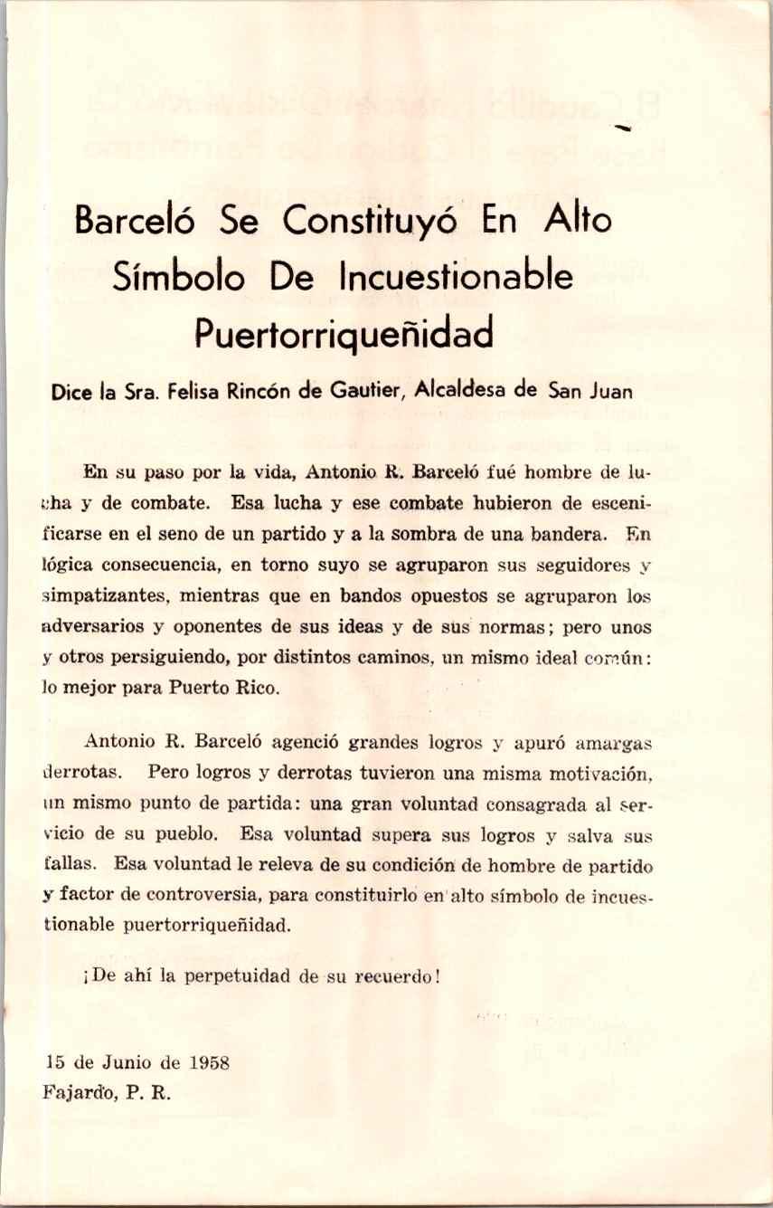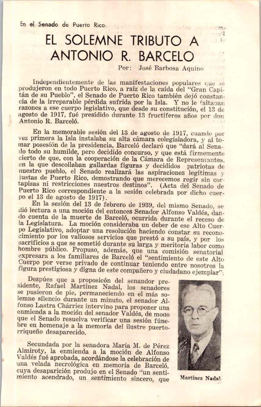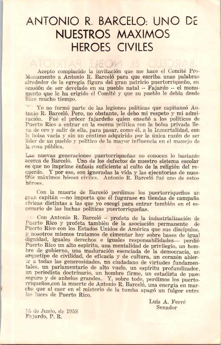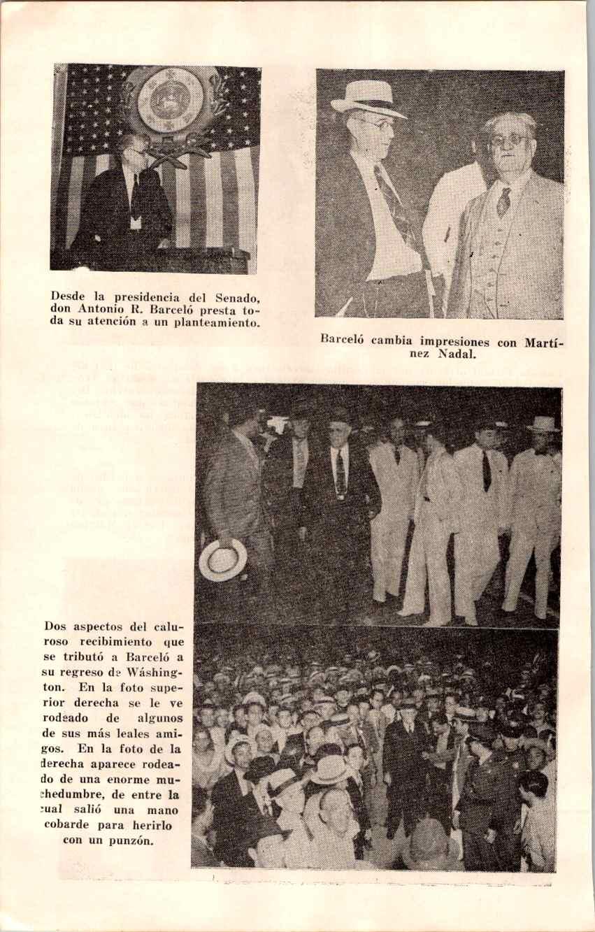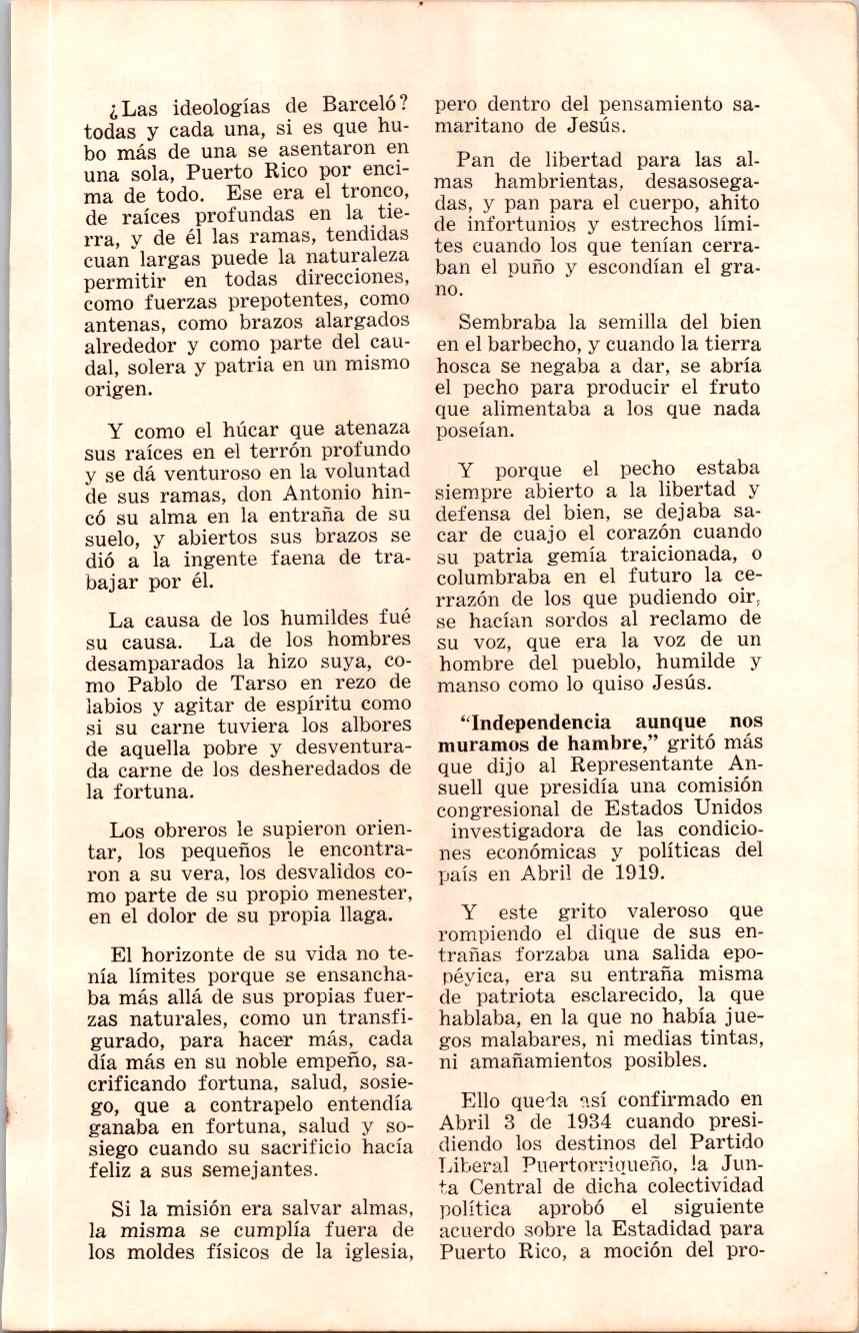 Raro libro que explica las perspectivas y visiones políticas de quien fuera uno de los líderes políticos más importes de principio del Siglo XX en Puerto Rico. Barceló fue el primer Presidente del Senado de Puerto Rico, Presidente del Partido Unión y del posterior Partido Liberal, en cuyo seno se dieron intensas polémicas y disensiones que culminaron con la fundación del Partido Popular Democrático en 1938 por quien fuera su devoto discípulo y luego su más agresivo opositor, Luis Muñoz Marín.