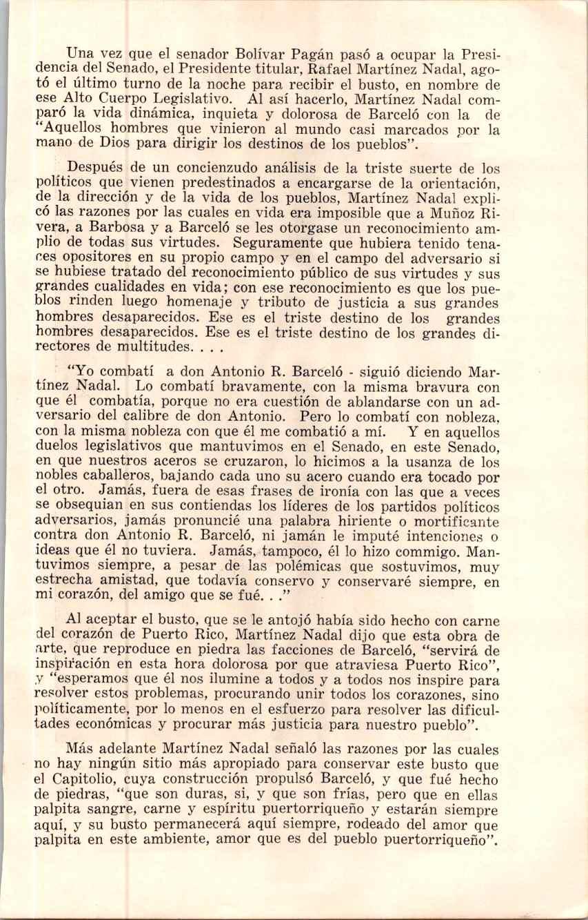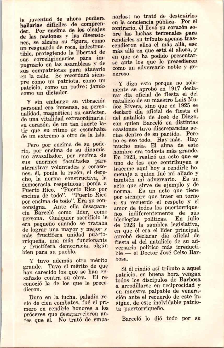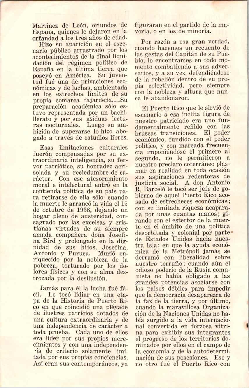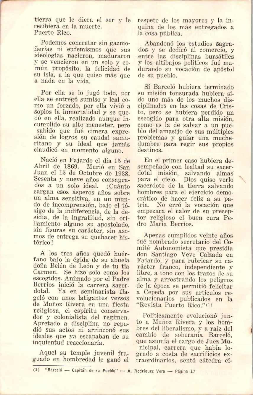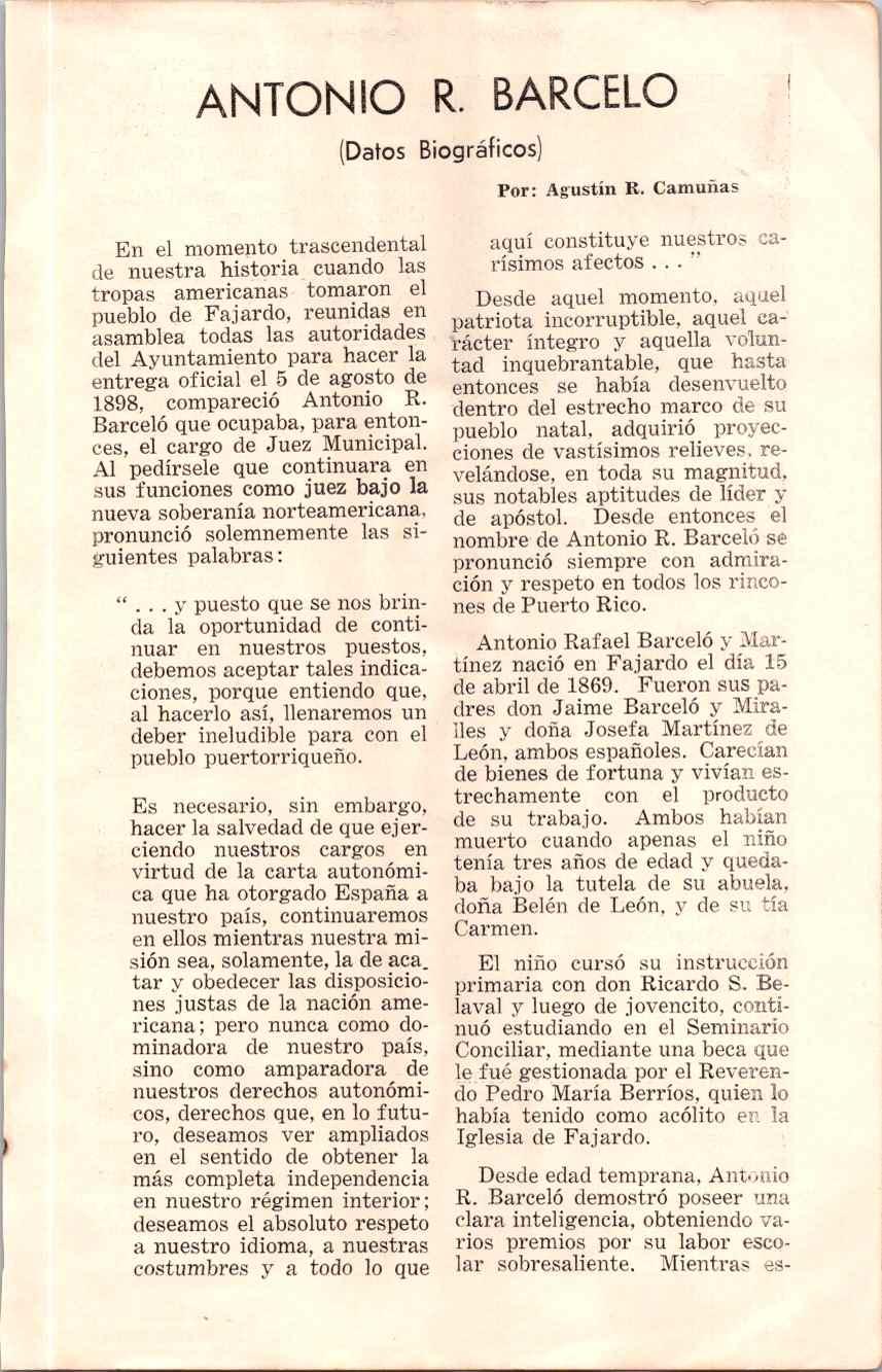 Raro libro que explica las perspectivas y visiones políticas de quien fuera uno de los líderes políticos más importes de principio del Siglo XX en Puerto Rico. Barceló fue el primer Presidente del Senado de Puerto Rico, Presidente del Partido Unión y del posterior Partido Liberal, en cuyo seno se dieron intensas polémicas y disensiones que culminaron con la fundación del Partido Popular Democrático en 1938 por quien fuera su devoto discípulo y luego su más agresivo opositor, Luis Muñoz Marín.