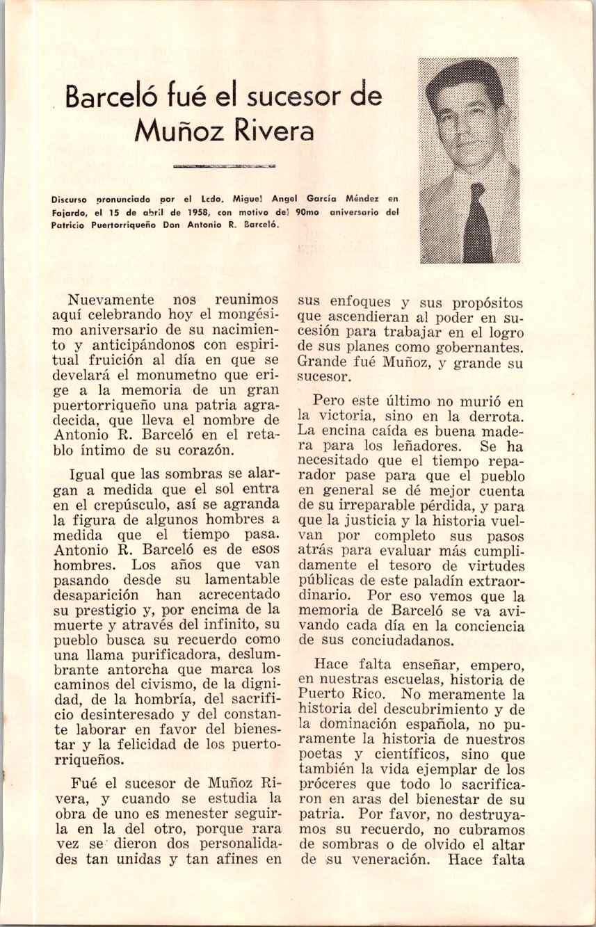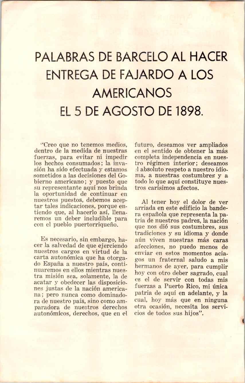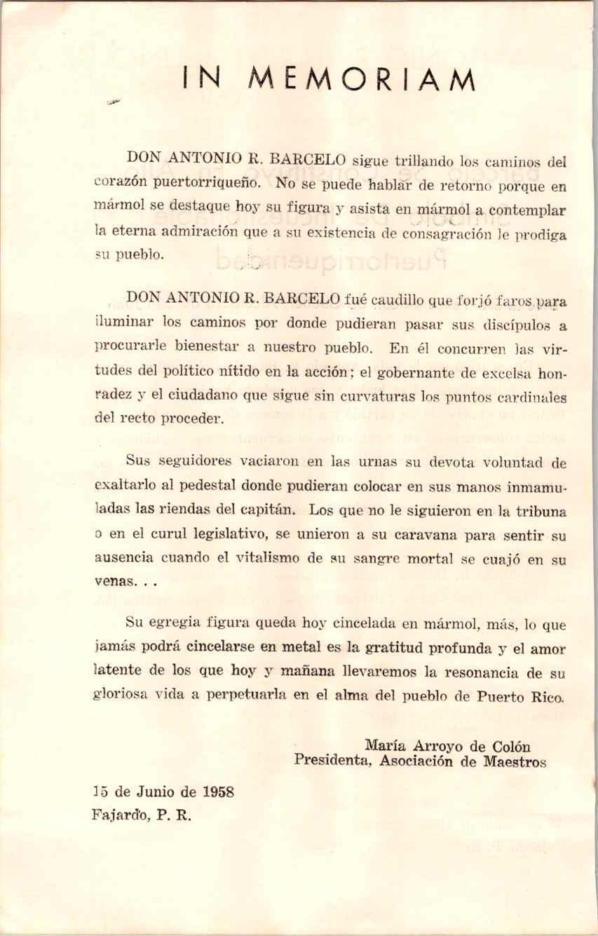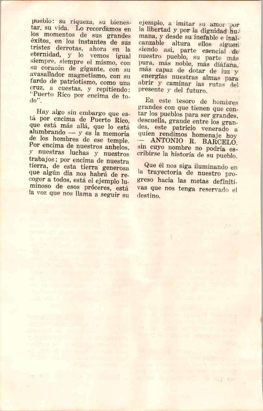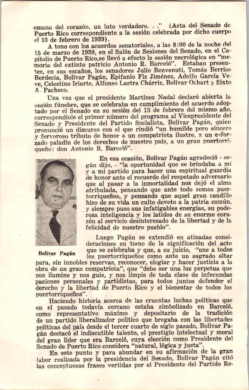 Raro libro que explica las perspectivas y visiones políticas de quien fuera uno de los líderes políticos más importes de principio del Siglo XX en Puerto Rico. Barceló fue el primer Presidente del Senado de Puerto Rico, Presidente del Partido Unión y del posterior Partido Liberal, en cuyo seno se dieron intensas polémicas y disensiones que culminaron con la fundación del Partido Popular Democrático en 1938 por quien fuera su devoto discípulo y luego su más agresivo opositor, Luis Muñoz Marín.