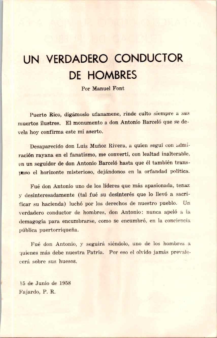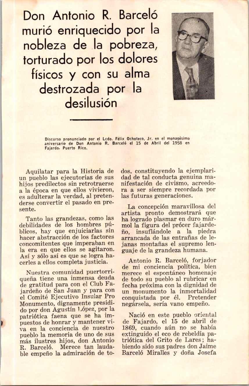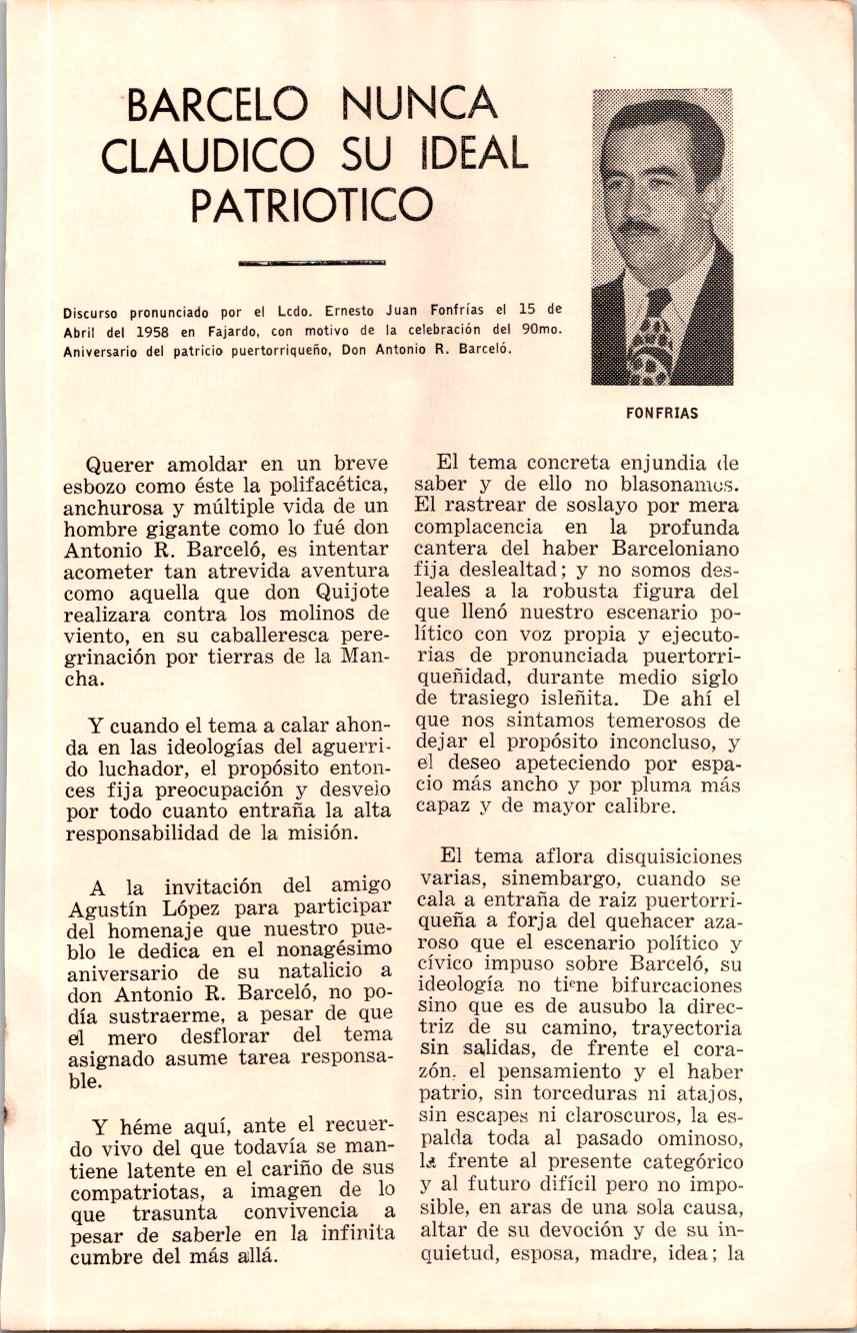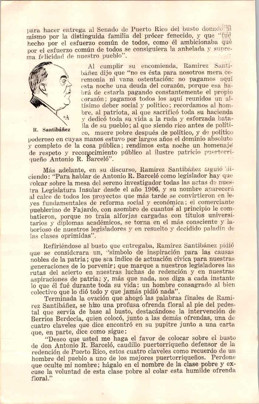 Raro libro que explica las perspectivas y visiones políticas de quien fuera uno de los líderes políticos más importes de principio del Siglo XX en Puerto Rico. Barceló fue el primer Presidente del Senado de Puerto Rico, Presidente del Partido Unión y del posterior Partido Liberal, en cuyo seno se dieron intensas polémicas y disensiones que culminaron con la fundación del Partido Popular Democrático en 1938 por quien fuera su devoto discípulo y luego su más agresivo opositor, Luis Muñoz Marín.