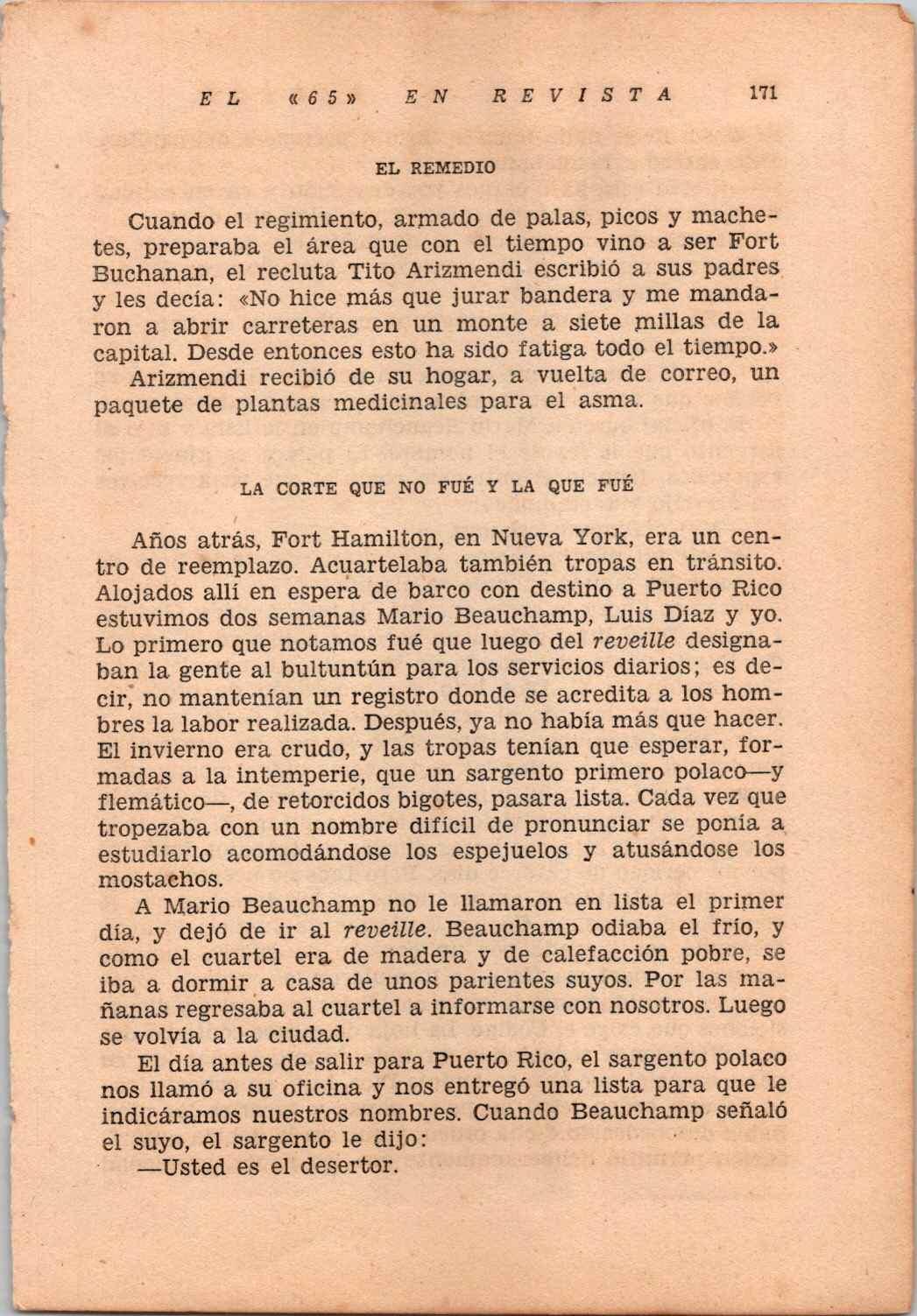 IATR: 1961 EL '65' EN REVISTA de ANTONIO E PADRON es uno de los primeros libros, sino el primero, que recoge las experiencias del Regimiento del 65 de Infantería en la Guerra de Corea. El '65' fue el Regimiento de puertorriqueños reclutados para servir en el conflicto bélico coreano en el que los Estados Unidos y China se enfrentarán en el territorio coreano por el avance del comunismo. El libro está repleto de anécdotas de primera mano, información sobre los muertos y desparecidos en batalla, así como anécdotas jocosas o tristes de los solidados boricuas del famoso regimiento.
