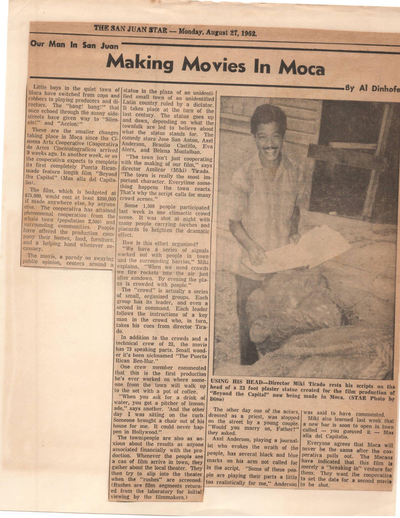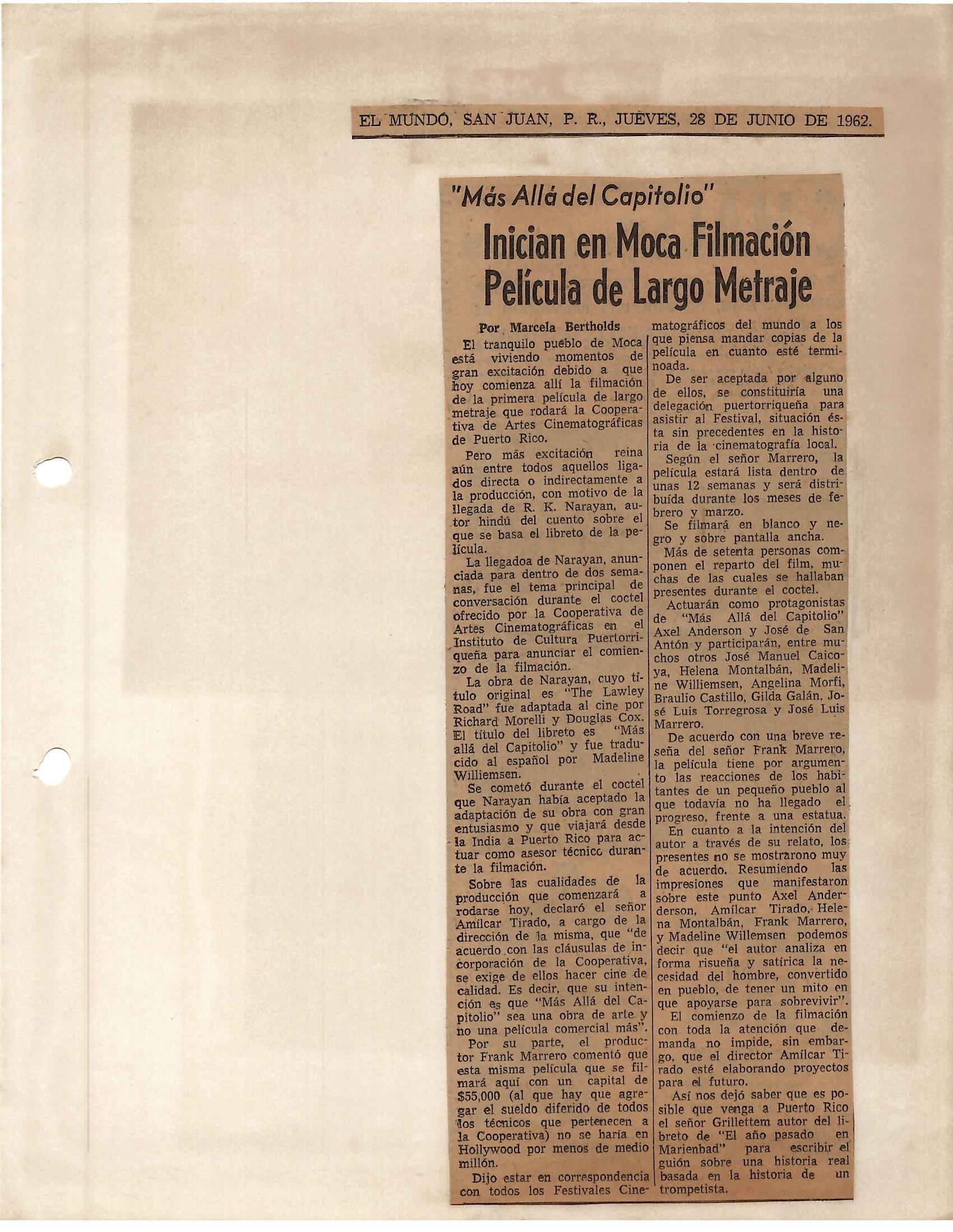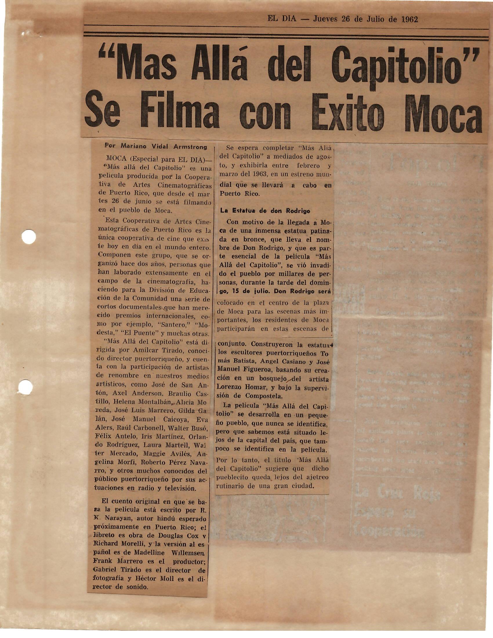 Expediente que contiene notas de prensa, fotografías, entrevistas, y otros documentos sobre la realización de la película MáS ALLÁ DEL CAPITOLIO, uno de los grandes clásicos del cine puertorriqueño de la década de oro 1960-1970.