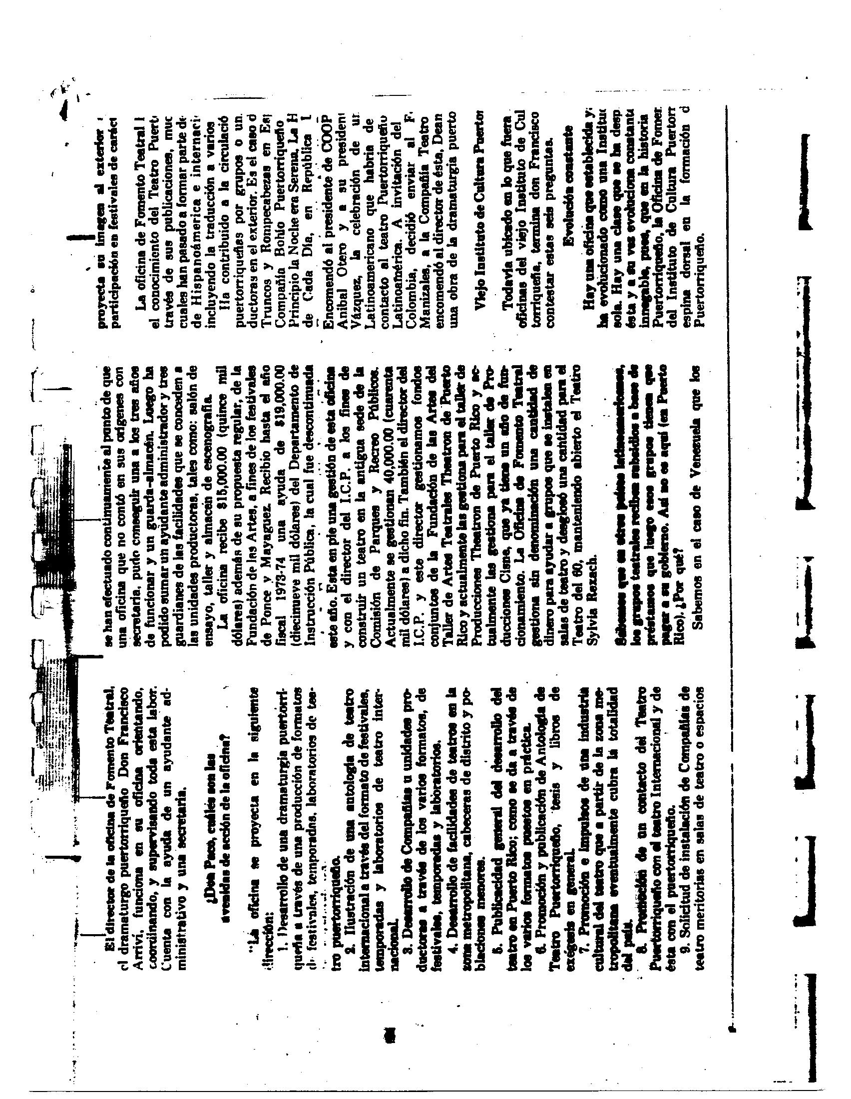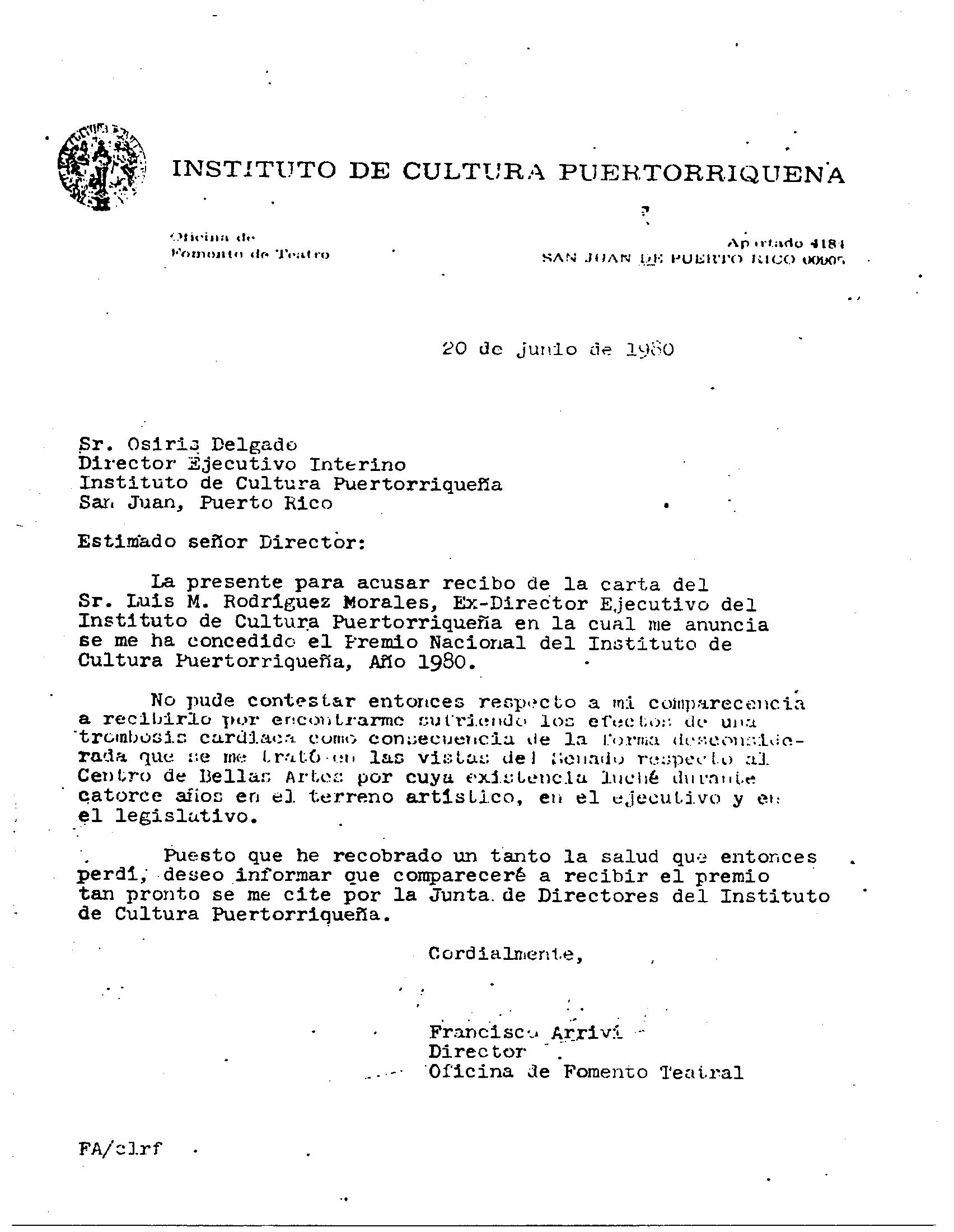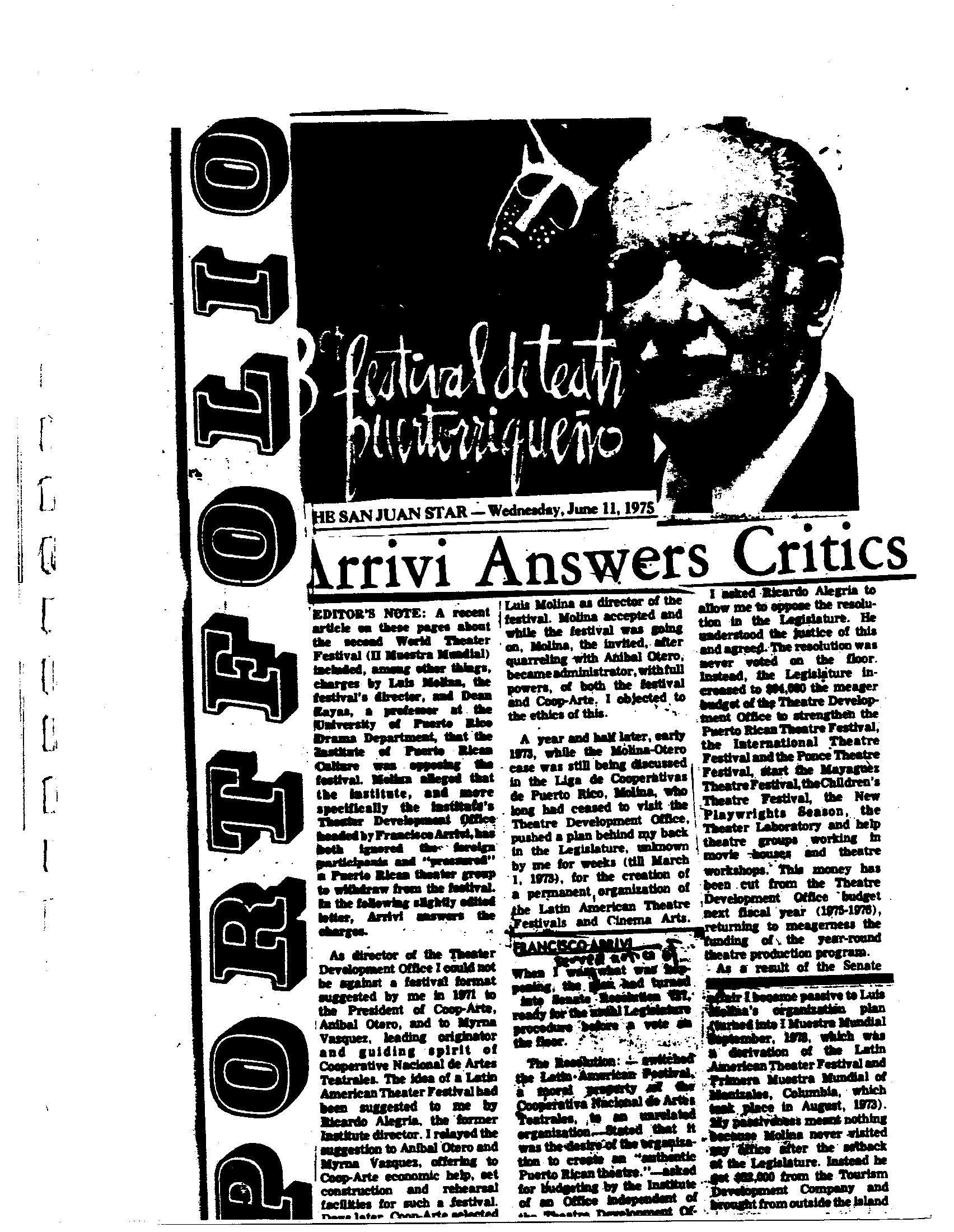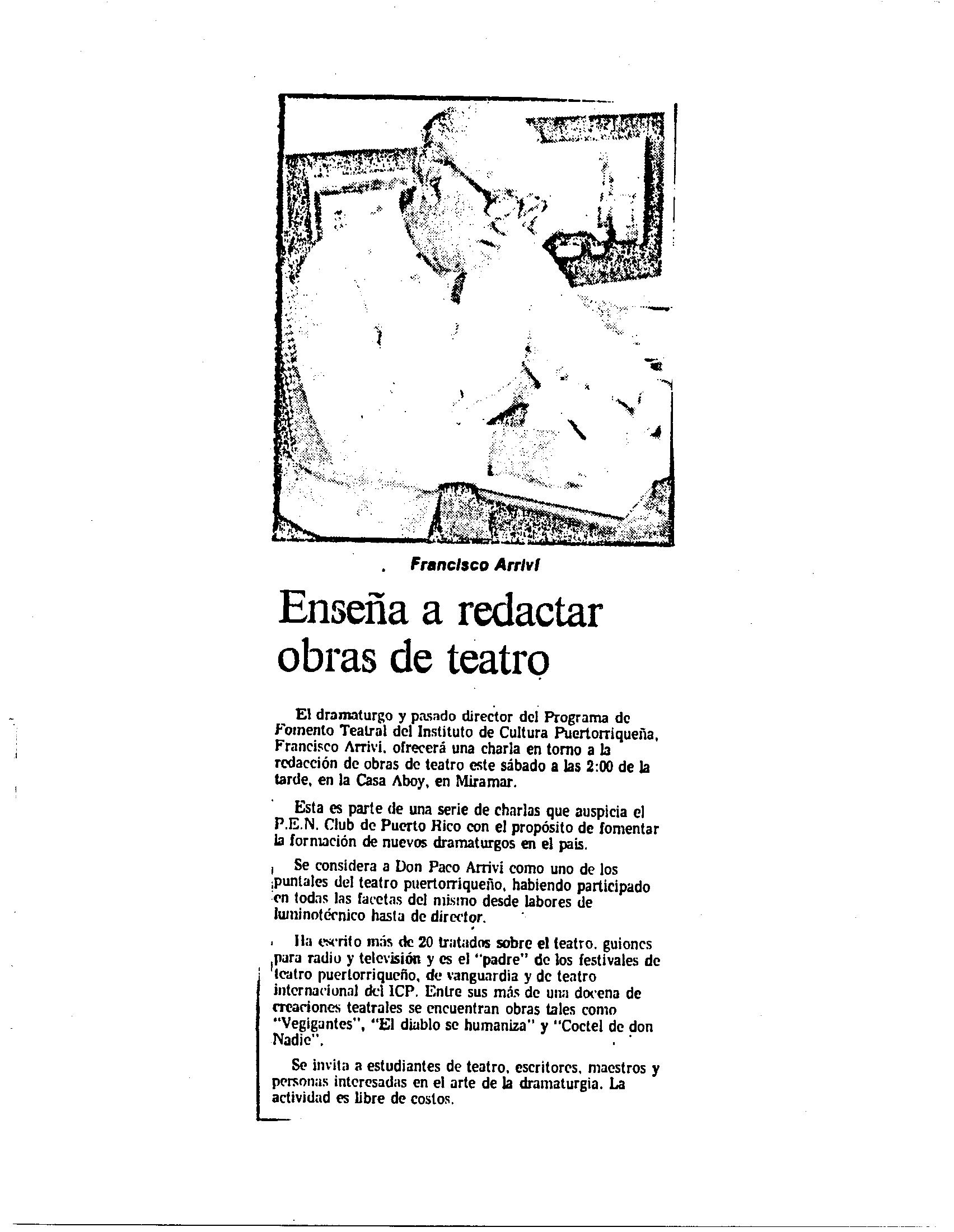IATR:Col. Francisco Arriví: 1974-1980 ESCILA, CARIBDIS Y REMOLINIO. Este fundamental libro auto publicado por ARRIVI, reúnele todos los documentos relacionados a las tres luchas más importantes dadas por él desde la Oficina de Teatro del Instituto de Cultura Puertorriqueña. El intento de usurpación que perpetraron varios empresarios latinoamericanos para quedarse con los fondos para teatro asignados por del Gobierno para ellos realizar Festivales Latinoamericanos en San Juan; las luchas contra los disidentes de los Festivales Puertorriqueños y la usurpación del Centro de Bellas Artes por la Administración para el Fomento de las Artes y la Cultura', institución creada por el Gobierno estadista de Carlos Romero Barceló para eliminar el Instituto de Cultura Puertorriqueña. Esta tres luchas eventualmente le costarían su salud física y su vida. Este es el testimonio de esas luchas.