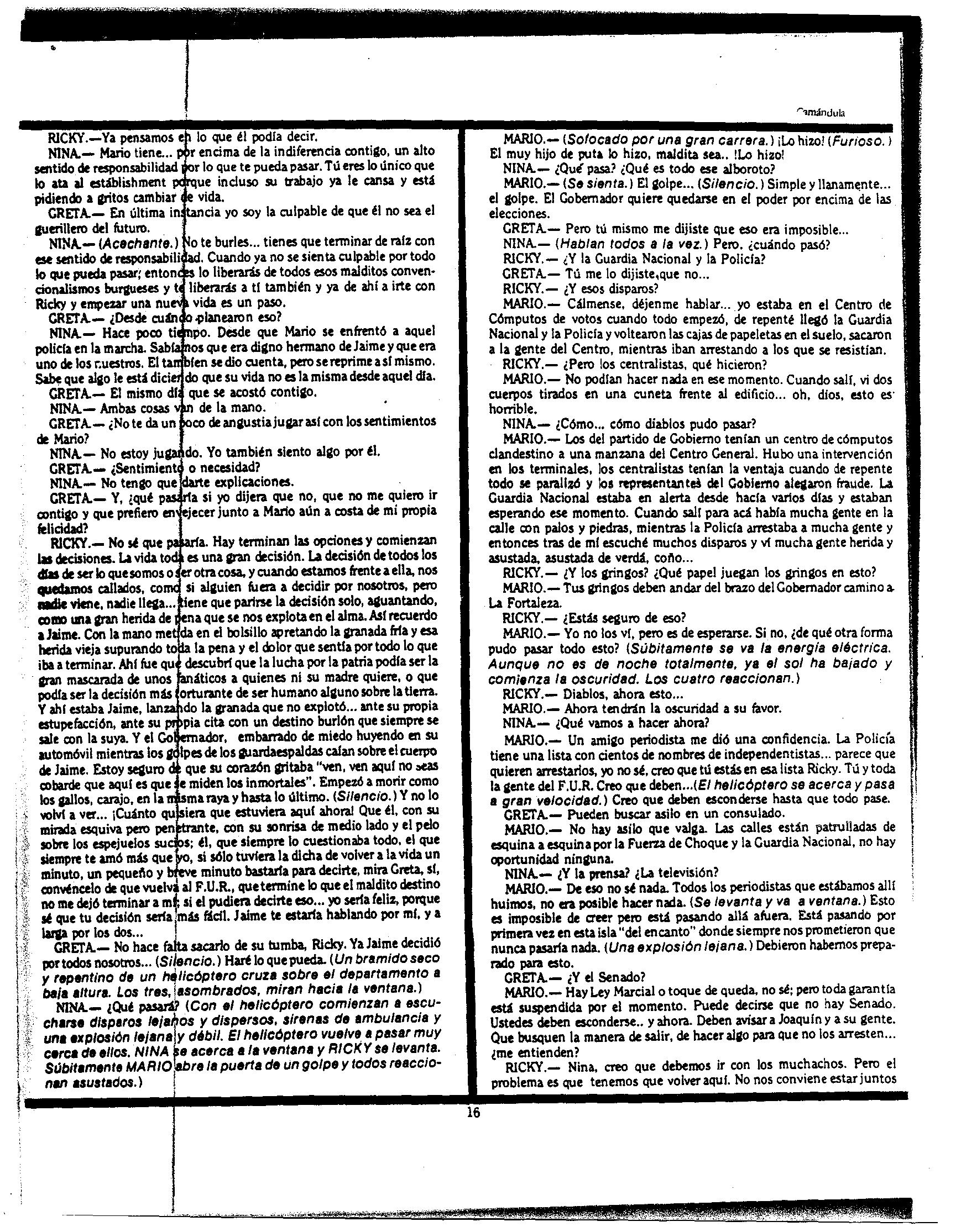 tiene el valorde acompaftarme?(SI/ene/o. A GRETA.) Tú que me nvencistede la nulidaddemi vida,de mifaltade propósito.Tú quesi re te hasJactadode quetienesal¡o porqut!vivir... ¿Darlasese "algo" por matar al Gobernador?(GRETA ,e queda en ailencio. MARIO mira a NINA.) Y tú, que inclusomedistetu CUell!O paraconvencerme, y me lo darlasde nuevosi te lo pidien, pero en lullar de tu cuerpo,¡porqu*· o me dastu vida?Ratondtoirracionaly loco,que repitesel manifiesto Marxcon el mismofervorcon que rezarlasun padrenuestro ¿te a acompaftarme?(NINA ae queda ensilencio. MARIO mira a 2CKY.) Ytú... que dicesque lohasdadotodopor lapatriay queveniasa darlelo último quete quedabaqueera!avicia.¿La darlasconmigoalll, 111y yo solos frente a la muertesegura?(Silencio muy gravede todos:) Ningunode ustedes clarianadaen vetdL Nin• auna de ustedespuededecidirpor si mismo.¿Quétal si yo decidierapor ustedes,Rlcky?(RJC°i(,YJomira muy asustado.) Te estoydando la oportunidaddeque mel!eniuestresque no eresnadade loquepienso.No necesitamosdiscursos i arena.. de lucha, ni vehementespromesasde Ilbend6n nunca cum "das.Ni jurar llorosossobre la tumba de Jaime prometiéndolevenaan Sólonecesitamosun pocode silencioy el poco de tiempo que nos qu de ahora hasta mailanaa las once, donde el Gobernadordeclarar.! a erto Ricoen estadode sitio. ¿Vasa ir conmigo? (Silencio. A NINA y GRETA.)_¿Lesgustarlaque el fueraconmigo? (Silencio. TOdosse iran.) Yatodo es!&dicho.Mailanaa las once. (A RICKY.) TI!y yo.