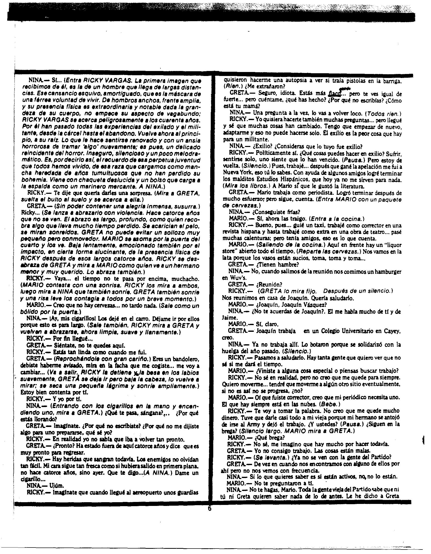 NINA.- Bueno vecinos, (Recoge sus cigarrillos.) yo me voy. Cualquier cosa lriten, (Sa áttiana en /a puerta.) Ustedes bueno. él me dijo que no se los dijera, pero yo s<!que a ustedes le encantarla saberlo. Ricky Vareas está en Puerto Rico.