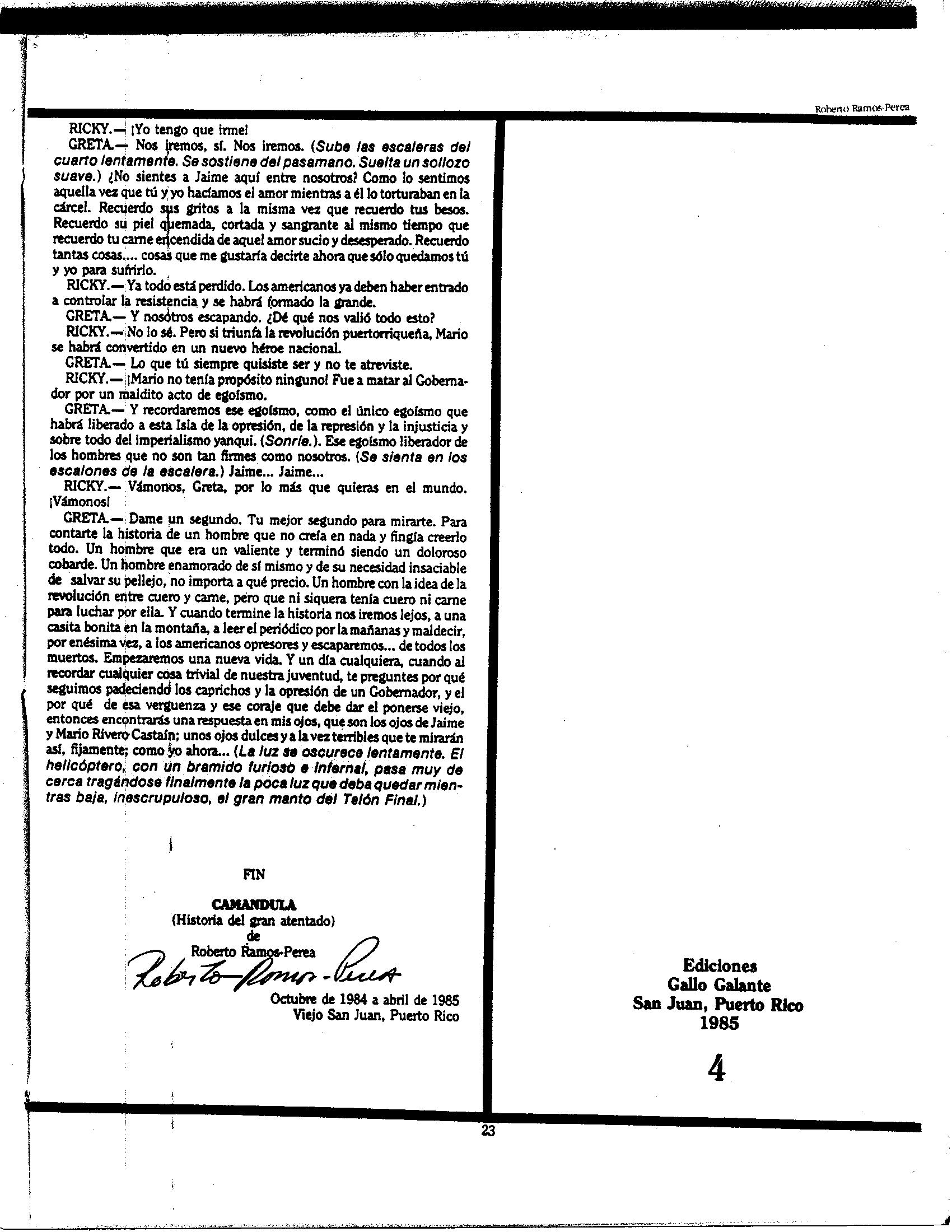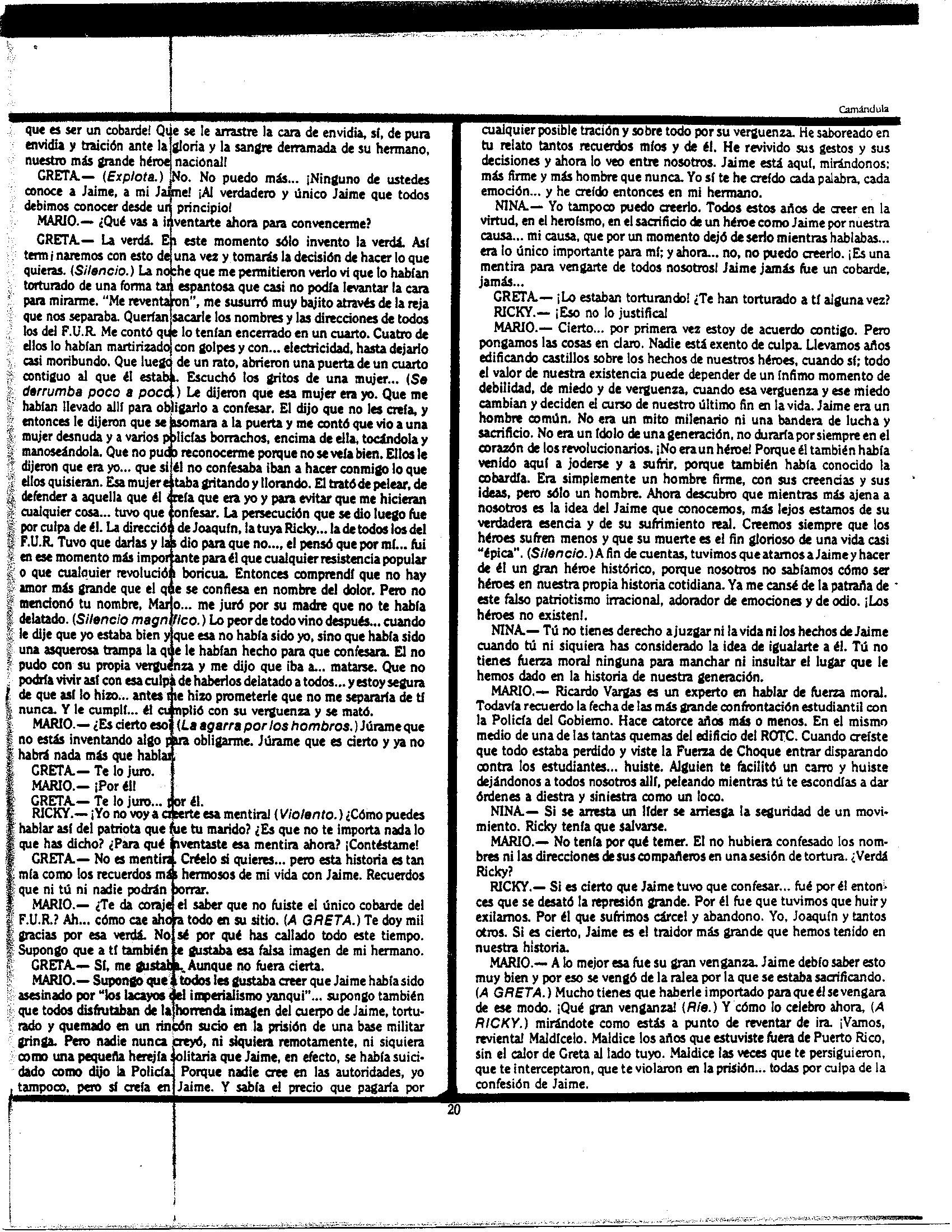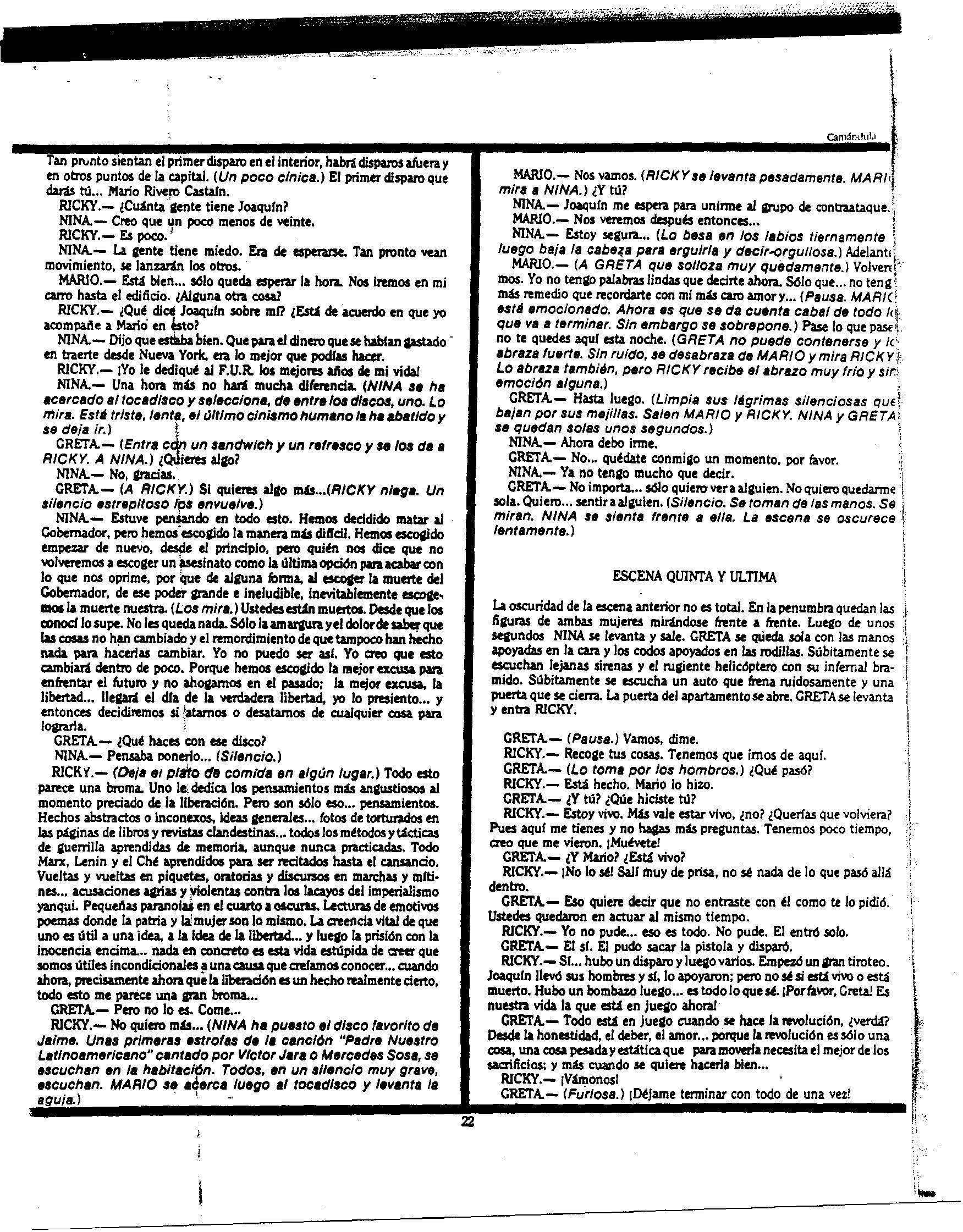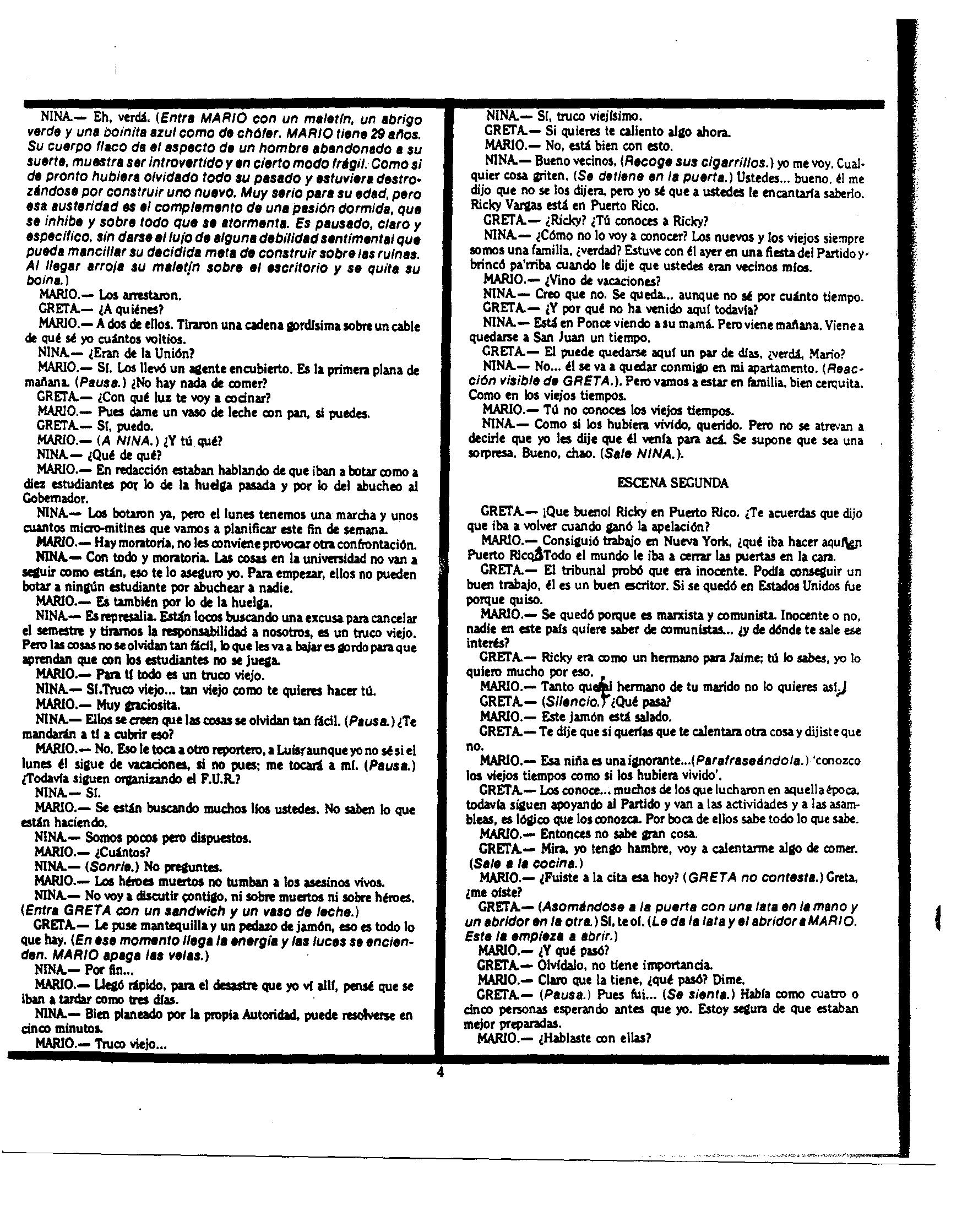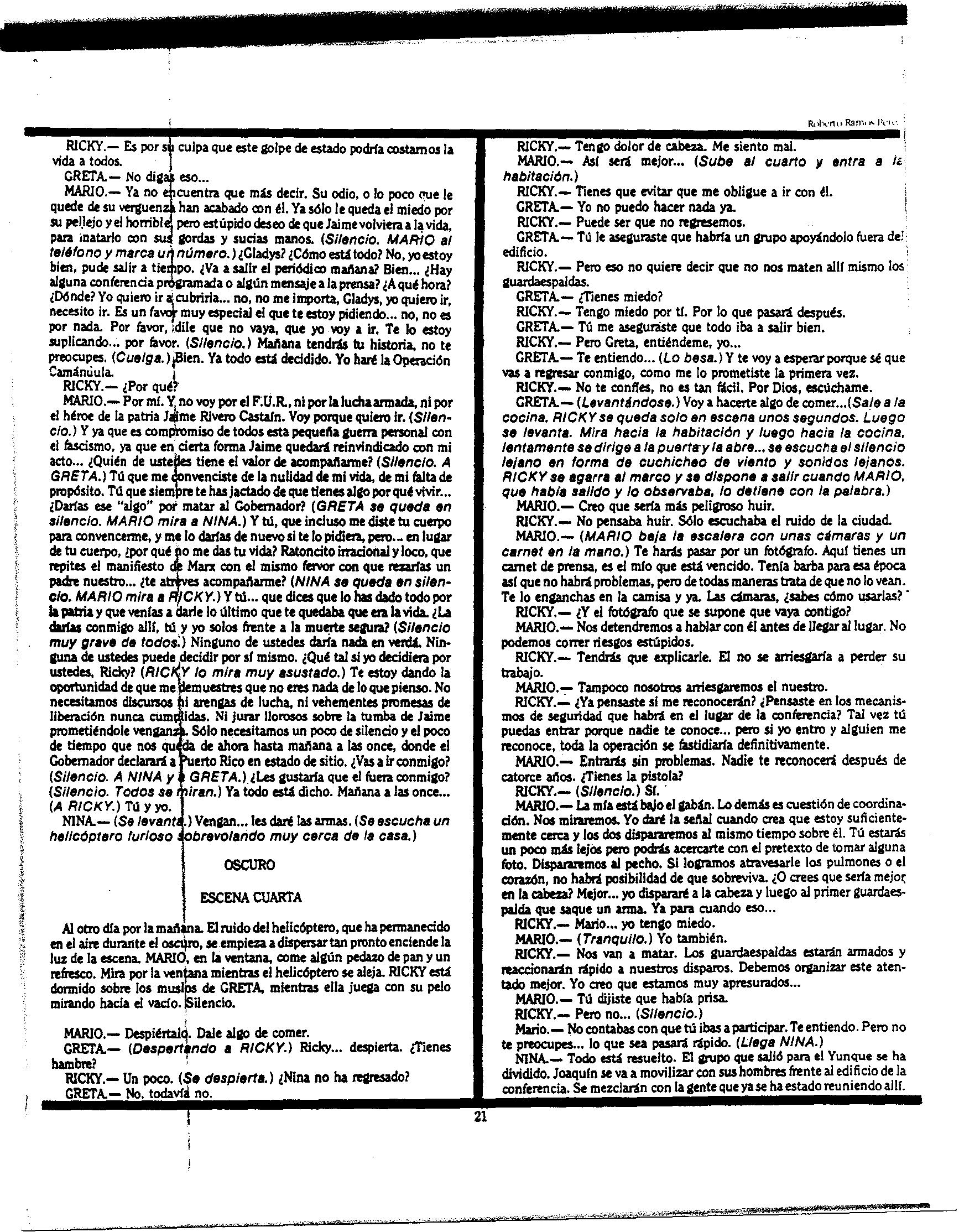 GRETA.- Dame '1n segundo.Tu mejor segundopara mirarte.Pa13 contarte la historiade un hombreque no creía en naday fingíacreerlo todo. Un hombre que el3 un valiente y terminó siendo un doloroso cobarde.Unhombreenamo13dode si mismoy de su necesidadinsaciable de salvarsu pellejo,'no importaa qué precio.Unhombrecon la ideade la revoluciónentre cueroy carne,pero que ni siqu.,,, tenla cuero ni carne para luchar Porella. Y cuandotennine la historianos iremoslejos,a una casitabonitaen la mon~a, a leerel periódicoporla maJlanasy maldecir, por enésimave,:,a los americanosopresoresy escaparemos... de todoslos muertos.Empezaremosuna nueva vida.Y un dla cualquiera,cuandoal n,cordar cualquiercosa trivialde nuestrajuventud, te preguntespor qué seguimos~endcl los caprichosy la opresiónde un Gobernador,y el por qué de esa verguenzay ese coraje que debe dar el ponerseviejo, entonces encontrarásunarespuestaen mis ojos, queson los ojos de Jaime y MarioRiveroCastaln;unosojosdulcesy a lavezterriblesque te minr.!n asl, fijamente;comoyoahora... (La luz se oscurece lentamente. El h11/lcóptero, con un bramido furioso II lnlernai, pasa muy de cerca tragándose finalmente la poca luz que debaquedar mientras baja, Inescrupuloso, 11/gran manto del Telón Final.)