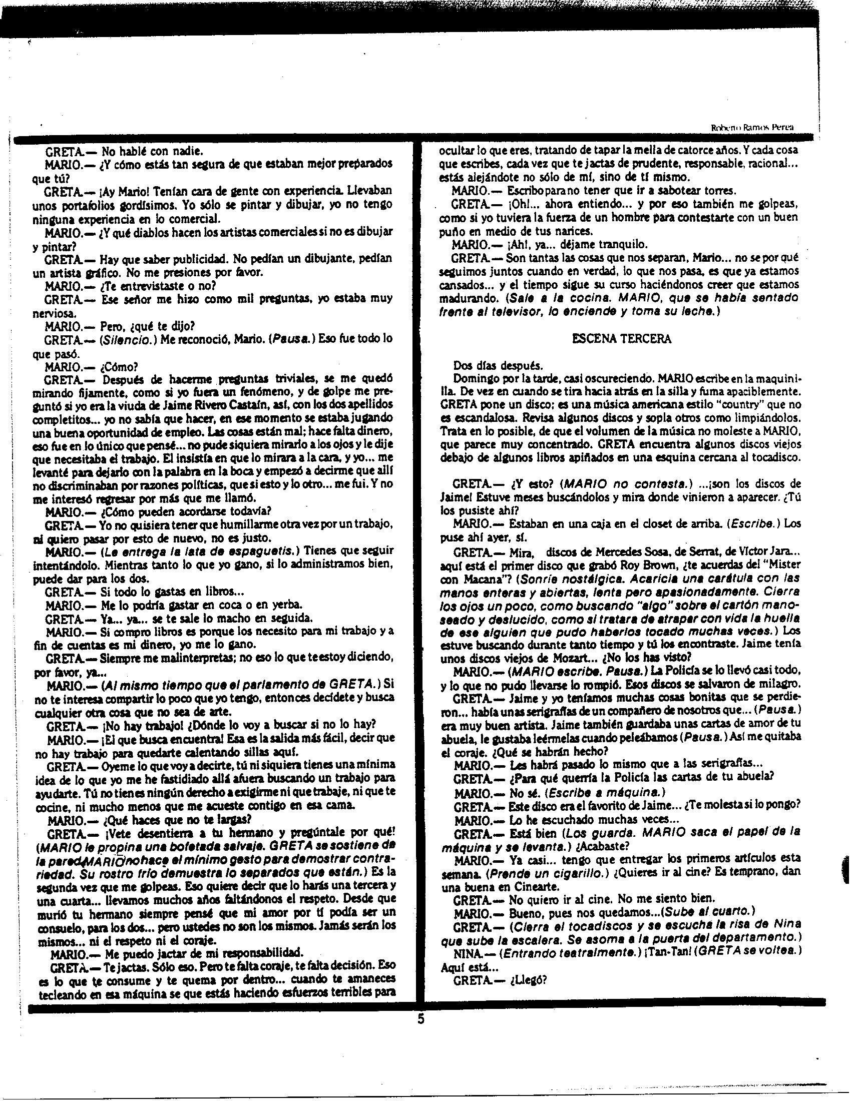 GRETA- (Levantándose.) Voy• hacertealgode comer (Salea la cocina. RICKY se queda soto en escena unos segundos. Luego se levanta. Mira hacia la habitación y luego hacia la cocina, lentamente se dirige a /a puerta-y la abre se escucha el silencio /e/ano en forma de cuchicheo de viento y sonidos lejanos. RICKY ,e agarraal marco y ,e dispone a salir cuando MARIO, que habla salido y lo observaba, lo detiene con la palabra.)