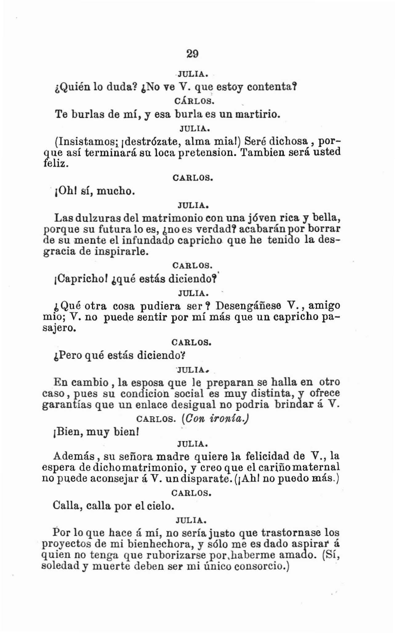 (¡Me ama, me amal) ¿Y dices que desde que llegué de Francia, habrá un mes, está como si tuviese algun pesar que trata de ocultarJlO:;? Tienes razan: BU risa y IlU canto son mera nccion, vana apariencia ... (Por eso se marchó al chmpo, á casa de mi tia, lÍ. poco de mi llegada; por eso esquiva mi presencia husta el punto de no haber podido hablllr con ella lÍ. solas rlespues de mi tegreso ... Ya no lo dudo; me halaga suponerlo.) Jorge, no ignoras que á pesar de todo, he querido y quiero á Julia, como ... á una