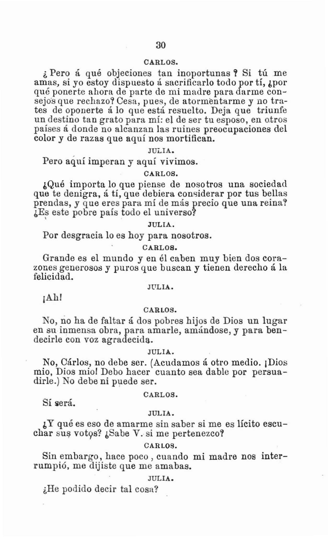 Julia, es menester que vuelvas á tu cama. Vendrán los amos, y si te encuentran aquí yen ese estado: .. la alarma para. el niño Cárlos será mayor. .