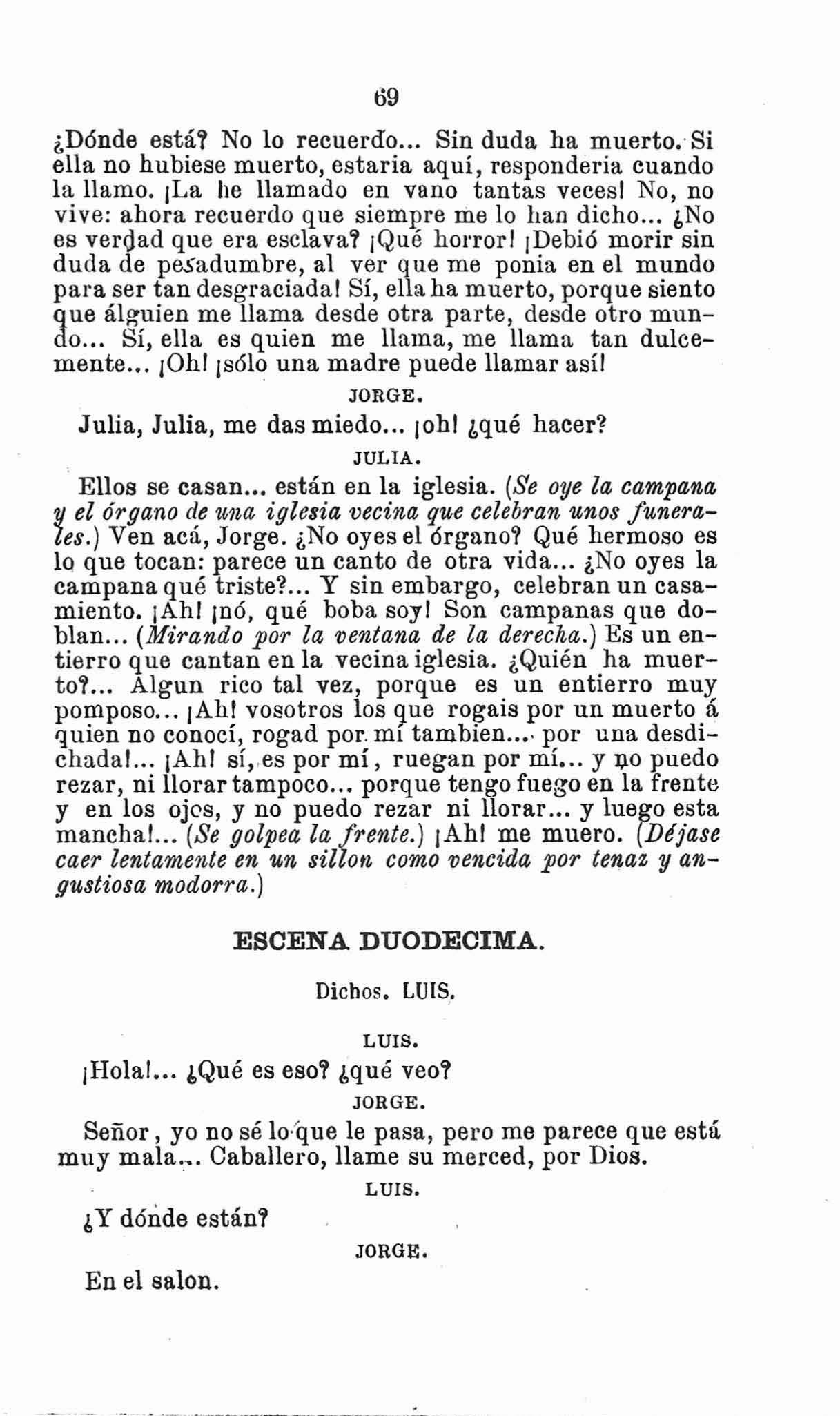 Ellos se casan ... están en la iglesia. (Se oye la campana y el órgano de iglesia vecina que celebran unos funerales.) Ven acá, Jorge. ¿No oyes el órgano? Qué hermoso es lQ que tocan: parece un canto de otra vida ... ¿No oyes la campana qué tristeL. Y sin embargo, celebran un casamiento. ¡Ah! ¡nó. qué boba soyl Son campanas que doblan ... (Mirando por la ventana de la derecha.) Es un entierro que cantan en la vecina iglesia. ¿Quién ha muertaL. Algun rico tal vez, porque es un entierro muy pomposo... ¡Ah! vosotros los gue rogais por un muerto á 'luien no conocí, rogad por. mi tambien .... por una desdichada!. .. ¡Ah! si,.es por mí, ruegan por mí ... y J;l0 puedo rezar, ni llorar tampoco ... porque tengo fuego en la frente y en los ajes, y no puedo rezar ni llorar oO, y lueg:o esta mancha!... (Se golpea la frente.) ¡Ah! me muero. (Déjase caer lentamente en un sillon como ve'Jcida por tenaz y angustiosa modorra.)