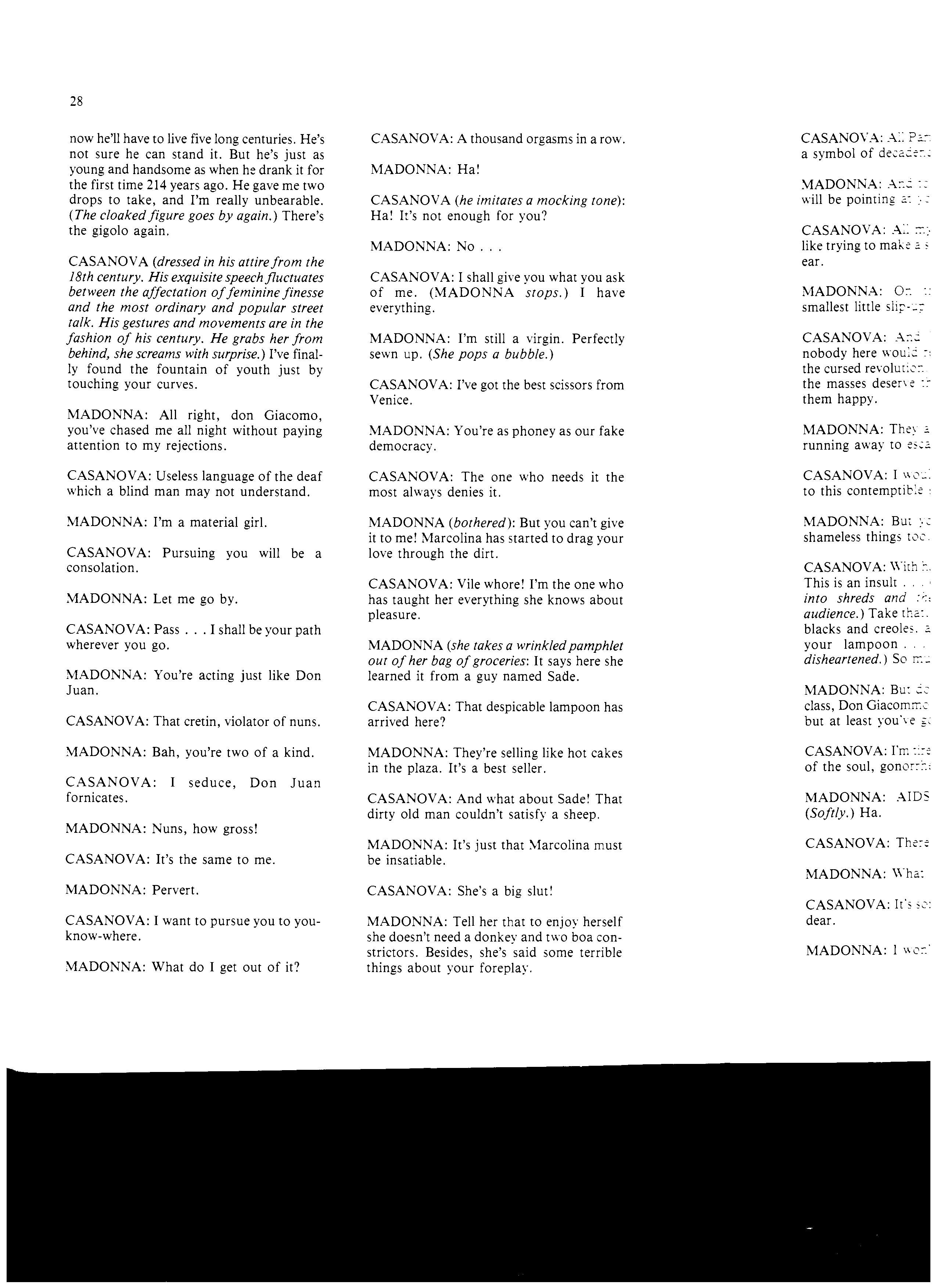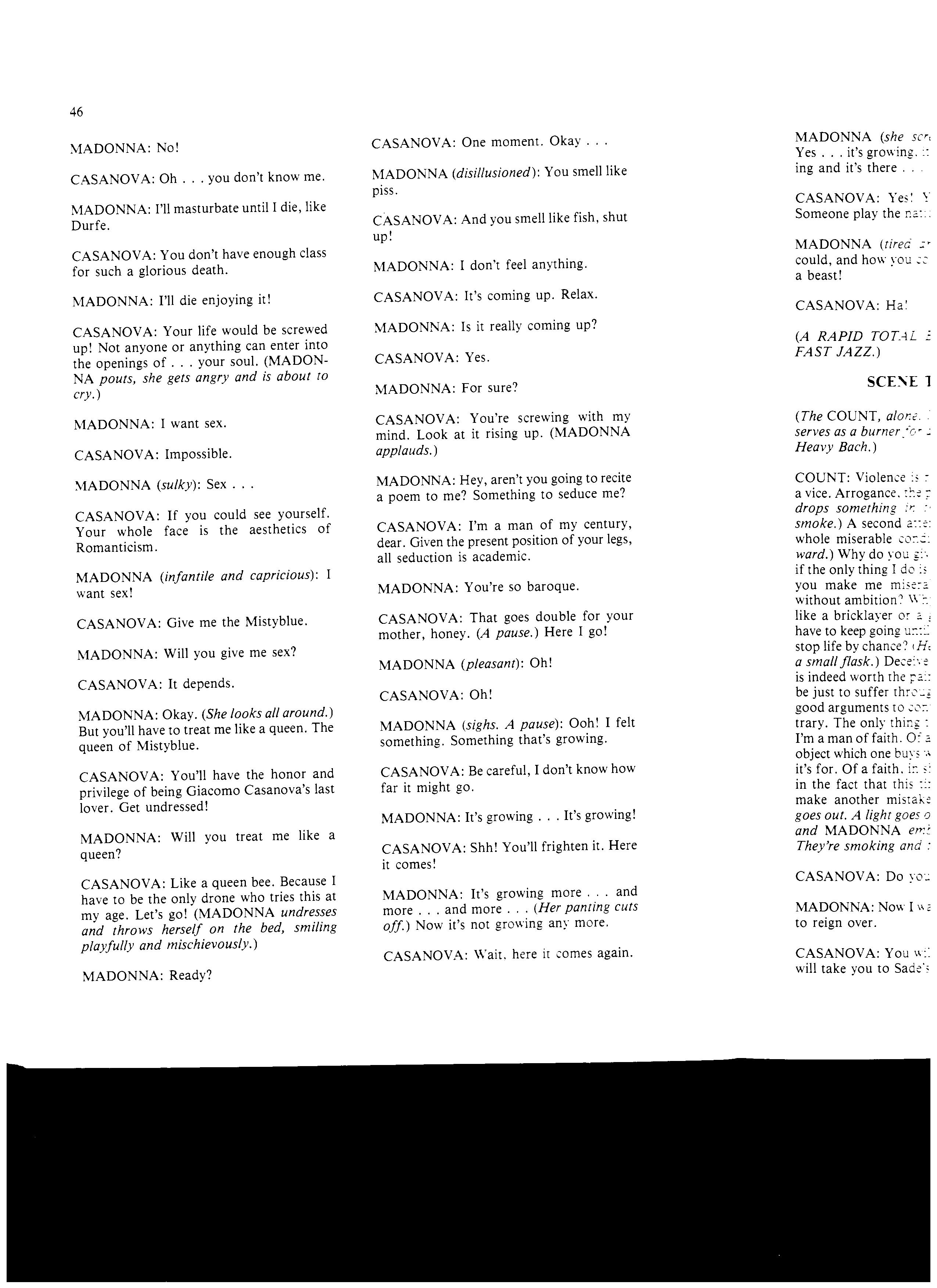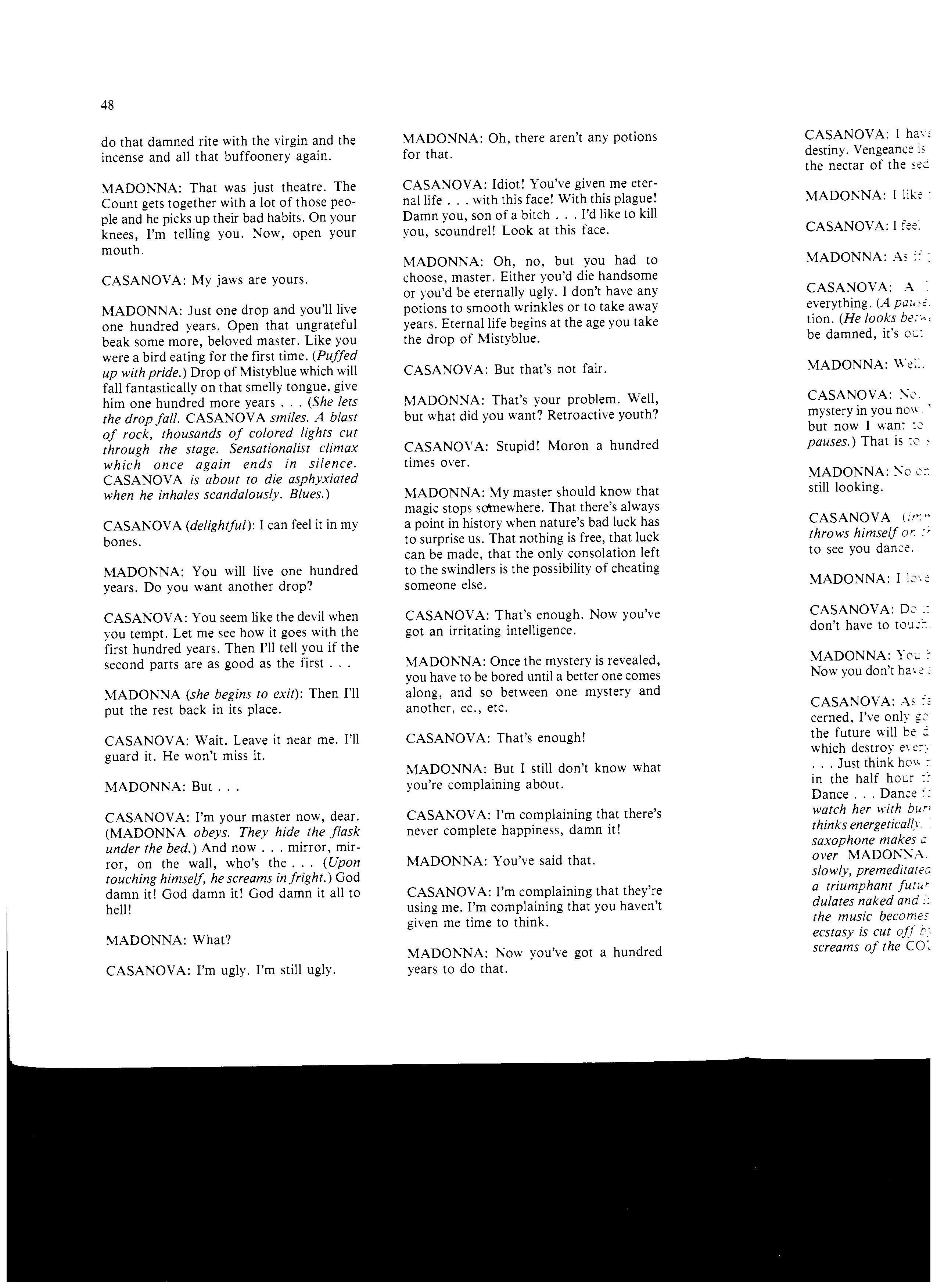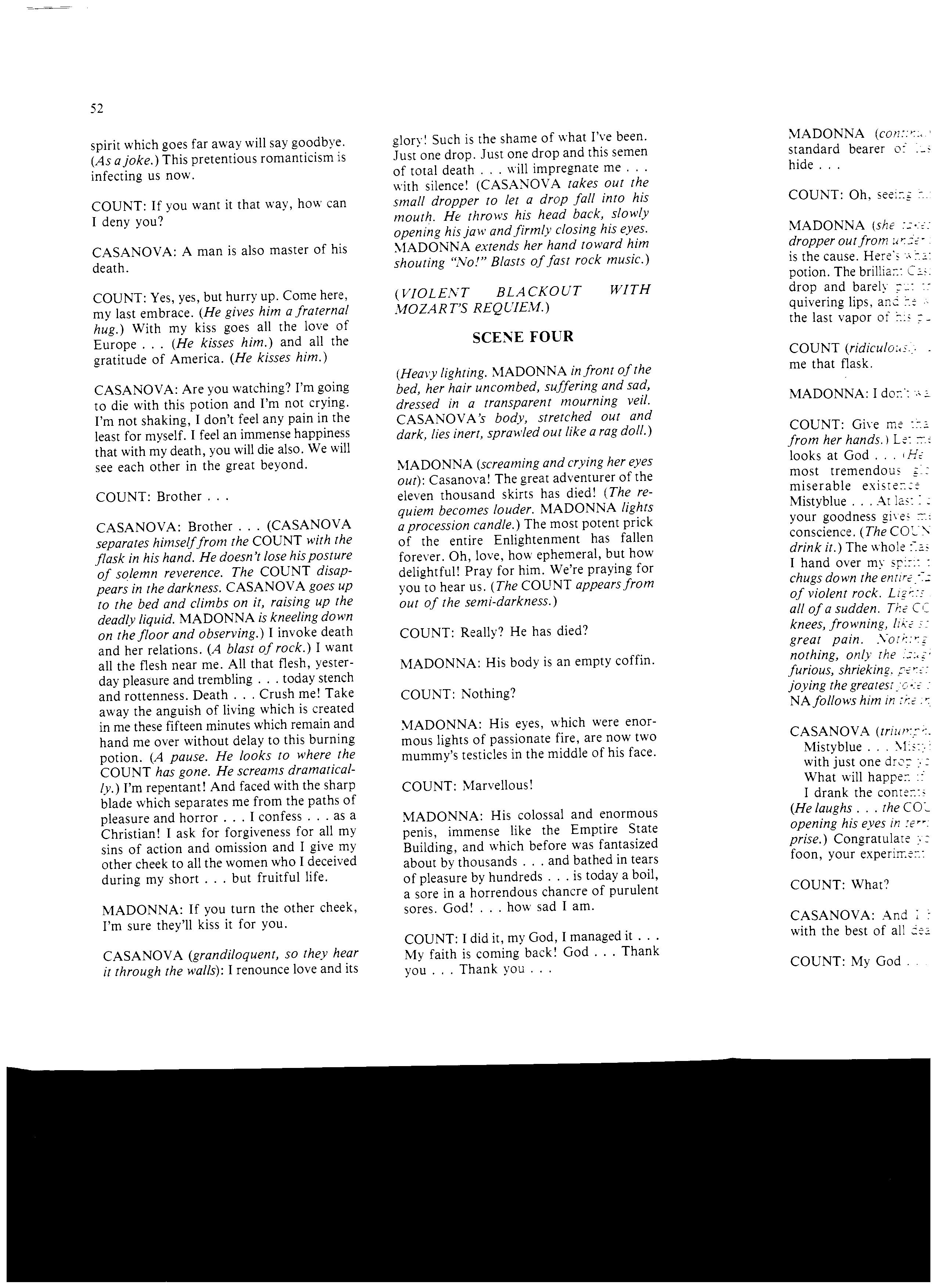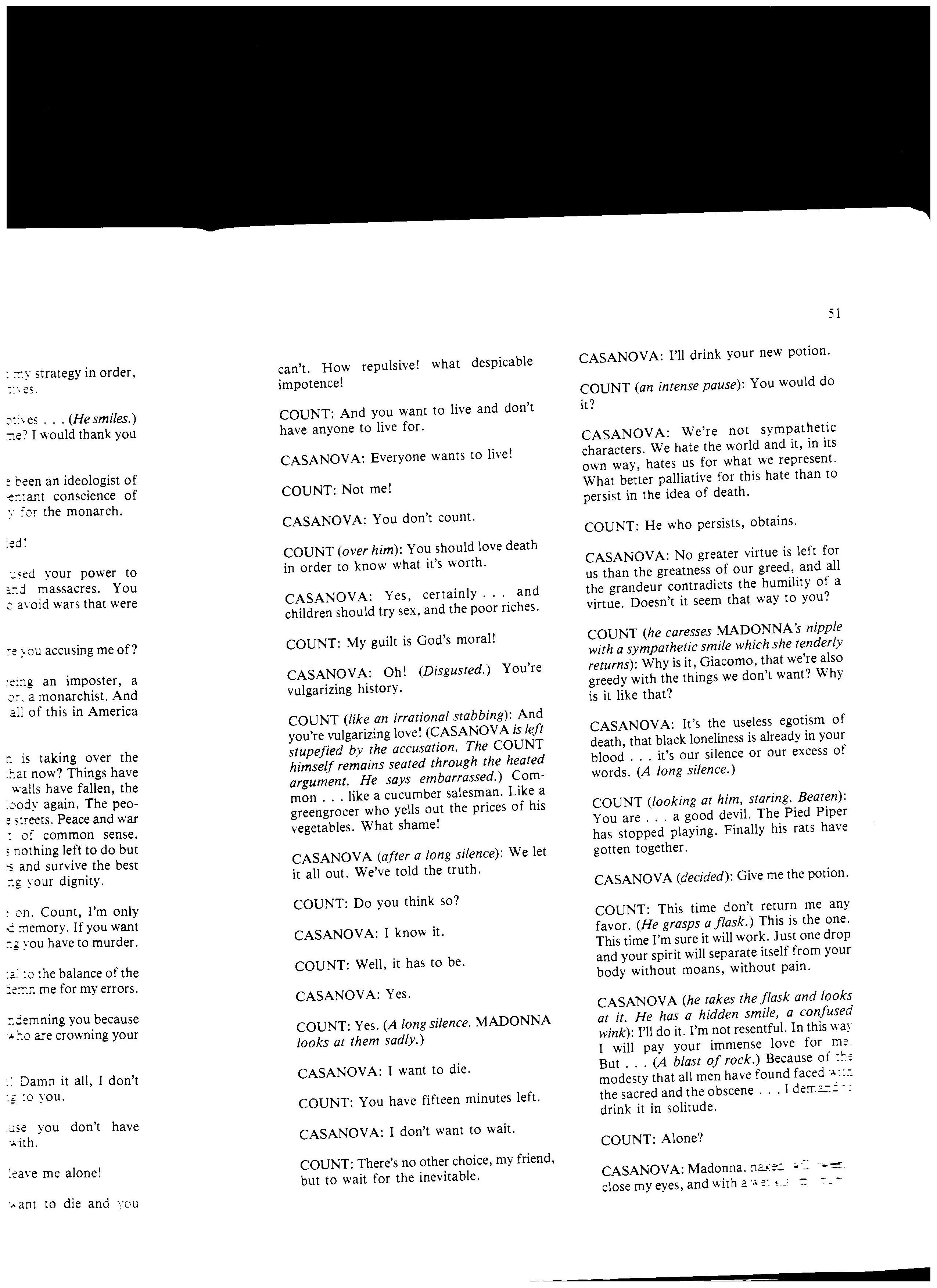 Casanova ... eight, seven ... Envy me, Count. Look how I'm dying, look how hapPY I'm dying ... Oh, and with what pleasure I'm rotting! Four, three ... goodbye, foul and beautiful world two and I'm dying! (A long silence. A blast of rock music. Nothing happens. CASANOVA once again releases his boiling belly laugh. He celebrates, infecting MADONNA with his happiness, who kisses him like an amused child.)
