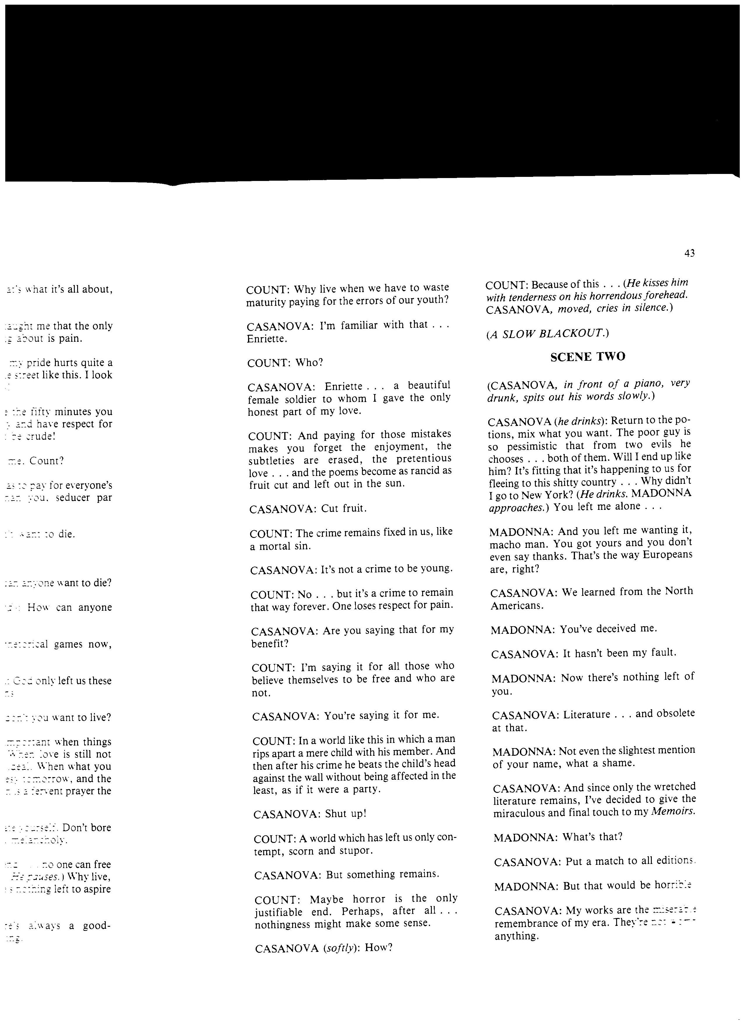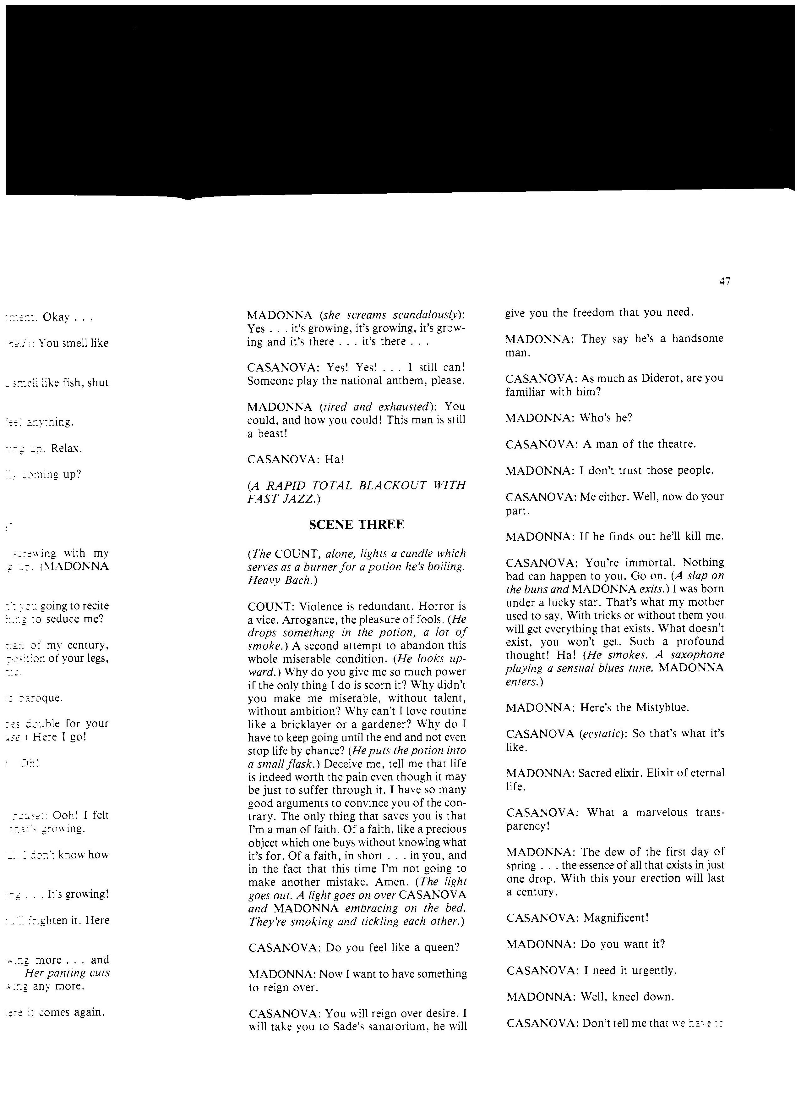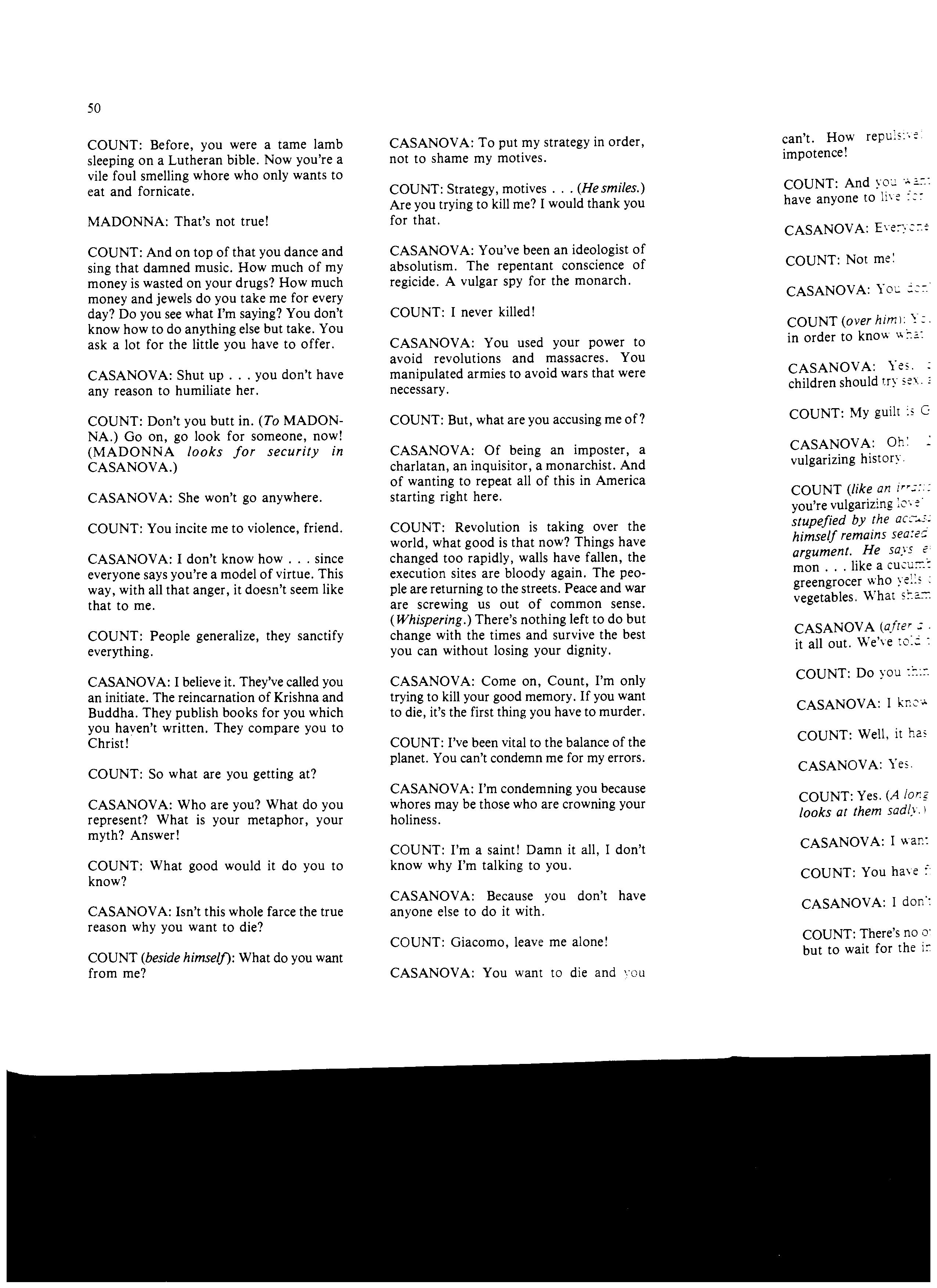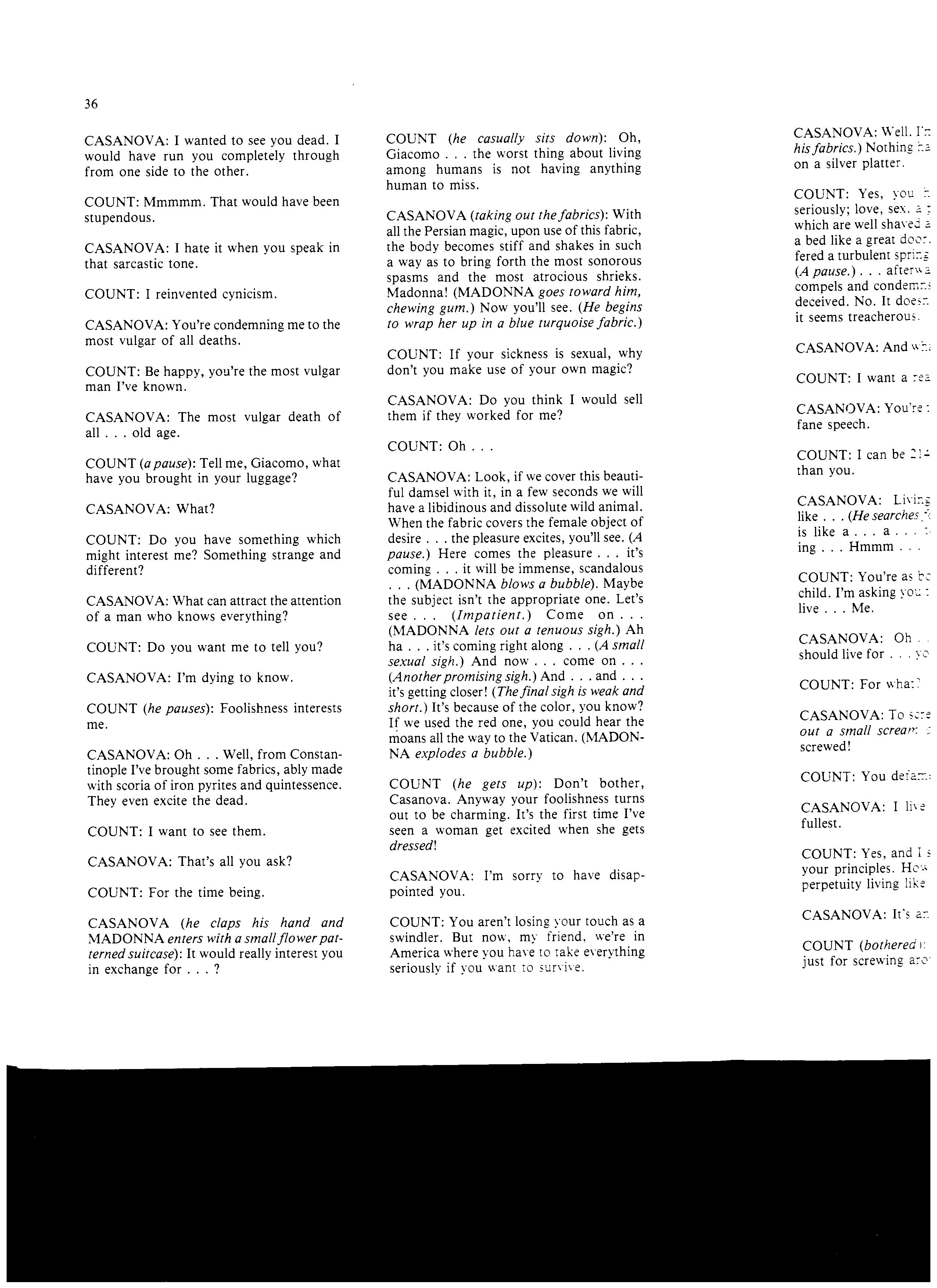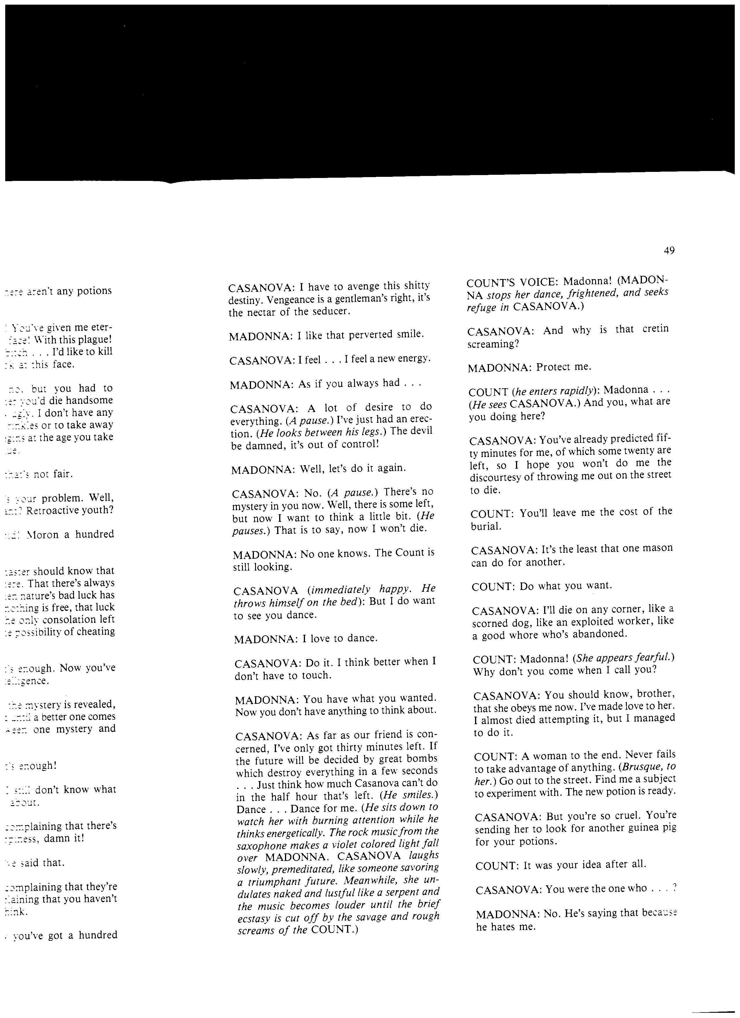 Casanova ... eight, seven ... Envy me, Count. Look how I'm dying, look how hapPY I'm dying ... Oh, and with what pleasure I'm rotting! Four, three ... goodbye, foul and beautiful world two and I'm dying! (A long silence. A blast of rock music. Nothing happens. CASANOVA once again releases his boiling belly laugh. He celebrates, infecting MADONNA with his happiness, who kisses him like an amused child.)