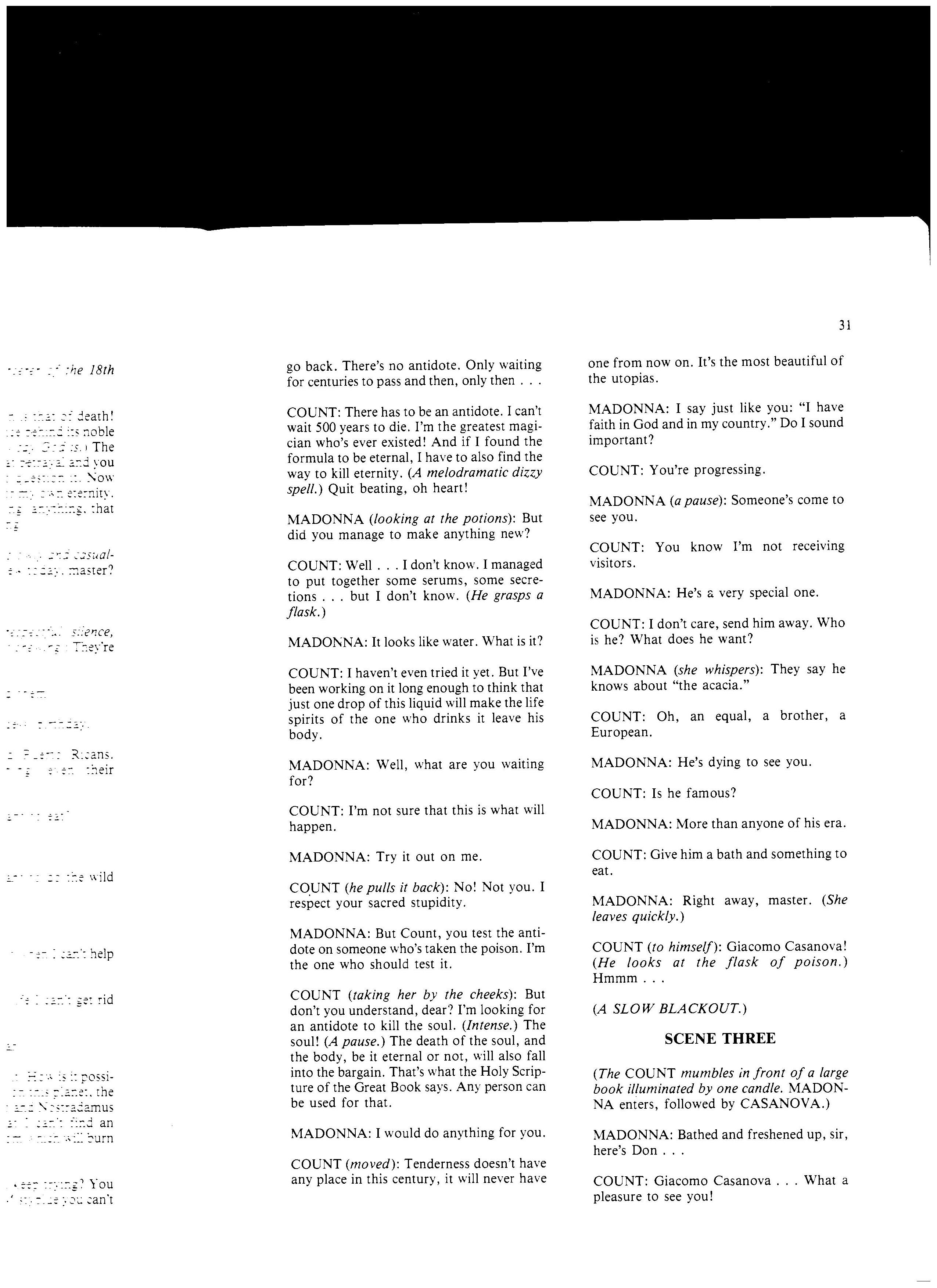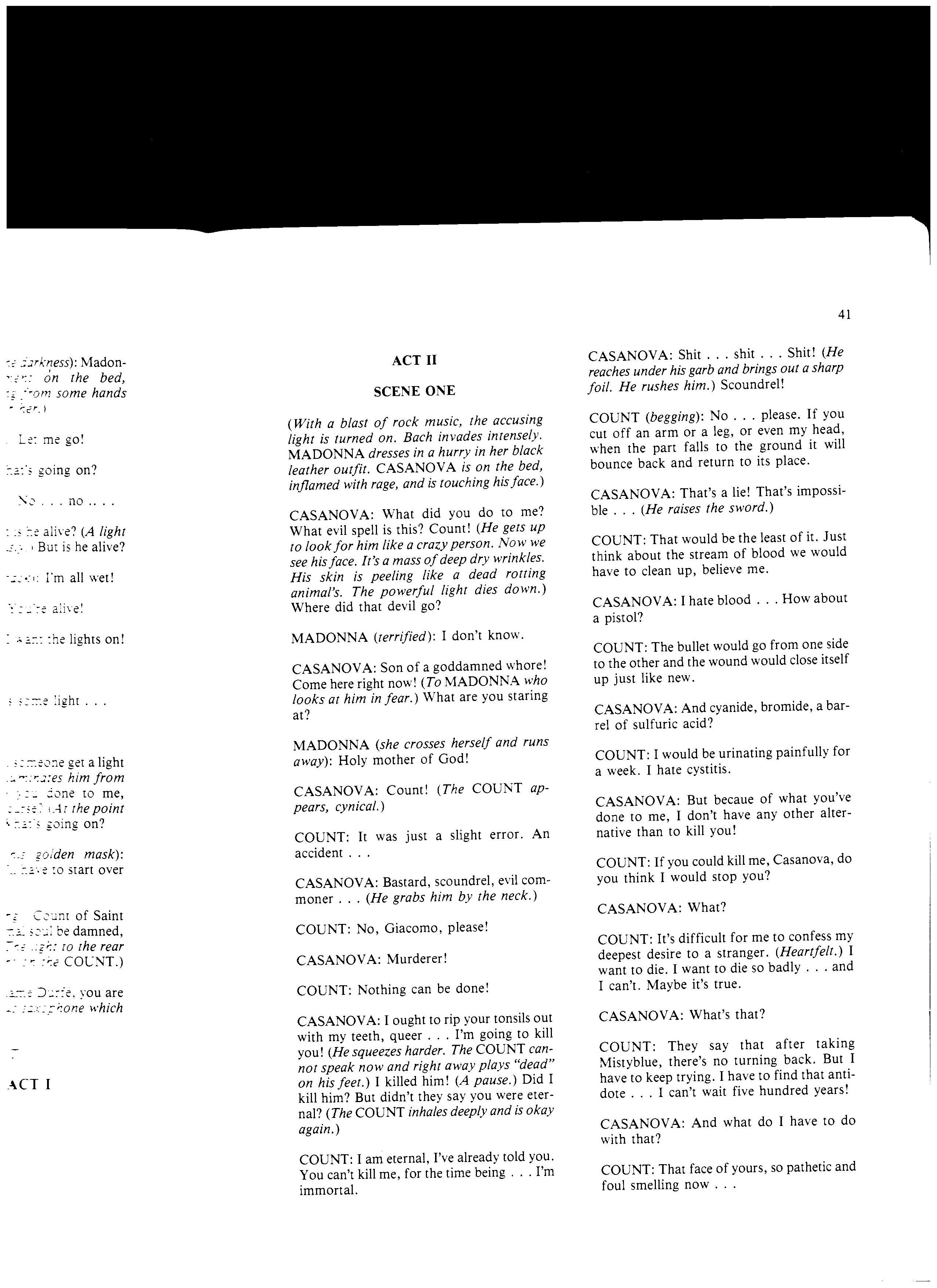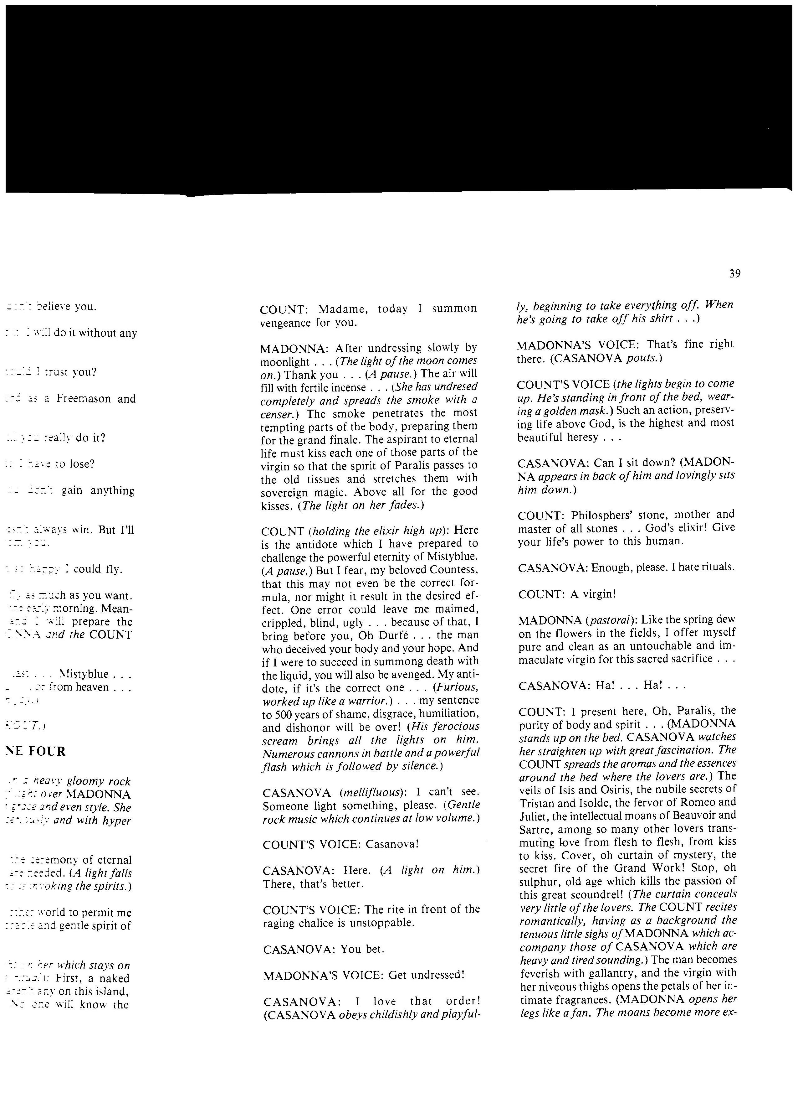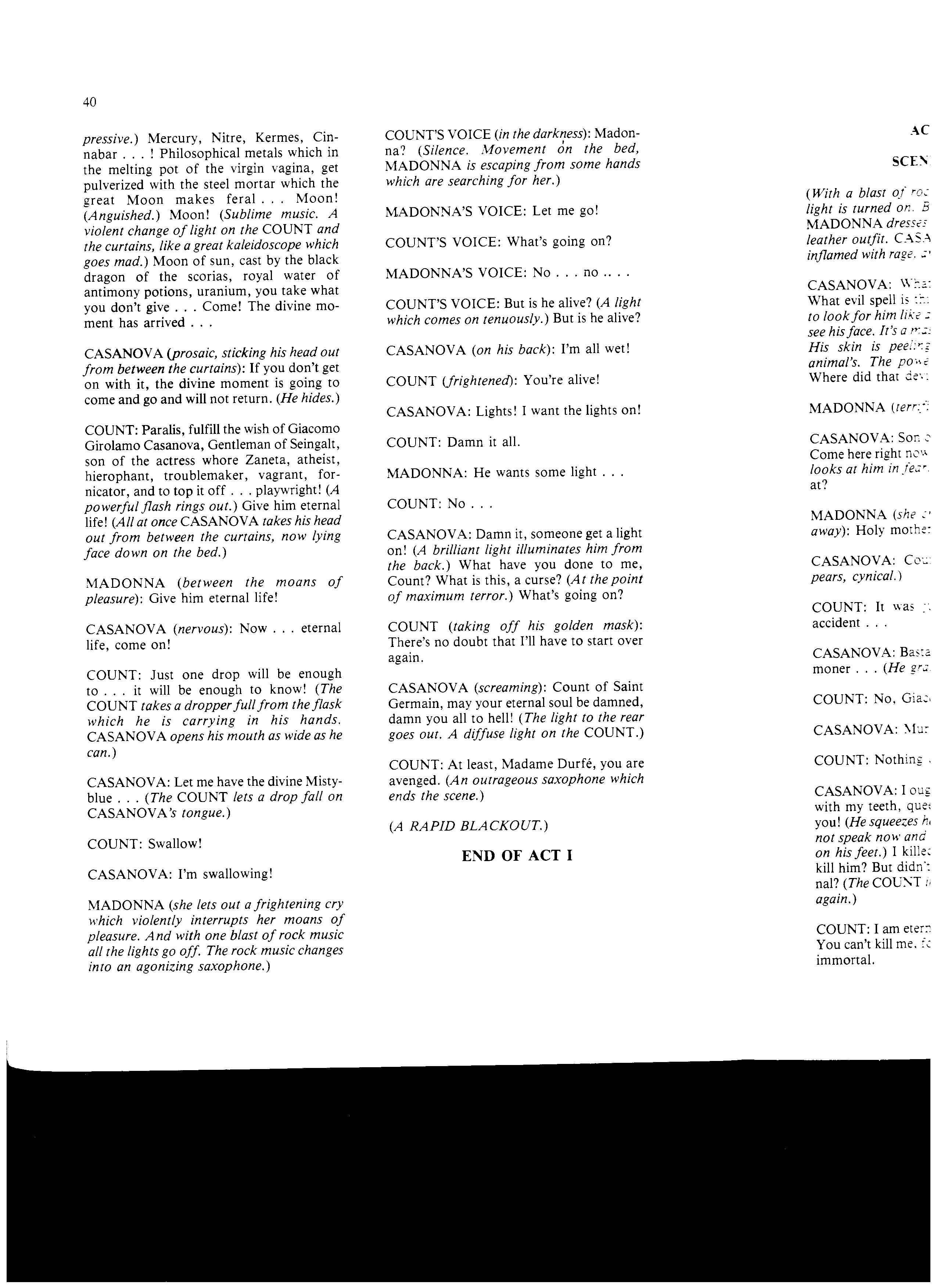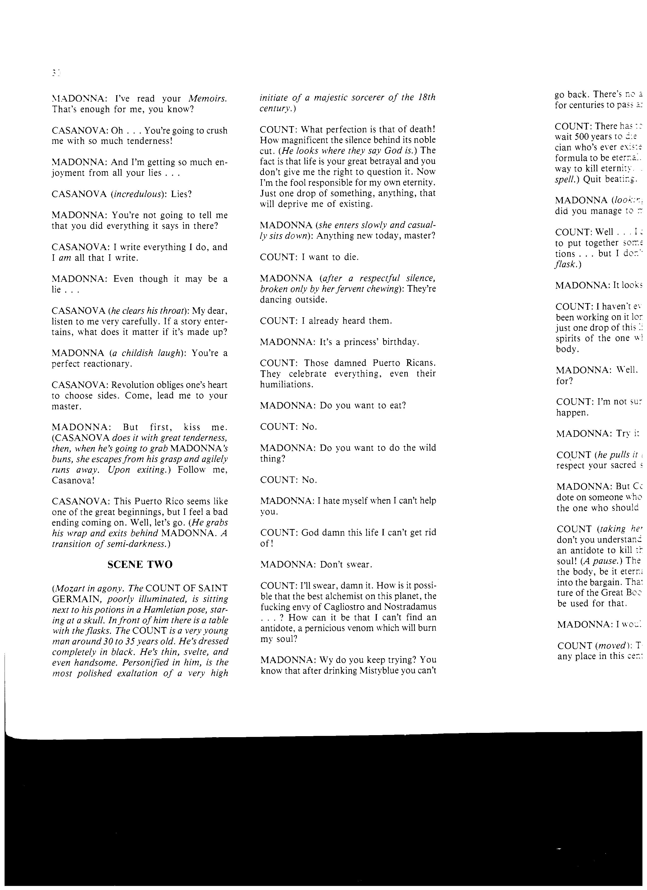 Casanova ... eight, seven ... Envy me, Count. Look how I'm dying, look how hapPY I'm dying ... Oh, and with what pleasure I'm rotting! Four, three ... goodbye, foul and beautiful world two and I'm dying! (A long silence. A blast of rock music. Nothing happens. CASANOVA once again releases his boiling belly laugh. He celebrates, infecting MADONNA with his happiness, who kisses him like an amused child.)