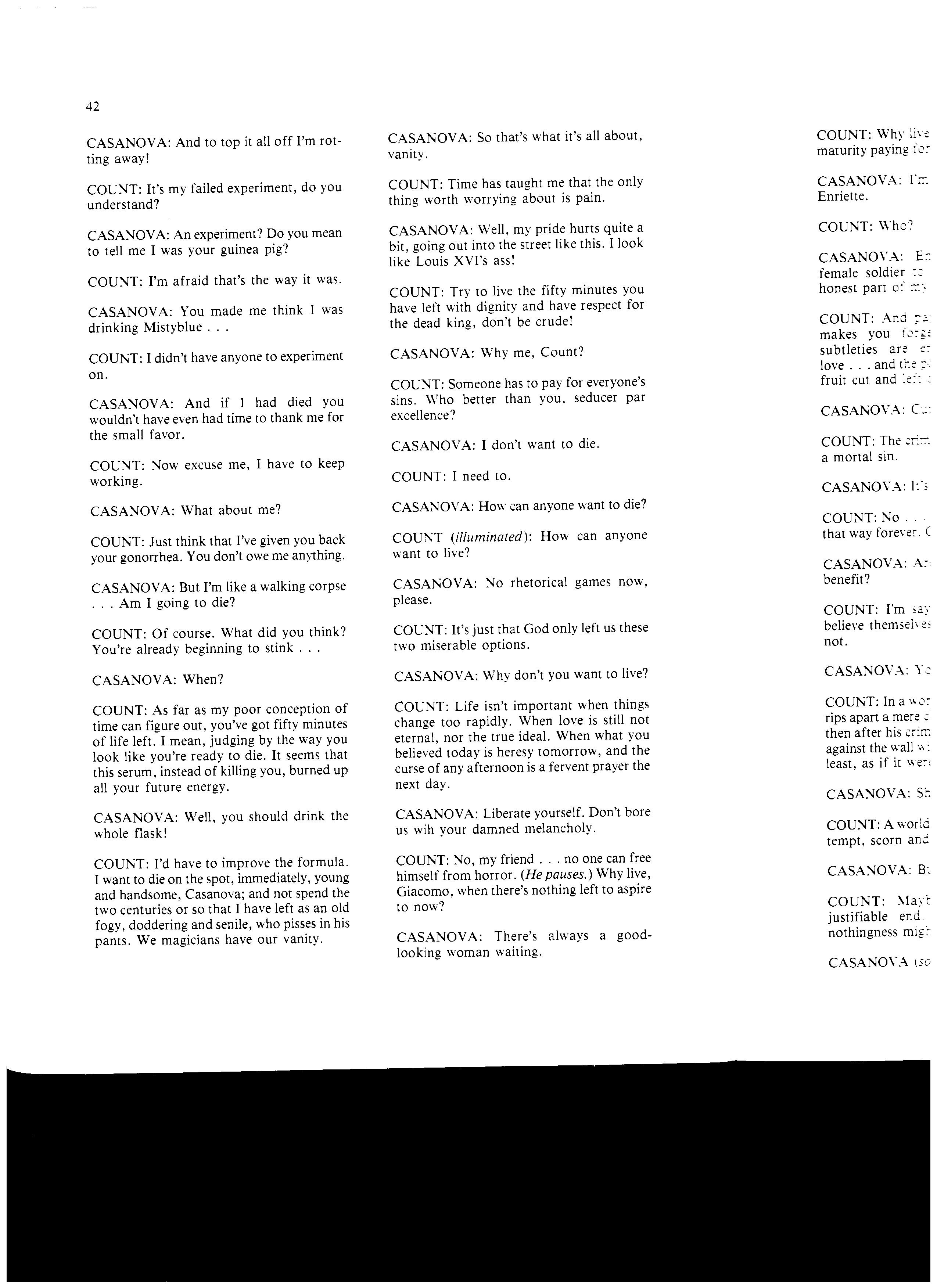 CASANOVA: It's the useless egotism of death, that black loneliness is already in your blood ... it's our silence or our excess of words. (A long silence.)