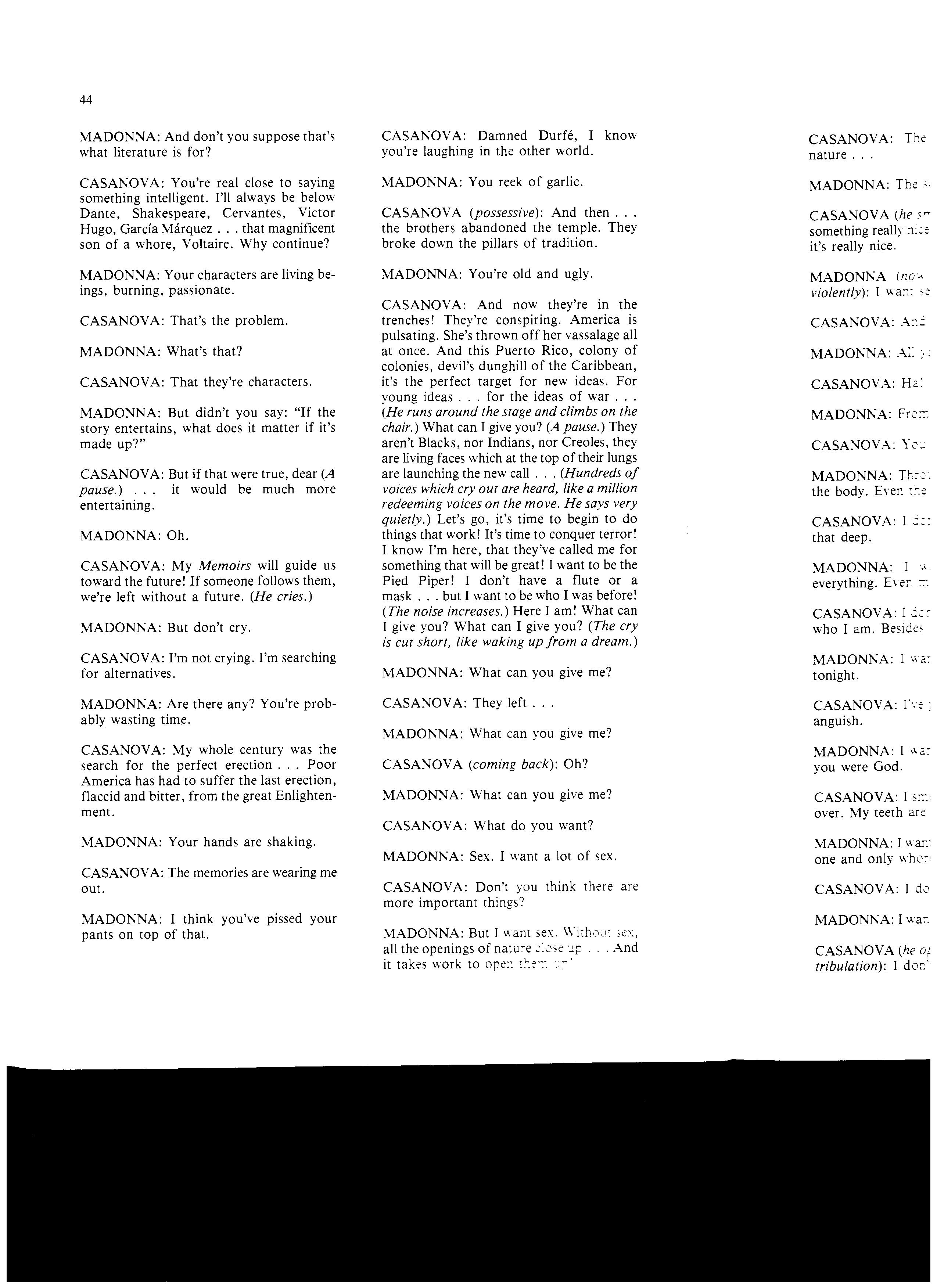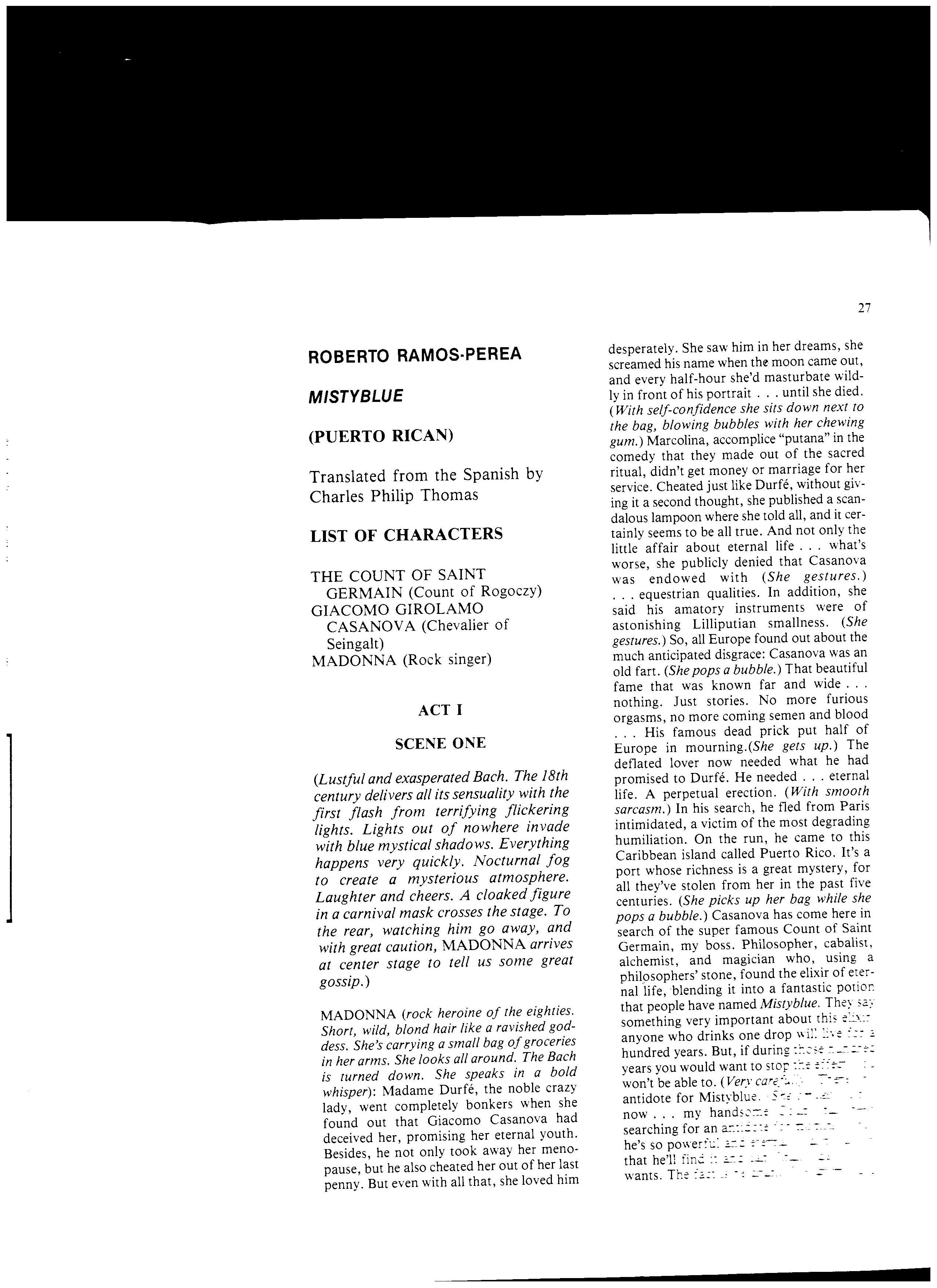 desperately. She saw him in her dreams, she screamed his name when the moon came out, and every half-hour she'd masturbate wildly in front of his portrait until she died. (With self-confidence she sits down next to the bag, blowing bubbles with her chewing gum.) Marcolina, accomplice "putana" in the comedy that they made out of the sacred ritual, didn't get money or marriage for her service. Cheated just like Durfe, without giving it a second thought, she published a scandalous lampoon where she told all, and it certainly seems to be all true. And not only the little affair about eternal life what's worse, she publicly denied that Casanova was endowed with (She gestures.) ... equestrian qualities. In addition, she said his amatory instruments were of astonishing Lilliputian smallness. (She gestures.) So, all Europe found out about the much anticipated disgrace: Casanova was an old fart. (She pops a bubble.) That beautiful fame that was known far and wide nothing. Just stories. No more furious orgasms, no more coming semen and blood . . . His famous dead prick put half of Europe in mourning.(She gets up.) The deflated lover now needed what he had promised to Durfe. He needed . . . eternal life. A perpetual erection. (With smooth sarcasm.) In his search, he fled from Paris intimidated, a victim of the most degrading humiliation. On the run, he came to this Caribbean island called Puerto Rico. It's a port whose richness is a great mystery, for all they've stolen from her in the past five centuries. (She picks up her bag while she pops a bubble.) Casanova has come here in search of the super famous Count of Saint Germain, my boss. Philosopher, cabalist, alchemist, and magician who, using a philosophers' stone, found the elixir of eternal life, blending it into a fantastic potior: that people have named Mistyblue. They something very important about thi5 anyone who drinks one drop \\ i:: ::., :: :: .:. hundred years. But, if years you would want to Sto!' won't be able to. (Very ca'.:_··-... antidote for Misty blue. S ::c now my : __ : searching for an a::::.::::---:: -he's so .:.::.: :·:-:_ that he'll fin.: :: .:.:: : wants. The :.:.:: _, -: :.·