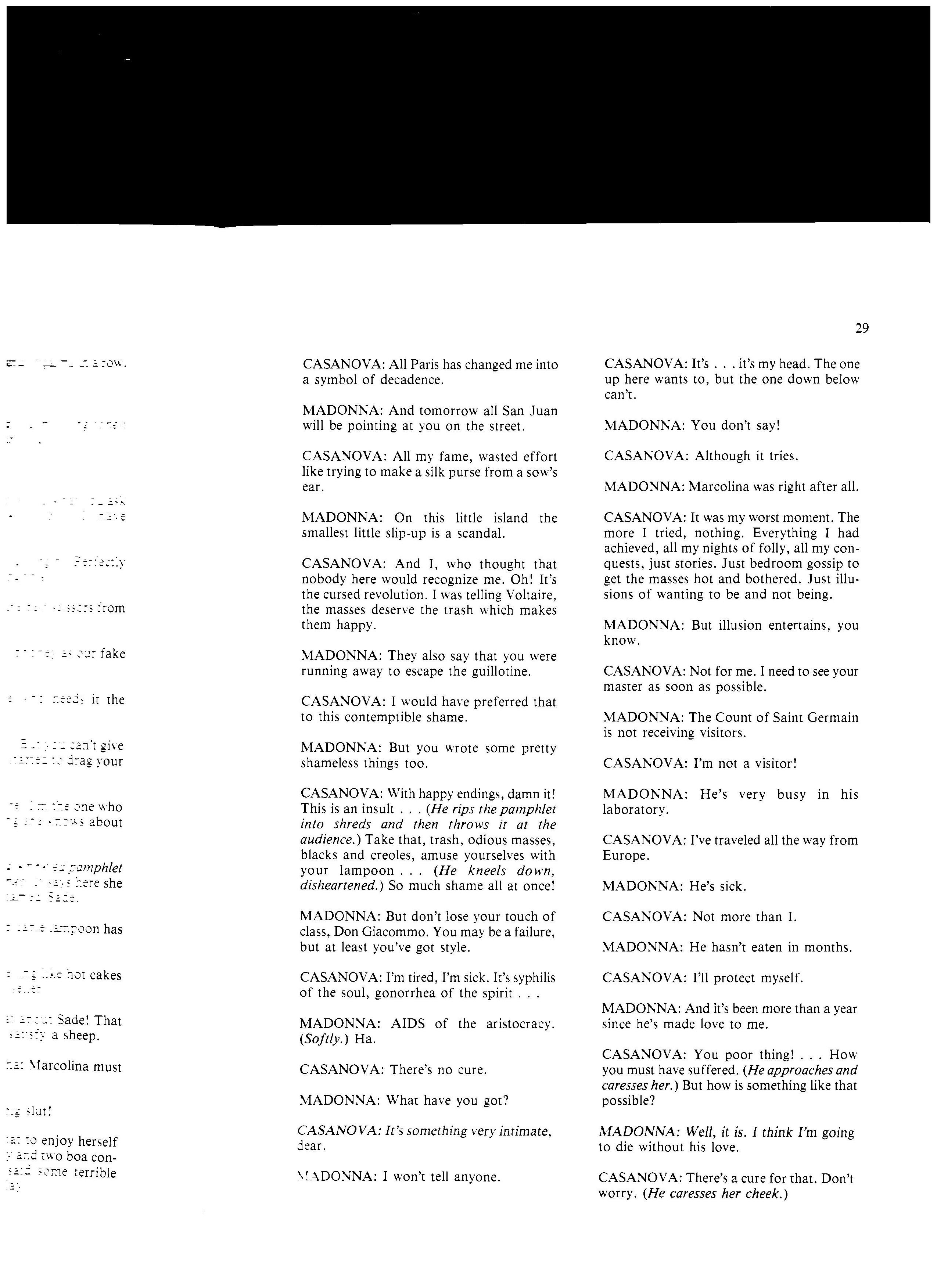 CASANOVA: With happy endings, damn it! This is an insult ... (He rips the pamphlet into shreds and then throws it at the audience.) Take that, trash, odious masses, blacks and creoles, amuse yourselves with your lampoon . . . (He kneels dovm, disheartened.) So much shame all at once!