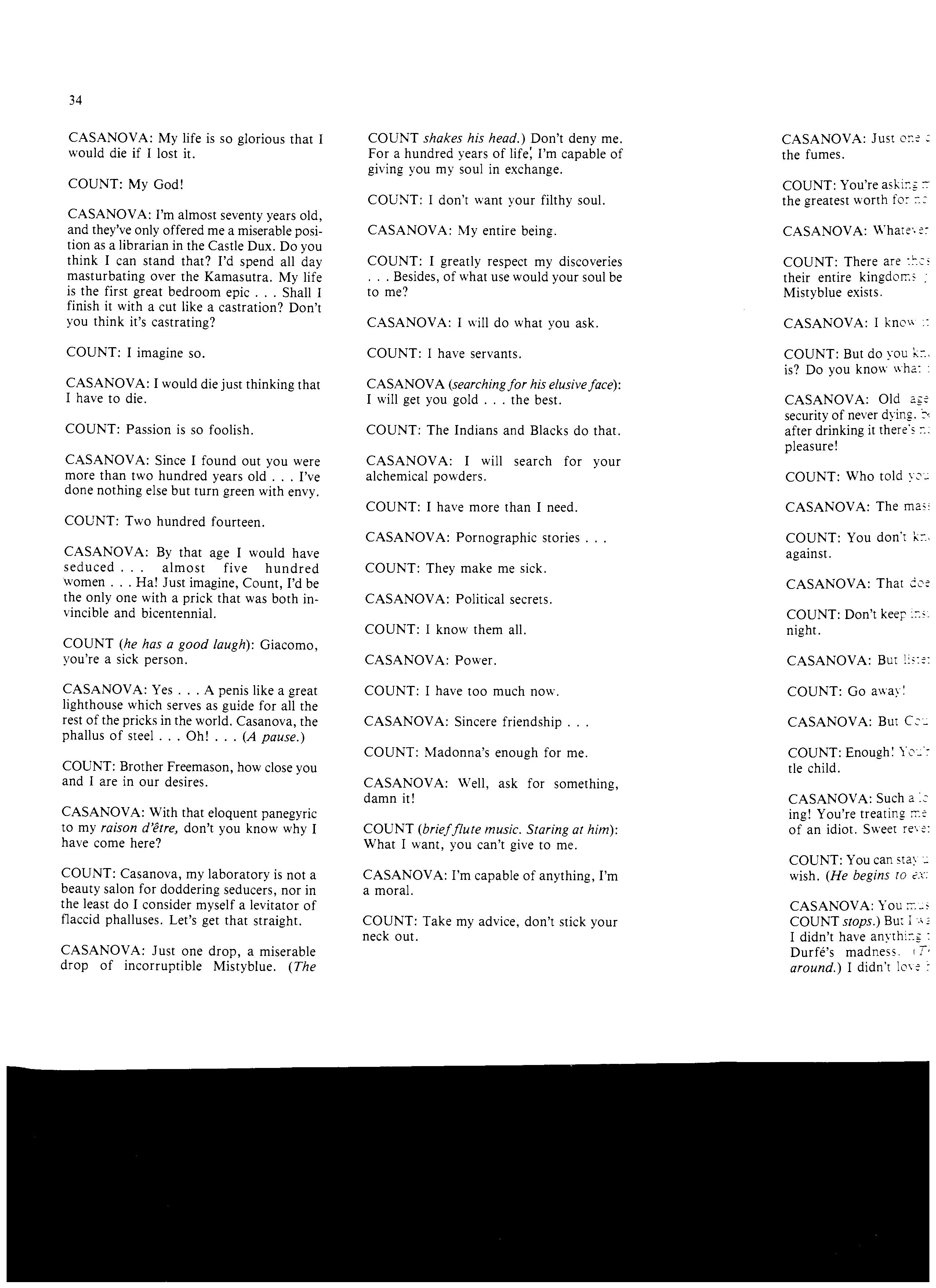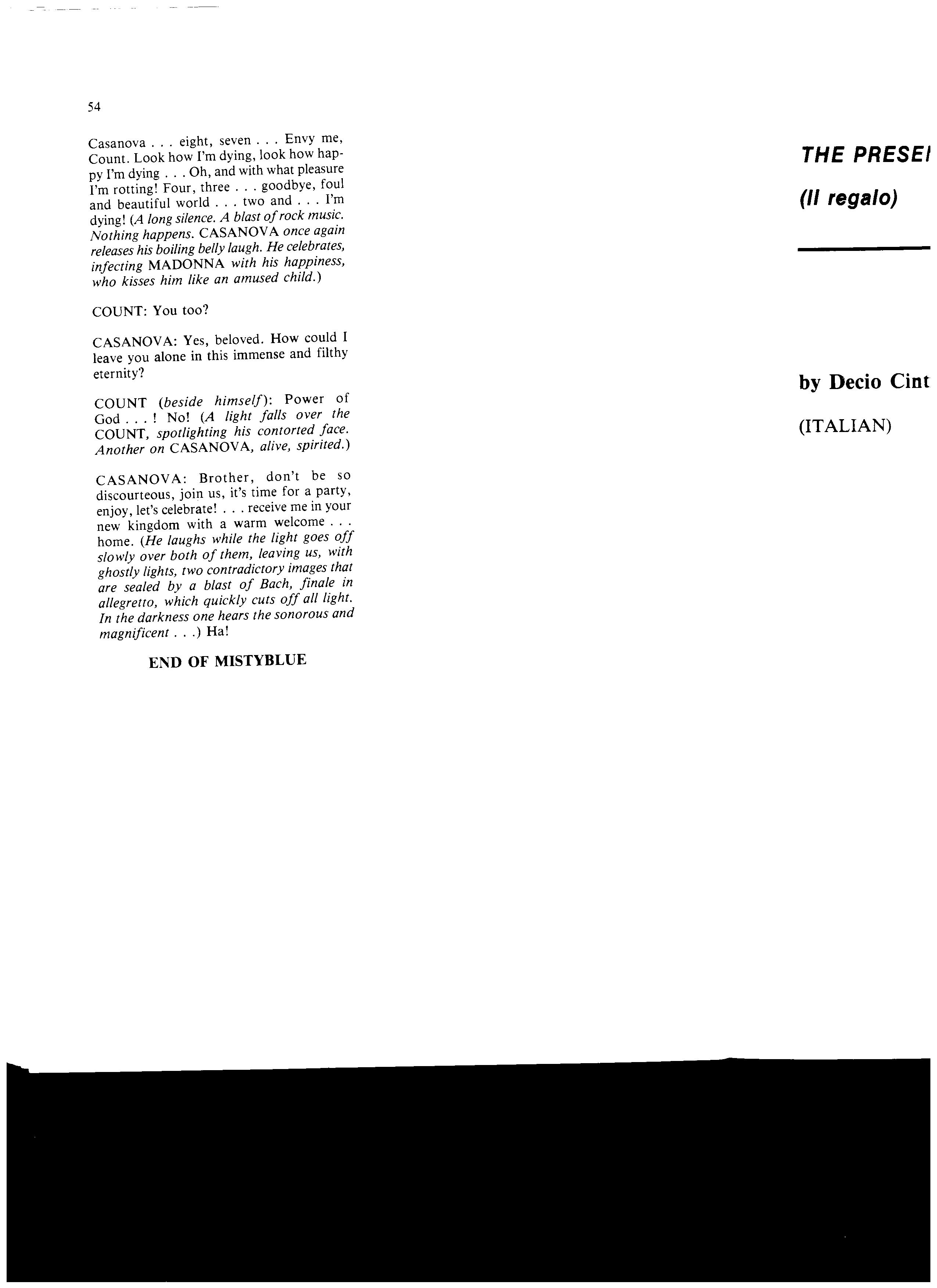 COUNT: Give me that! (He wrenches it from her hands.) Let me look at you as one looks at God (He kneels.) This is the most tremendous glory of my whole miserable existence . . . I conquered Mistyblue At last I can At last God, your goodness gives me the silence of my conscience. (The COUNT raises the flask to drink it.) The whole flask in one gulp! God! I hand over my spirit to your hands! (He chugs down the entire flask. Successive blasts of violent rock. Lights and effects. Silence all of a sudden. The COUNT is still, on his knees, frowning, like someone who expects great pain. Nothing nothing nothing, only the laugh of CASANOVA, furious, shrieking, penetrating, mocking, enjoying the greatest joke of his life. MADONNAfollows him in the inflamed belly laugh.)