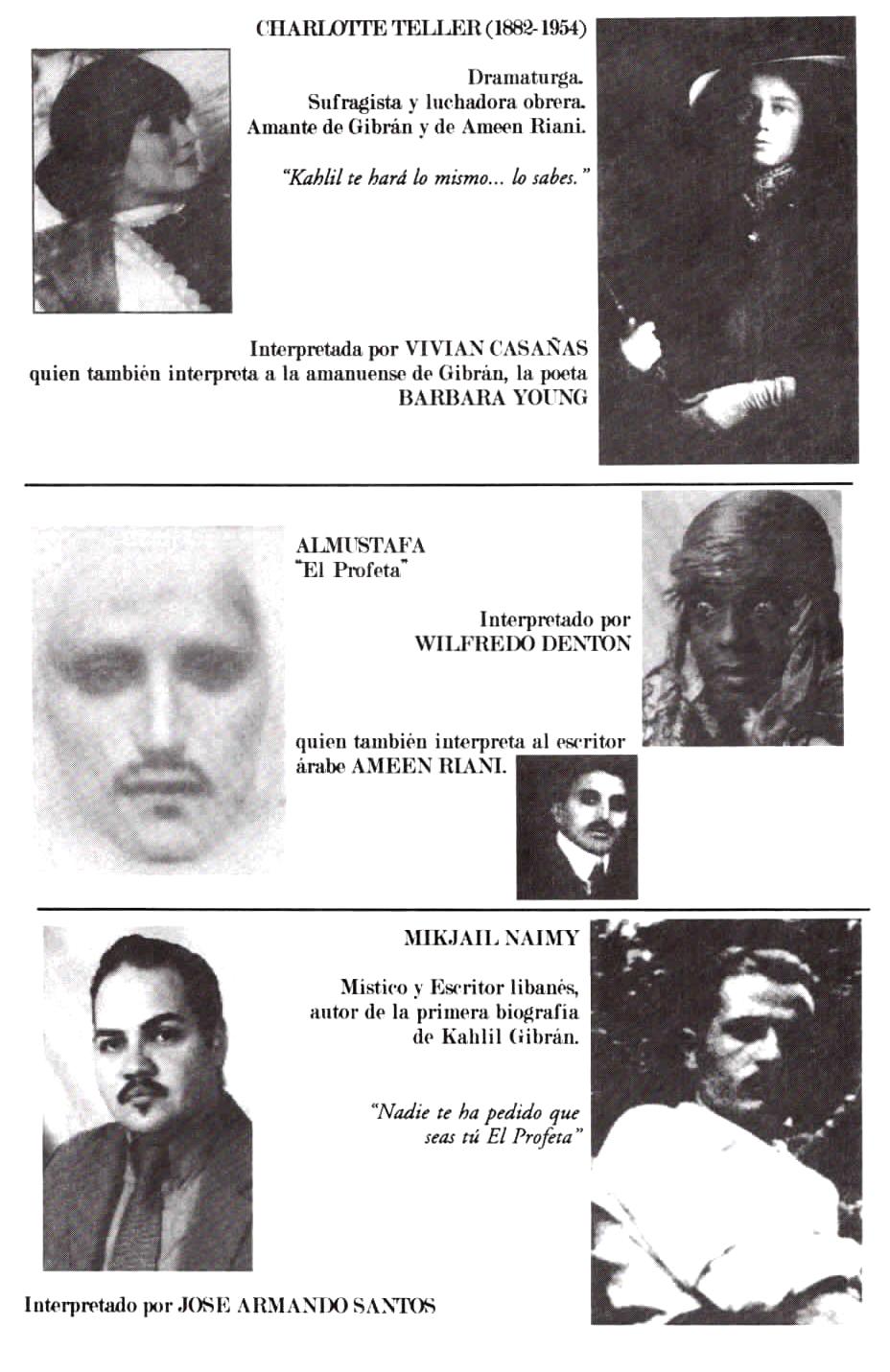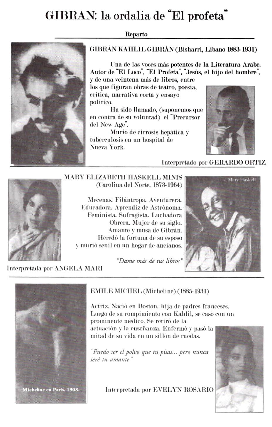 Micheline, Charlotte y Mary. La biografía que sirvió de base para nuestro trabajo lo fue Kahlil Gibrán: a biography escrita por su mejor amigo, Mikhail Naimy (1939) y las más recientes Kahlil Gibran: His Life and World escrita por sus sobrinos Jean y Kahlil Gibran (1998), Kahlil Gibran: Man and Poet de Suheil Bushrui (1998) y Prophet: The Life and Times of Kahlil Gibran de Robin Waterfield (1998). A los seguidores de su obra les recomendamos la película TheBrokenWings, sobre la novela de Gibrán, una de las joyas del cine Libanés, filmada en la década del sesenta.
