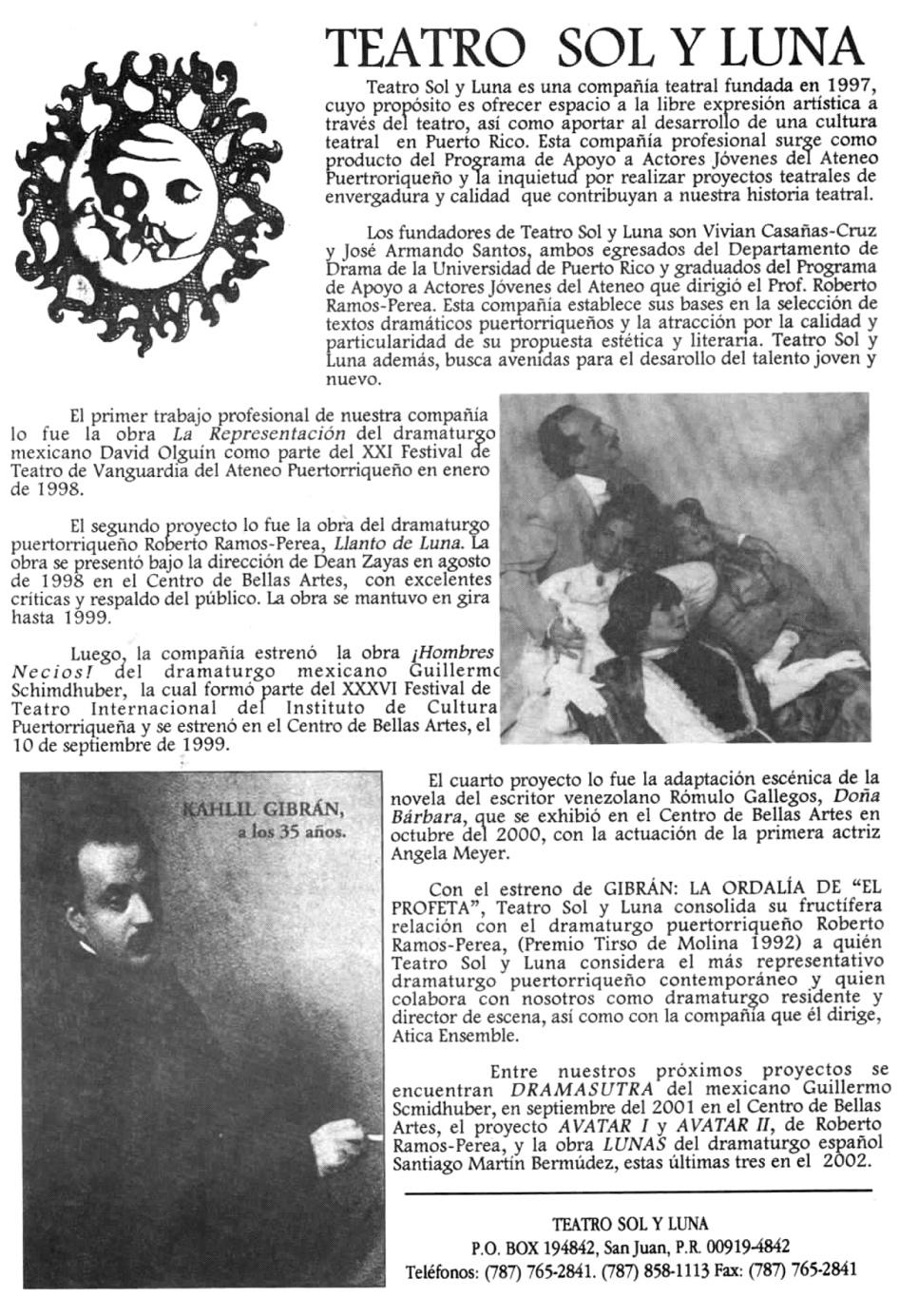 xiv La obra se estrenó el 23 de marzo 2001 por la compañía Teatro Sol y Luna en el Teatro del Ateneo de San Juan, Puerto Rico, con la actuación de los siguientes: primer actor Gerardo Ortiz como Kahlil Gibrán; Angela Mari, Evelyn Rosario, Vivian Casañas-Cruz, Willie Denton y José Armando Santo. Es el mismo grupo de trabajo que hace un año llevó a escena la exitosa obra Avatar: los años perdidos de Jesús .(De libros y autores, 21 march 2001)