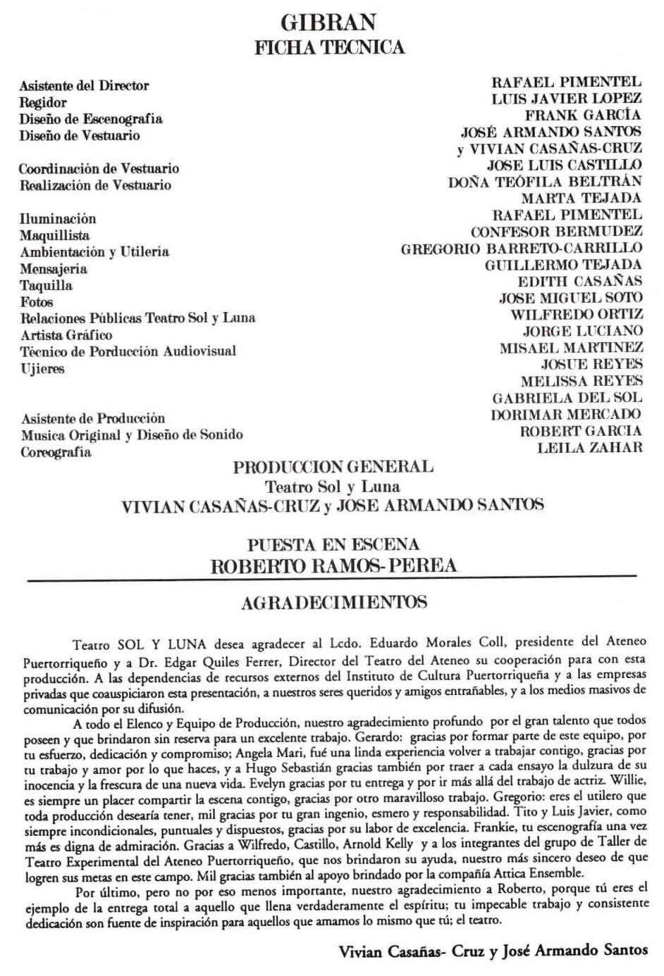 Los soluneros, Vivan y Armando, no llegan por primera vez en el barco de Orfalis. Vienen conmigo en el entusiasmo de hacer teatro que valga la pena en un país donde teatro es cualquier cosa. Gracias desde lo más hondo del corazón, porque en ellos encuentro amigos. Amigos y cómplices de los que lo son de veras, además de excelentes actores y profesionalísimos productores. Los demás chicos de producción, venimos desde el milagro de Avatar con grandes expectativas. Todos, los de Avatar y los de Gibrán , todos que son uno, sabemos que el teatro tiene la ineludible misión de abrir en dos el alma. Hasta ahora, nuestra alma sigue sangrando de este extásis de poesía y espiritualidad.