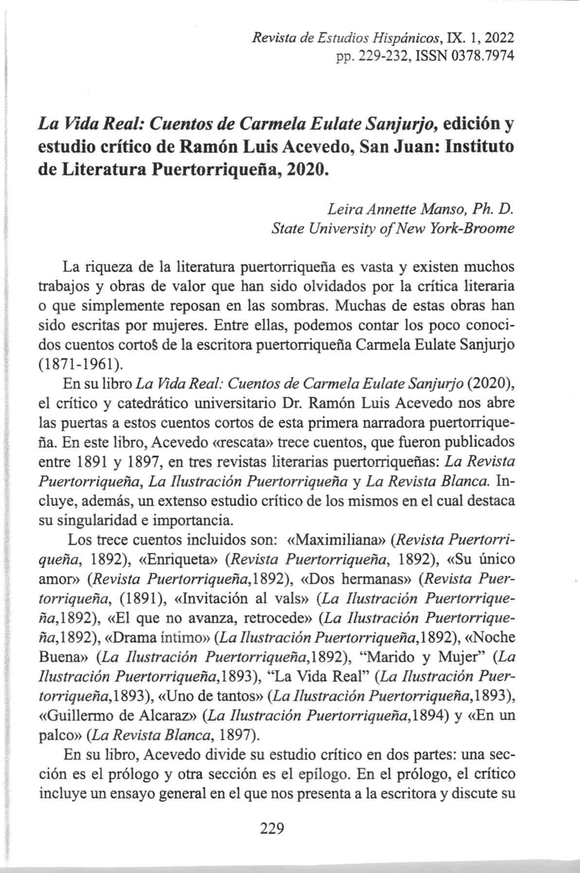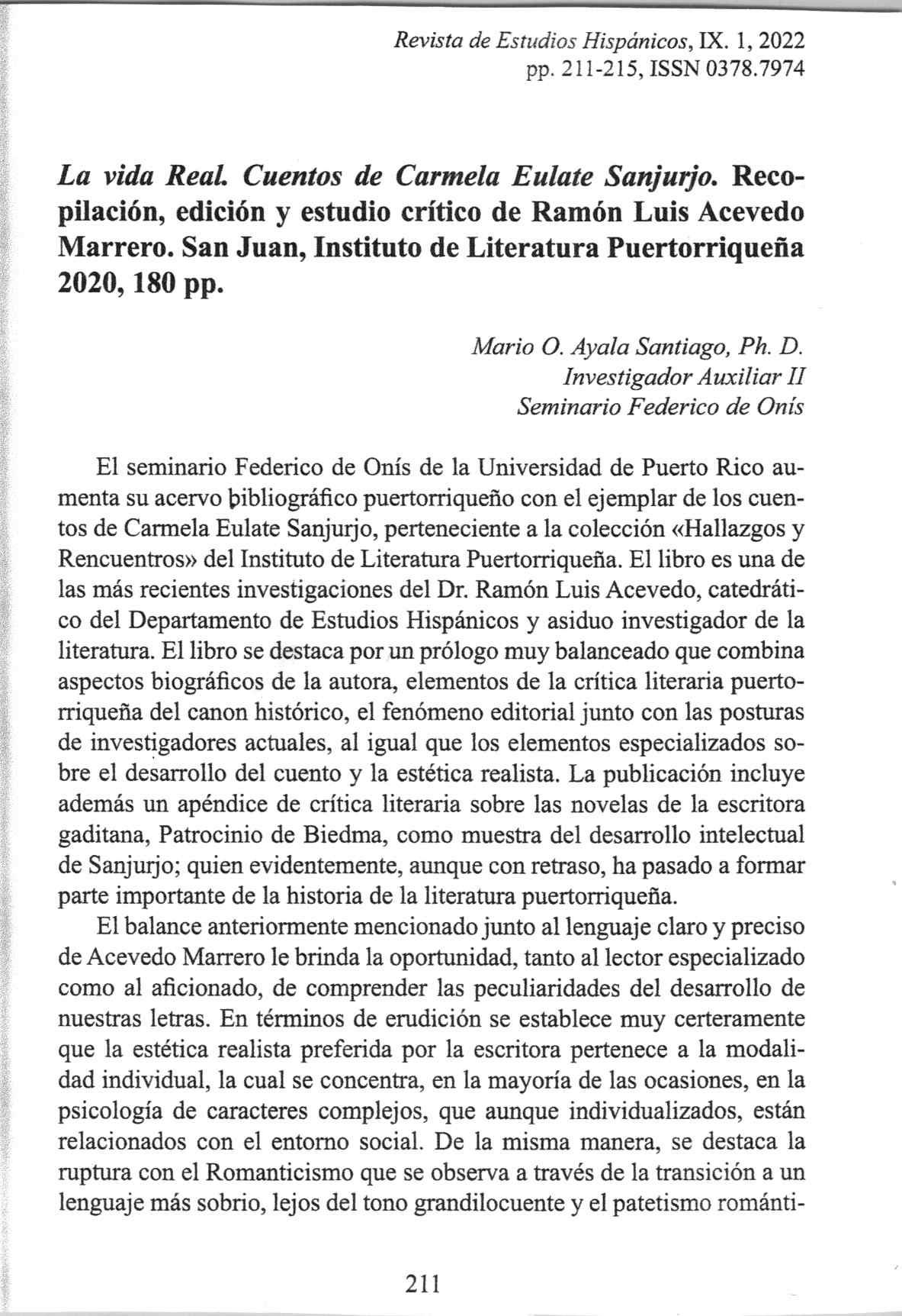 DOS RESEÑAS de la publicación LA VIDA RFEAL. CUENTOS de ARMELA EULATE SANJURJO. Recopilación y Estudio crítico de Ramón Luis Acevedo Marrero. San Juan, Instituto de Literatura Puertorriqueña. 2020, 180 p.