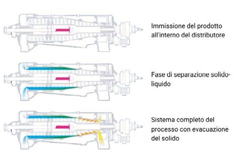 La separazione avviene nel tamburo, il quale ruota ad alta velocità moltiplicando migliaia di volte la forza di gravità. La coclea, che a sua volta ruota all’interno del tamburo, ha la funzione di trasportare all’esterno la sostanza solida che si deposita nelle pareti, mentre la fase liquida, essendo più leggera, confluisce nell’area di uscita del liquido. La separazione viene agevolata mediante un opportuno dosaggio di additivi a base organica.