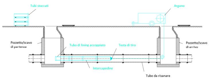 3. Ad Inserimento, che prevede l’inserimento dei tubi di lining, accoppiati tra loro, mediante un carrello retrattile che scorre dal punto di partenza (pozzo/scavo) fino a raggiungere il punto di destinazione.