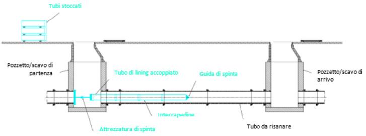 1. A spinta, che prevede l’inserimento dei tubi di lining, accoppiati tra loro, mediante un dispositivo di spinta idraulica posizionato nel punto di partenza (pozzo/scavo) fino a raggiungere il punto di destinazione;