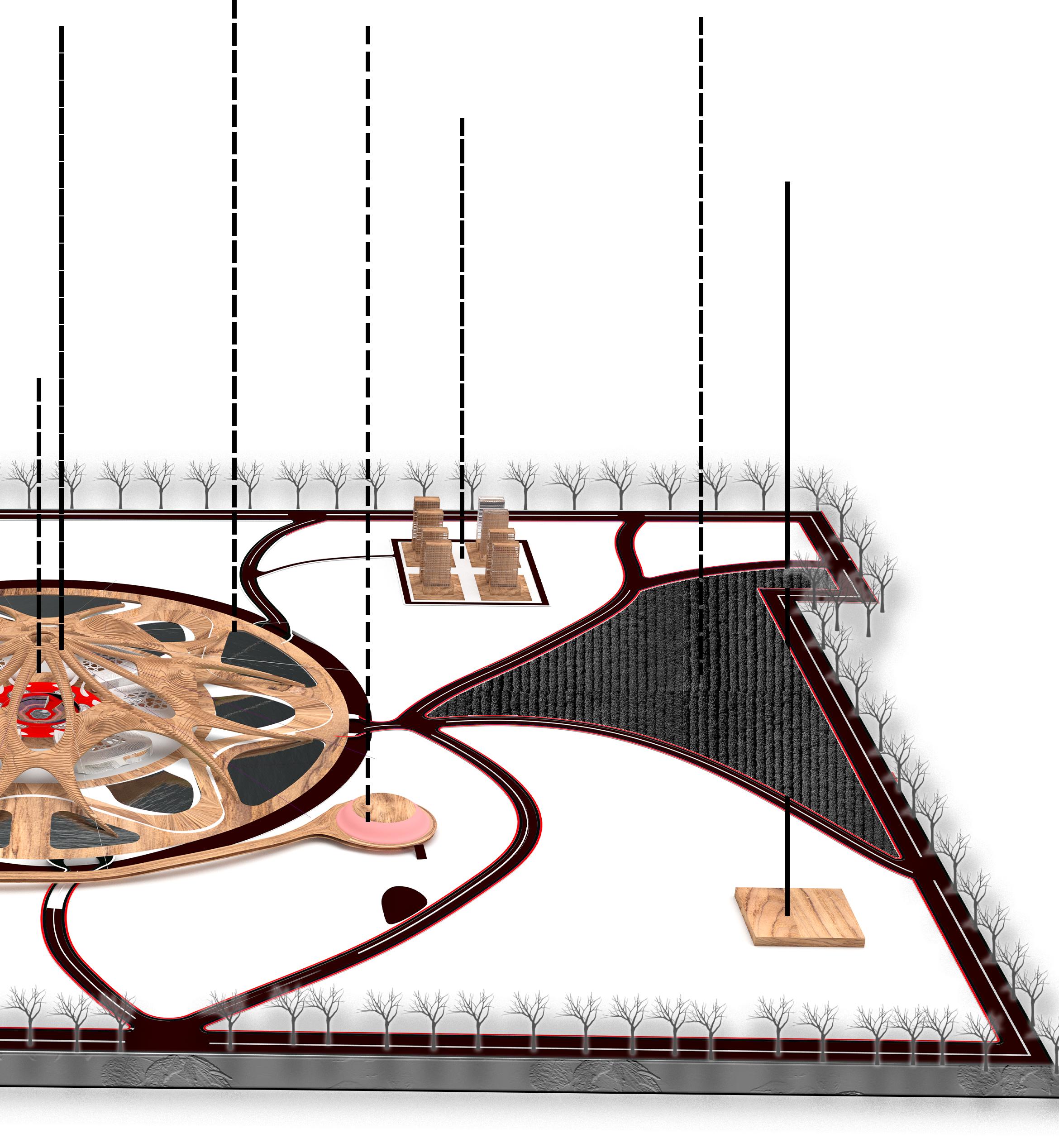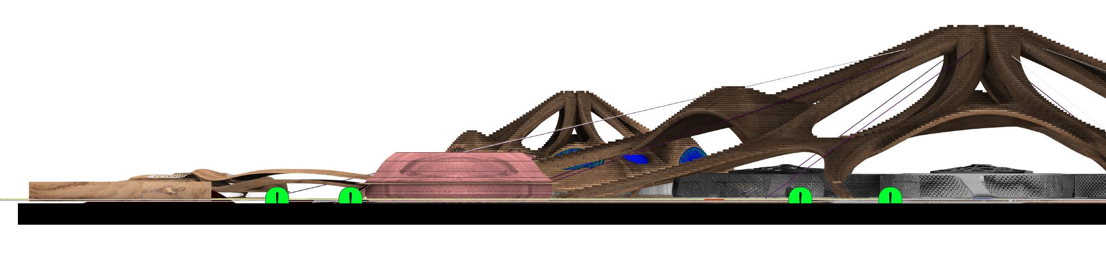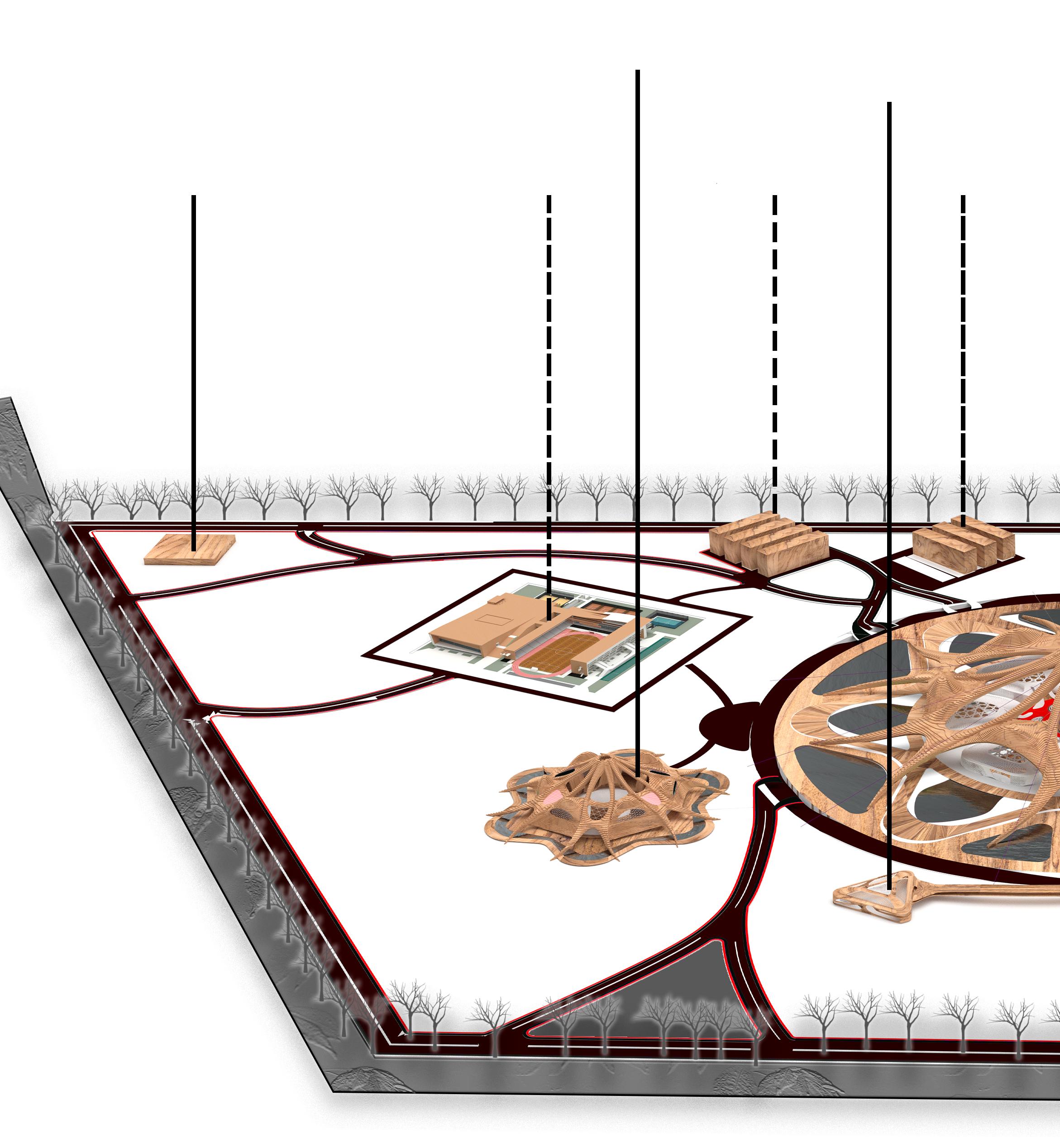 The above exploded anxiometric view shows the complex yet sustainable design approach , the divison show different strata starting from the top most canopy to the most bottom layer that includes cycle tracks, pedestrain movement, Landscaping.